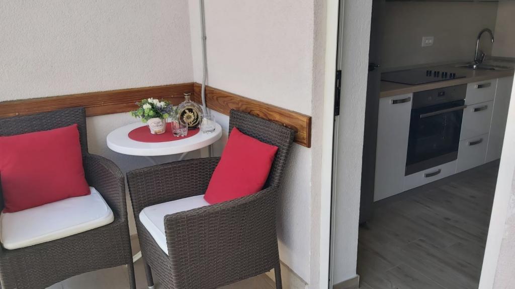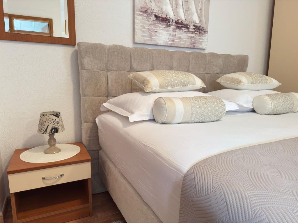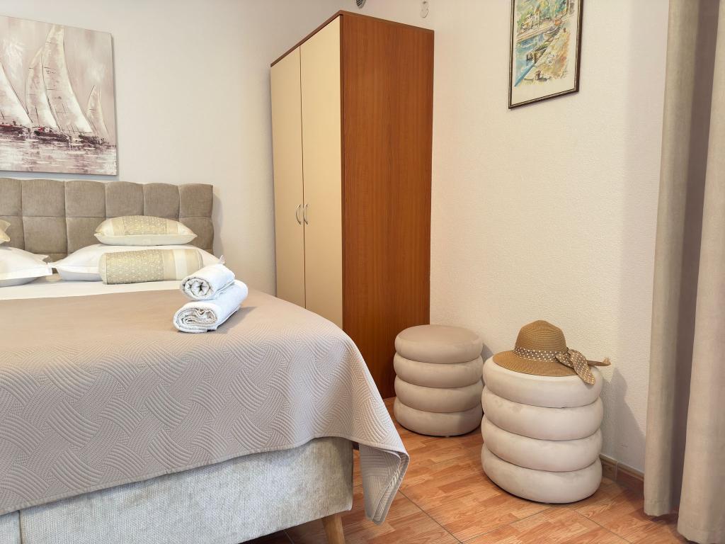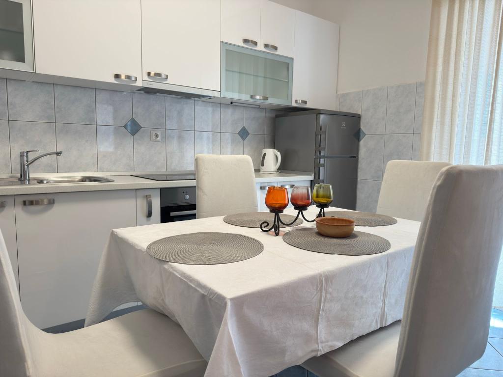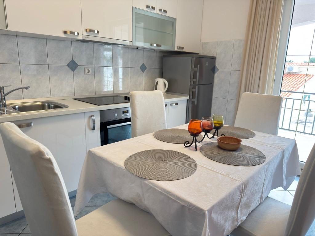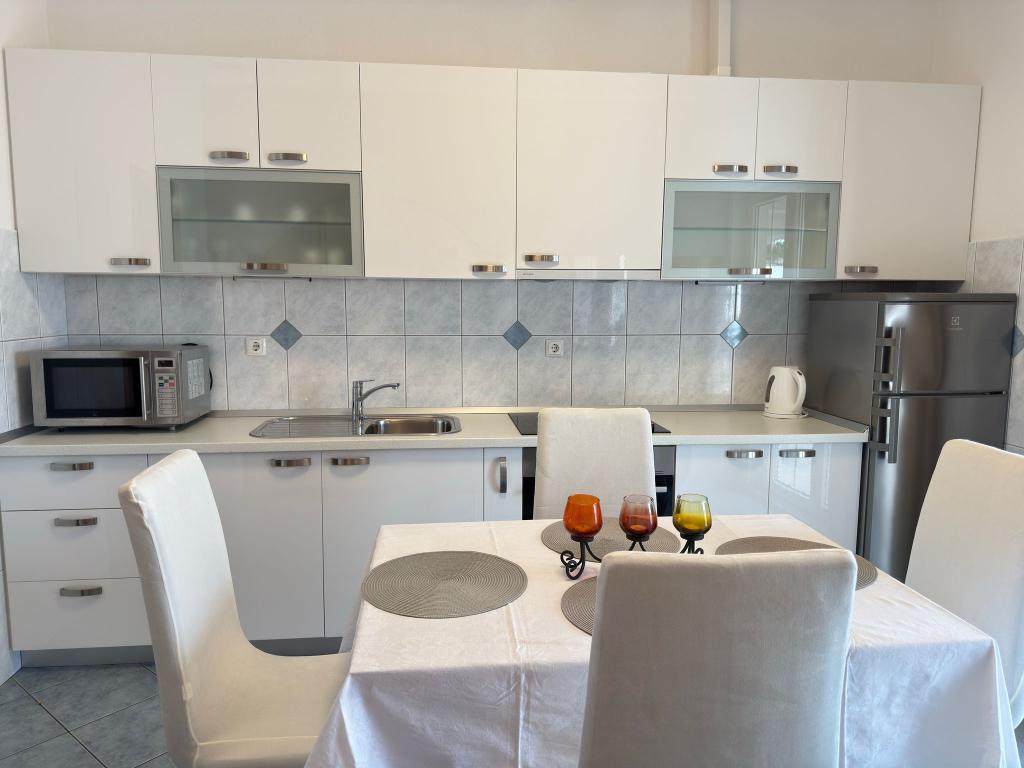 Bardzo fajny apartament z widokiem na morze. Duża kuchnia z wyposażeniem. Duży taras. Blisko do portu i plaży, 5 min spacerkiem. Obok lekarz, piekarnia i sklepik. Bardzo mili i pomocni właściciele. Wstsli do nas o 5 rano żeby się pożegnać. Apartament posiada miejsca parkingowe. Polecam
