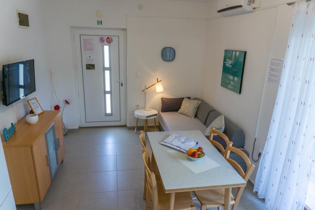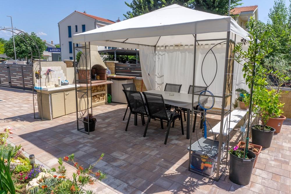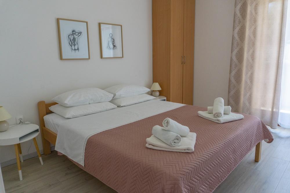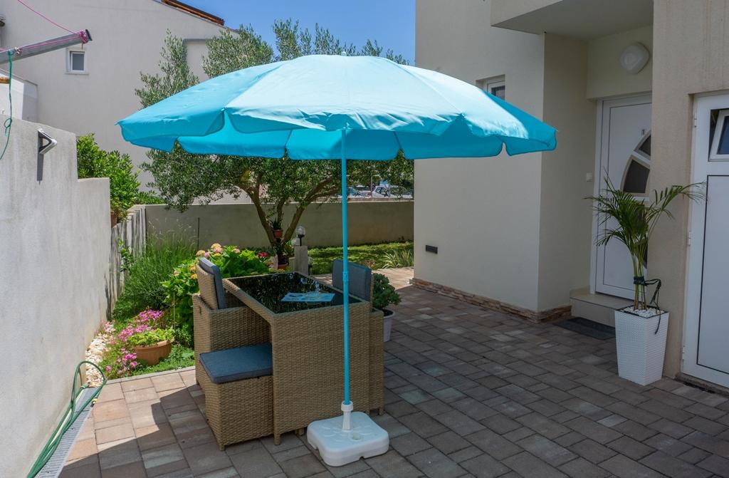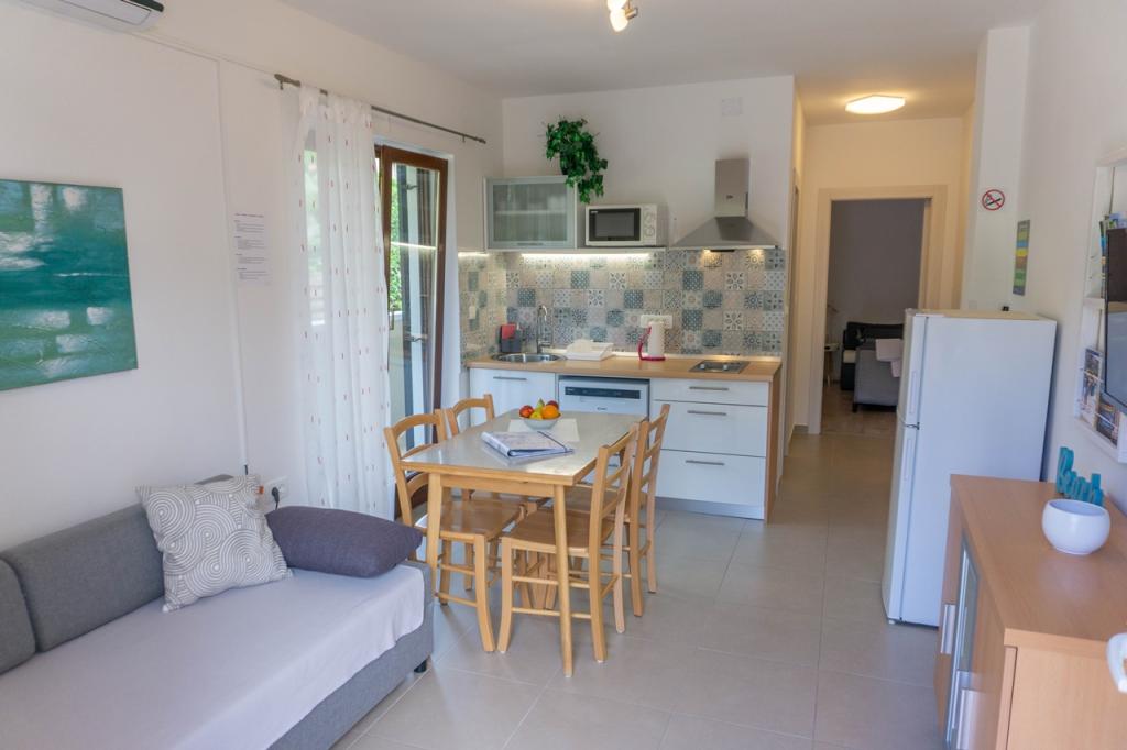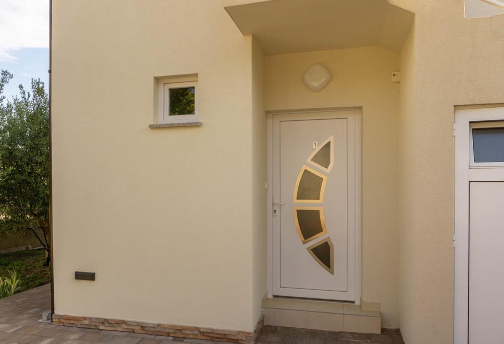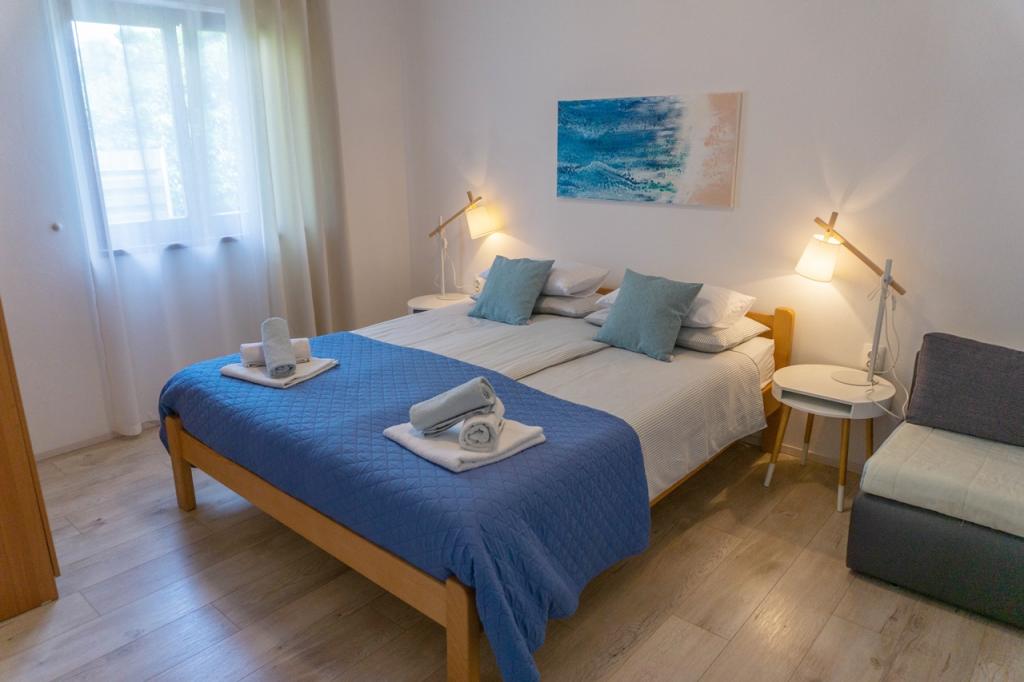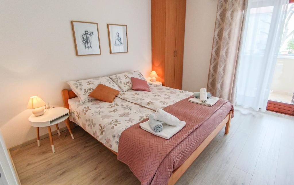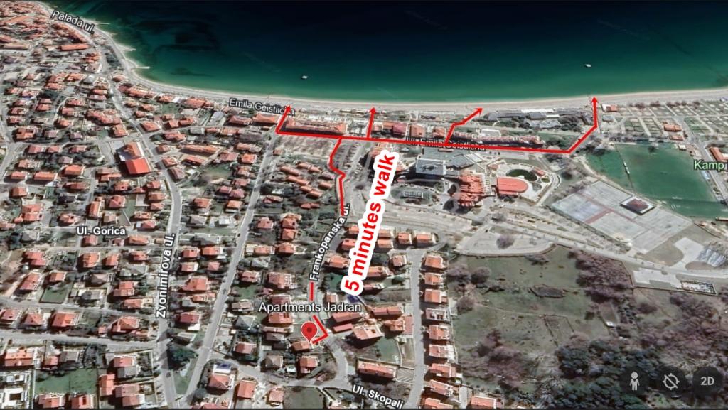 Apartamenty Jadran znajdują się w domu rodzinnym w spokojnej okolicy, zaledwie 300 m (ok. 5 minut spacerem) od morza i głównej plaży. Obiekt oferuje dwa nowoczesne apartamenty na parterze, a dla każdego z nich zapewniono jedno miejsce parkingowe na podwórku. Lokalizacja jest idealna dla miłośników przyrody (szlaki rowerowe i piesze) oraz osób pragnących zwiedzać dziedzictwo kulturowe i stanowiska archeologiczne. Apartament Jadran 1 (30 m² z tarasem): Składa się z sypialni z łóżkiem małżeńskim (160x200), łazienki z prysznicem i suszarką do włosów oraz salonu z aneksem kuchennym. W salonie znajduje się dostawka (85x200) dla dziecka do 12 lat. Apartament Jadran 2 (37 m² z tarasem): Składa się z sypialni z łóżkiem małżeńskim (160x200) i fotelem rozkładanym (80x200) dla dziecka do 10 lat, łazienki oraz salonu z kuchnią. W salonie znajduje się kanapa (90x200) dla osoby do 18 lat. Oba apartamenty są klimatyzowane, posiadają bezpłatne Wi-Fi oraz Smart TV z programami satelitarnymi.