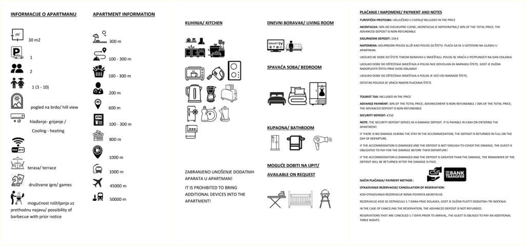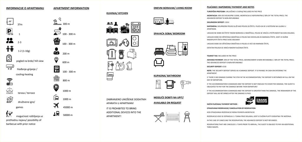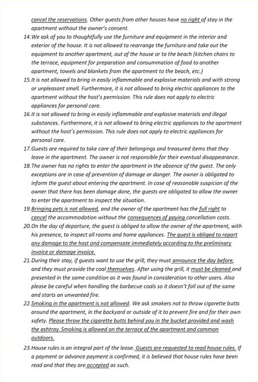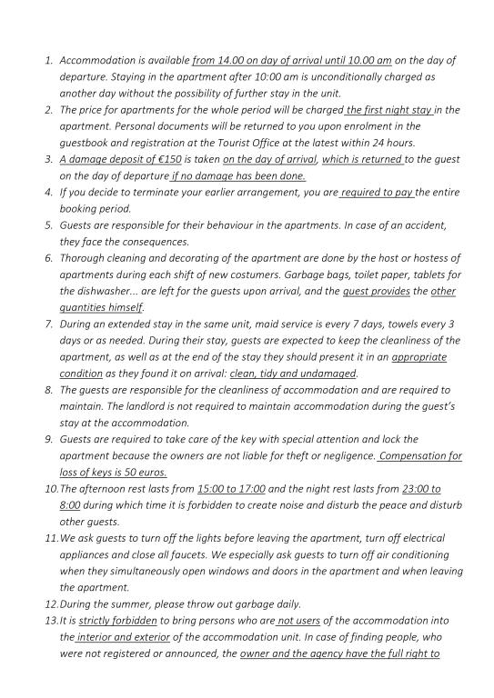 Opłata jest wliczone w cenę.Bezzwrotny zadatek: Wpłacony zadatek (30%) służy jako gwarancja rezerwacji i rekompensata w przypadku niepojawienia się gościa; nie podlega on zwrotowi. Wcześniejszy wyjazd (z woli gościa): Jeśli gość zdecyduje się dobrowolnie skrócić swój pobyt, zobowiązany jest do zapłaty pełnej kwoty rezerwacji. Szkody: Kaucja 150 € służy na pokrycie ewentualnych szkód. Jeśli wartość szkody przekracza kaucję, gość jest zobowiązany do natychmiastowego uregulowania różnicy. Naruszenie regulaminu: W przypadku naruszenia zasad domu, właściciel ma prawo anulować rezerwację. W takim przypadku gościowi przysługuje zwrot kwoty za dni od dnia następnego do końca planowanego pobytu.