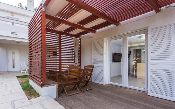 Doskonała lokalizacja w spokojnej części miejscowości. Do plaży bardzo blisko. Właściciel sympatyczny, przemiły bardzo gościnny . Mieszkania super wyposażone, czyste. Piękny taras w mieszkaniu obrośnięta dookoła zielenią stwarza idealne warunki do odpoczynku. Idealne miejsce!!!