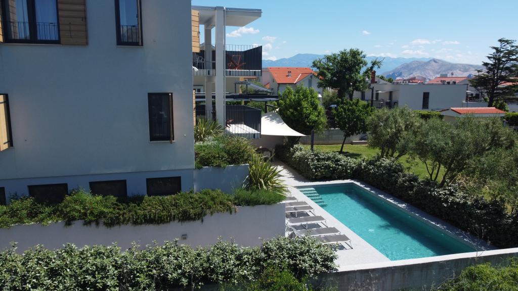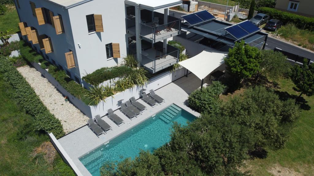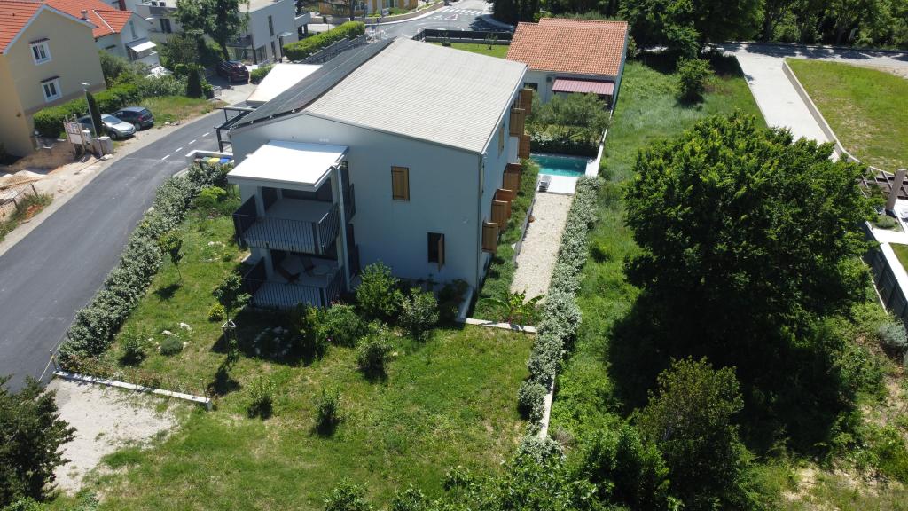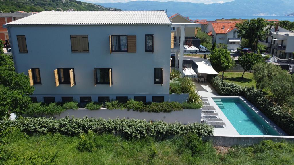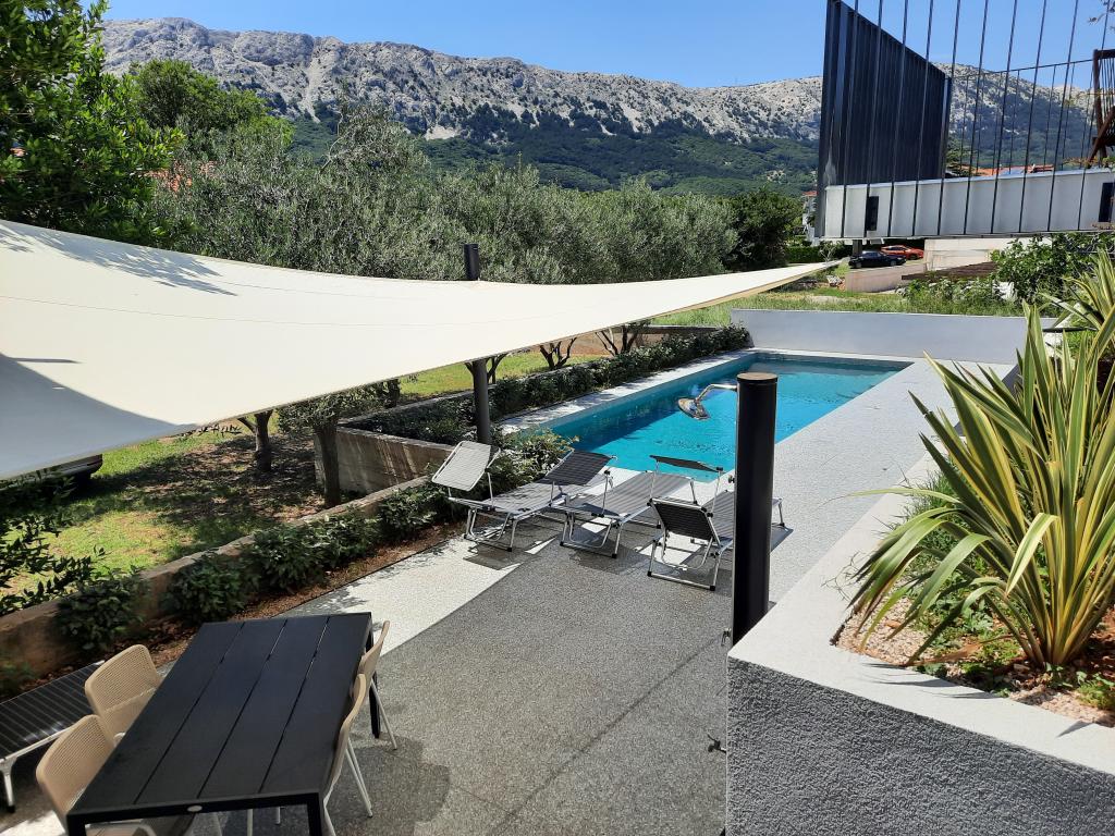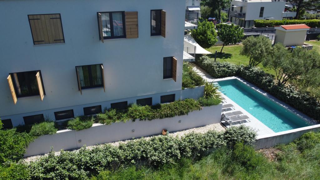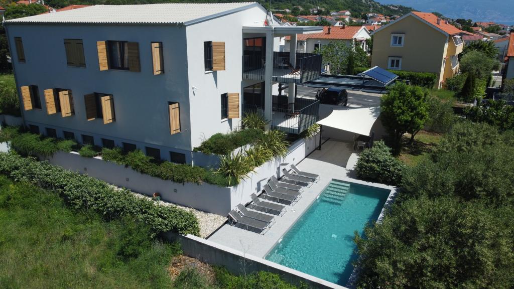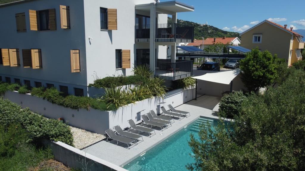 Nowocześnie urządzone iw pełni wyposażone apartamenty w nowym budynku z basenem. Przyjemna strefa relaksu wokół basenu. Dom położony jest w spokojnej okolicy w Bašce, 7 minut spacerem od placu Vela.