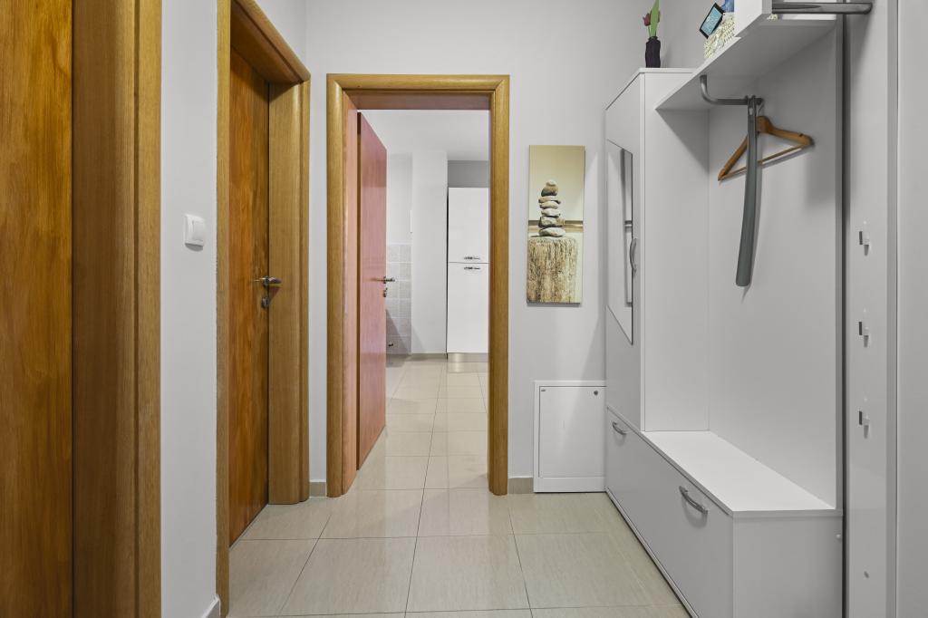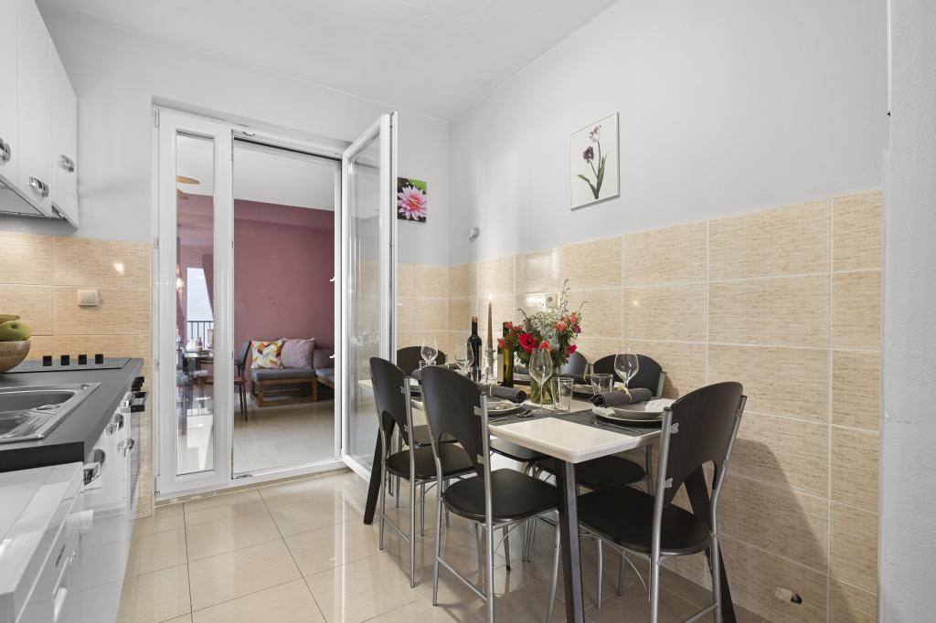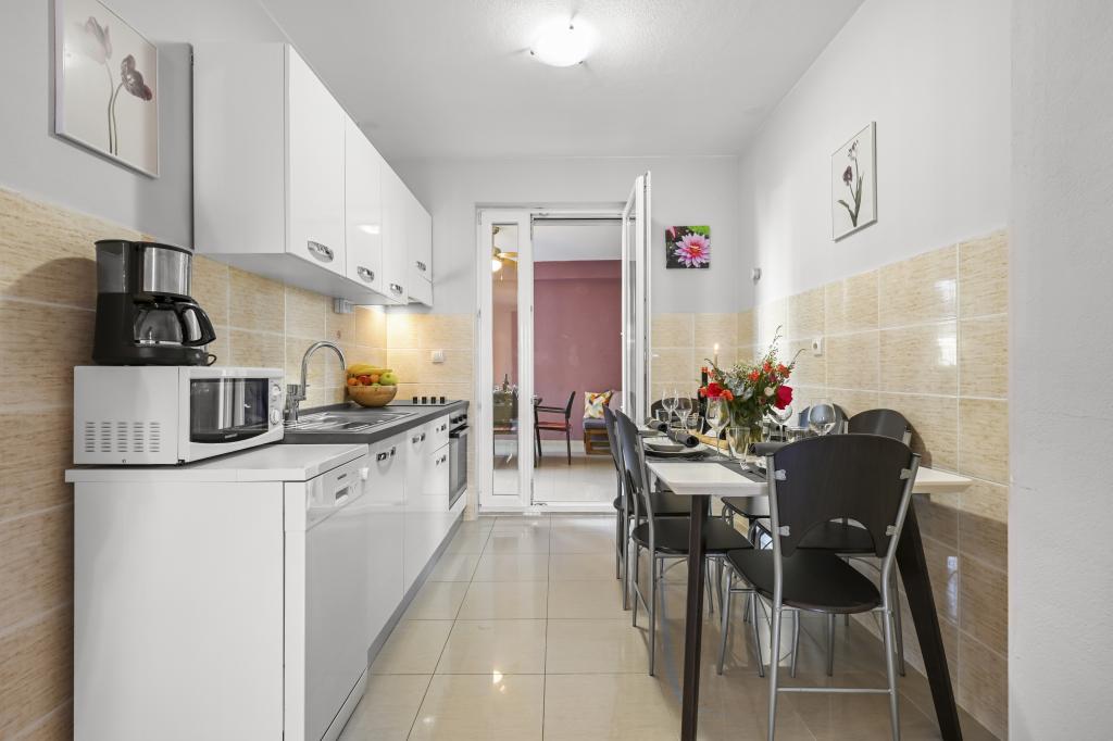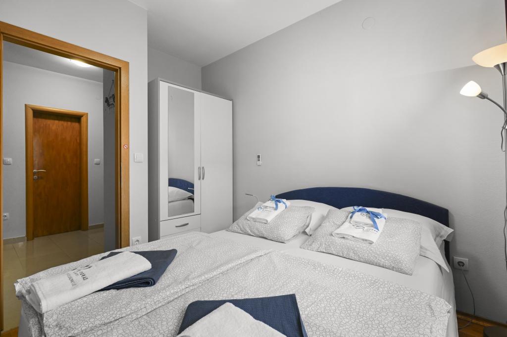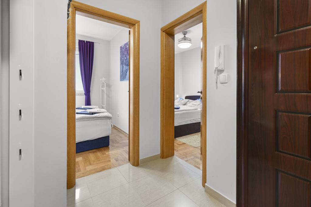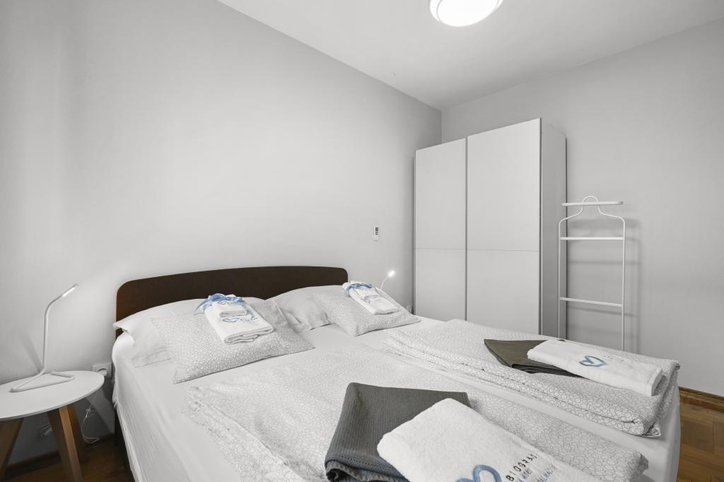 Apartament Majviva znajduje się w doskonałej lokalizacji w pięknym, małym, rodzinnym miasteczku Biograd na Moru. Jak sama nazwa wskazuje, z trzech stron otacza go morze i wspaniałe plaże. Apartament znajduje się w samym centrum, przy cichej uliczce, 150 m od plaży Dražice, wyróżnionej Błękitną Flagą za najpiękniejsze plaże Adriatyku. Apartament jest w pełni nowocześnie wyposażony i znajduje się na pierwszym piętrze niewielkiego budynku z zaledwie trzema apartamentami. Na dziedzińcu budynku znajduje się prywatny parking na jeden samochód oznaczony literą M (pierwsza litera nazwy apartamentu). Apartament posiada dwie sypialnie z podwójnymi łóżkami, salon z dużą, rozkładaną sofą narożną, która może służyć jako łóżko dla dwóch dodatkowych osób, dwie łazienki (jedna z wanną, druga z prysznicem), w pełni wyposażoną kuchnię (duża lodówka z zamrażarką, zmywarka, ekspres do kawy, czajnik, piekarnik itp.) oraz duży zadaszony taras. Idealna lokalizacja apartamentu zapewnia pełen relaks, ponieważ nie trzeba korzystać z samochodu przez cały pobyt.