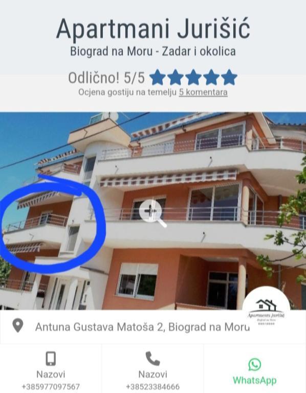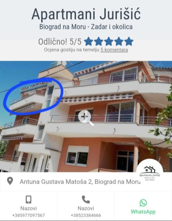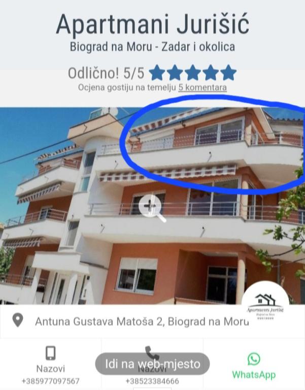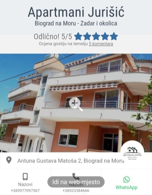 Jesteśmy rodziną Jurišić, która ma długą, ponad 40-letnią tradycję turystyczną. Nasze dwa domy znajdują się w spokojnej części centrum miasta Biograd na Moru (w pobliżu hotelu „Ilirija”), zaledwie 50 metrów od morza, promenady, nabrzeża i innych udogodnień... restauracji, sklepów, poczty... Wszystkie apartamenty są klimatyzowane (w każdym pokoju i salonie znajduje się klimatyzacja), w oknach znajdują się moskitiery, a każdy apartament ma własny balkon, bezpieczny parking, Wi-Fi i grill do użytku. Ceny (według dat) podane są w cenniku każdego apartamentu (dostawka - sofa dla dodatkowych 2 osób/dzieci jest płatna +10 euro/noc).