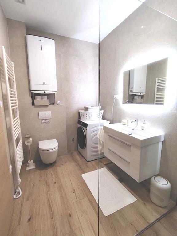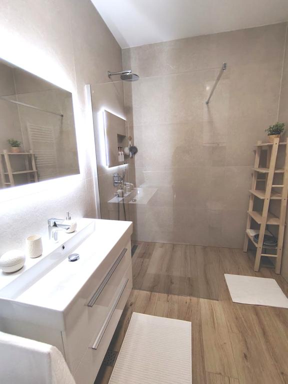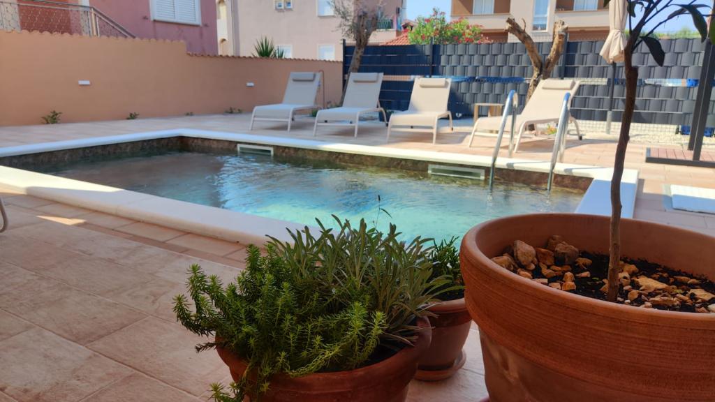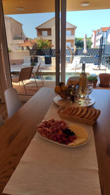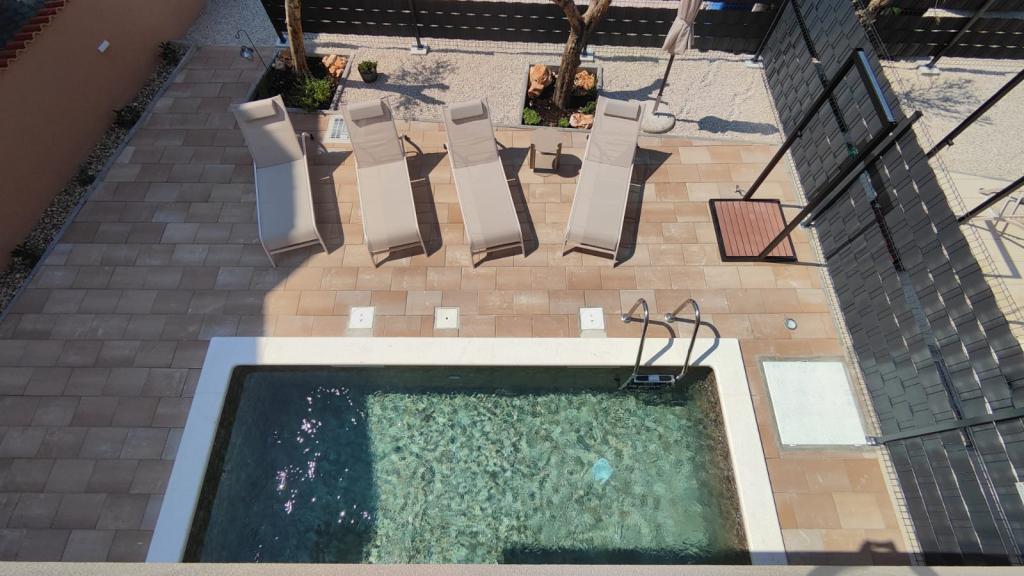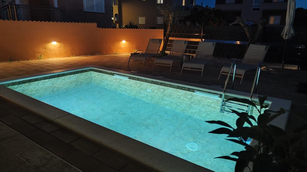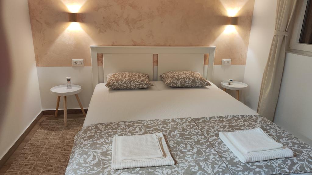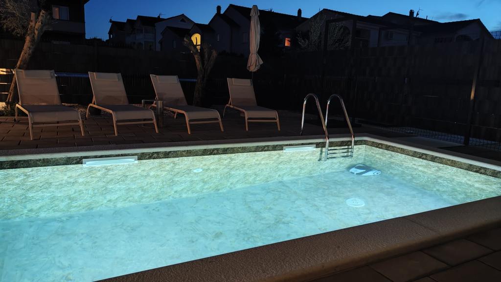 Nowo wybudowany, dwupiętrowy dom wakacyjny z basenem i dwoma oddzielnymi lokalami mieszkalnymi (parter i piętro). Każdy lokal mieszkalny o powierzchni 90 metrów kwadratowych składa się z 3 sypialni, kuchni, łazienki, tarasu i salonu. Do dyspozycji gości jest parking.