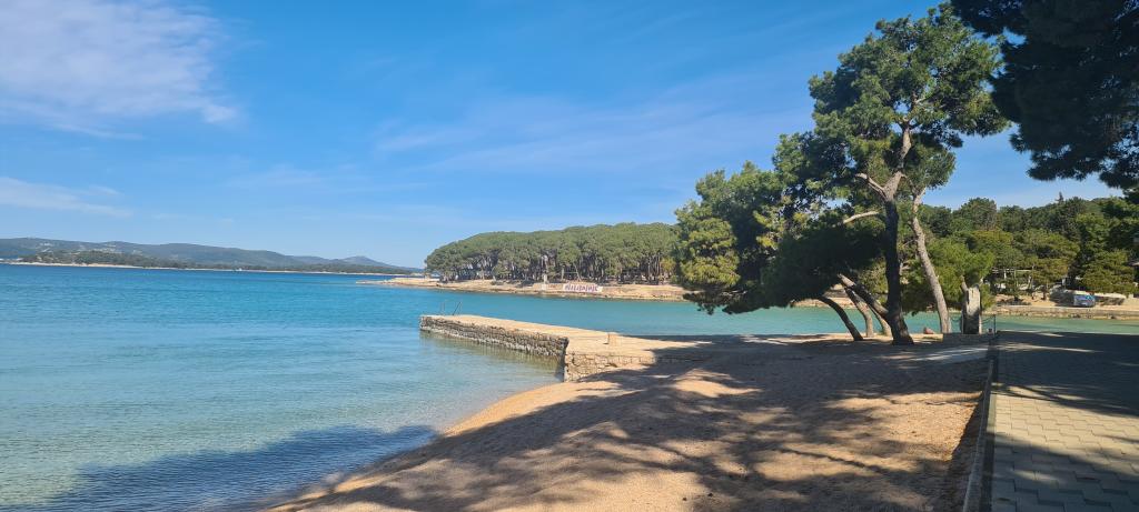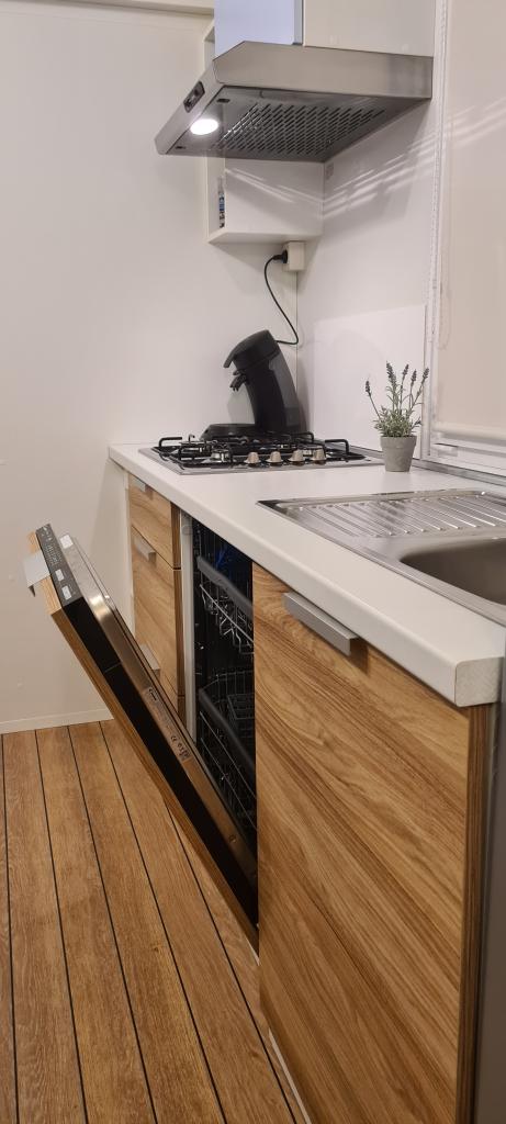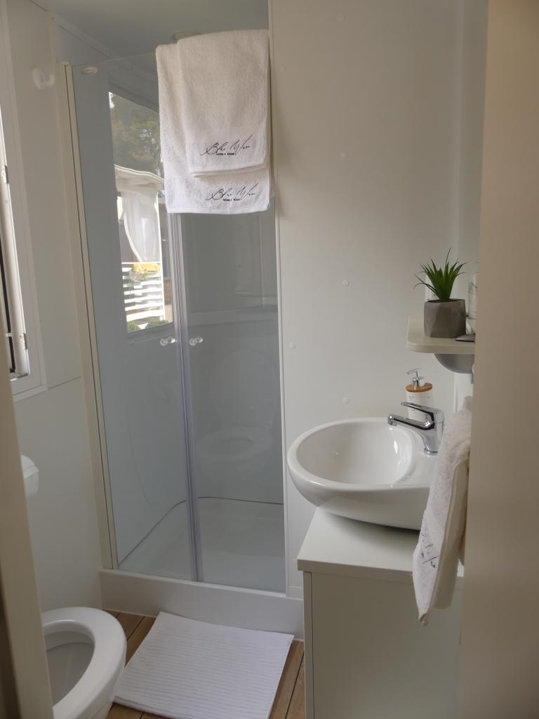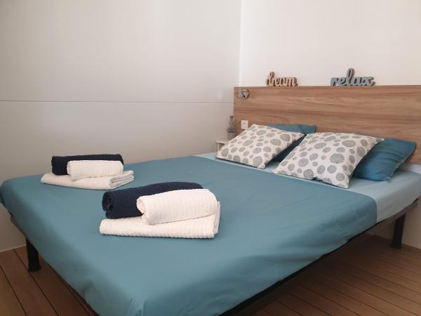 Blue Wave to nowy, nowoczesny i w pełni wyposażony dom mobilny z dwiema sypialniami (jedna z łóżkiem podwójnym, druga z dwoma pojedynczymi łóżkami), garderobami, dwiema łazienkami z prysznicem, salonem z dodatkowym rozkładanym łóżkiem (135x180cm), w pełni wyposażoną kuchnią z klimatyzacją i dużym tarasem. Taras wyposażony jest w stół jadalny, grill elektryczny i dwa wygodne leżaki. Na terenie całego obiektu można bezpłatnie korzystać z bezprzewodowego dostępu do Internetu. Blue Wave położony jest w spokojnym lesie sosnowym na terenie kempingu Soline w Biogradzie na moru. Obiekt oddalony jest o 2-3 minuty spacerem od plaży, kawiarni i restauracji. Na terenie obozu znajdują się pralki i suszarki, bankomat, sklep, piekarnia, plac zabaw dla dzieci i wszystko, czego potrzebujesz do przyjemnego pobytu! W bezpośrednim sąsiedztwie kempingu, około 10 minut spacerem nowo odnowioną promenadą wzdłuż morza, znajduje się centrum Biogradu z różnymi udogodnieniami, a także mariną Kornati. Niedaleko znajduje się także park wodny Dalmaland Fun & Water Park, w którym można świetnie się bawić.
