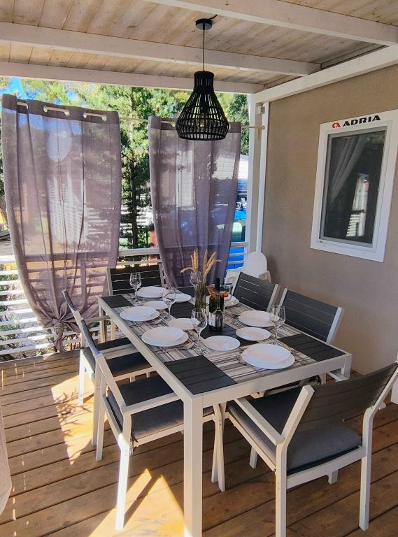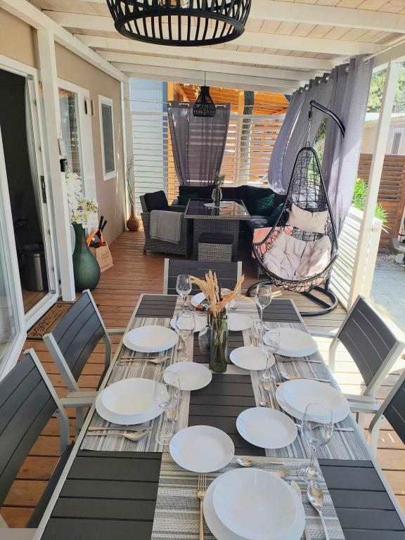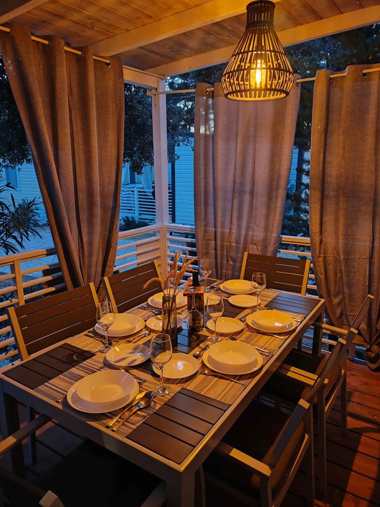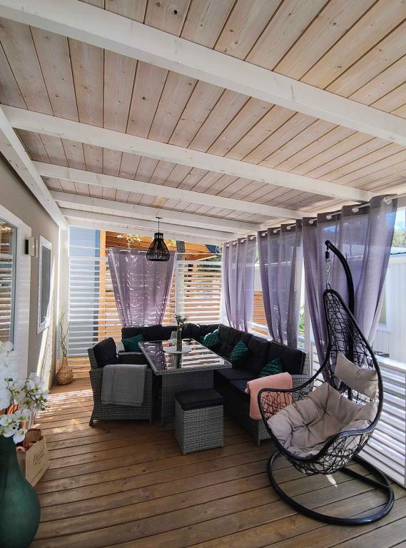 Nasz nowocześnie wyposażony dom mobilny oferuje komfortowe zakwaterowanie dla maksymalnie 7 osób, z 2 przestronnymi sypialniami, salonem z rozkładaną sofą i 2 łazienkami. Do dyspozycji Gości jest duży zadaszony taras z jadalnią i częścią wypoczynkową na świeżym powietrzu, idealny na długie wieczorne spotkania przy grillu gazowym i kuchence. Zadaszony taras otoczony jest sosnami i wieje w nim delikatna bryza znad morza. Po jednej stronie tarasu znajduje się przestronna jadalnia, a po drugiej stronie nasz zewnętrzny salon oferuje wygodne miejsce do siedzenia, a także huśtawkę z funkcją „jajka” dla pełnej relaksu. Na otwartej przestrzeni można również cieszyć się słońcem lub cieniem, na dużym, wygodnym leżaku z małym stolikiem, gdzie można delektować się koktajlami, zimnymi napojami lub poczytać książkę. Dom znajduje się 3 minuty od pięknej plaży.