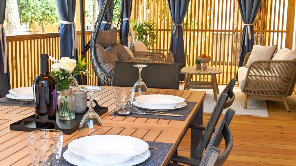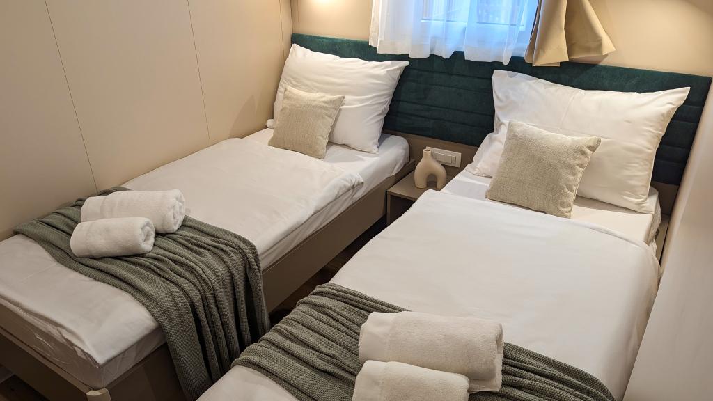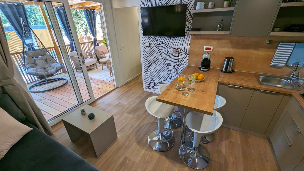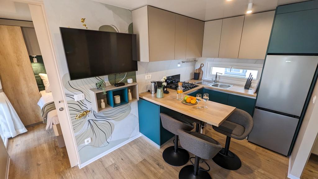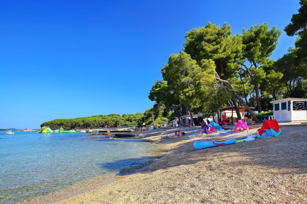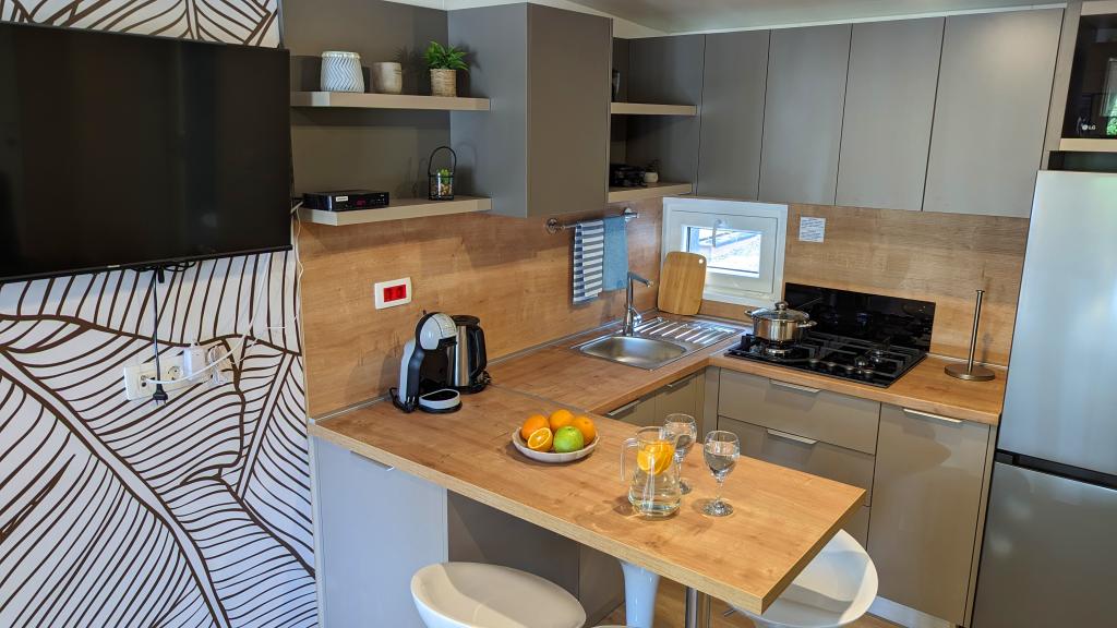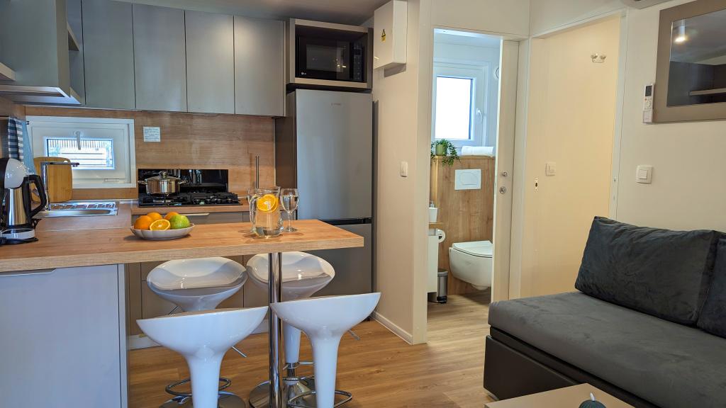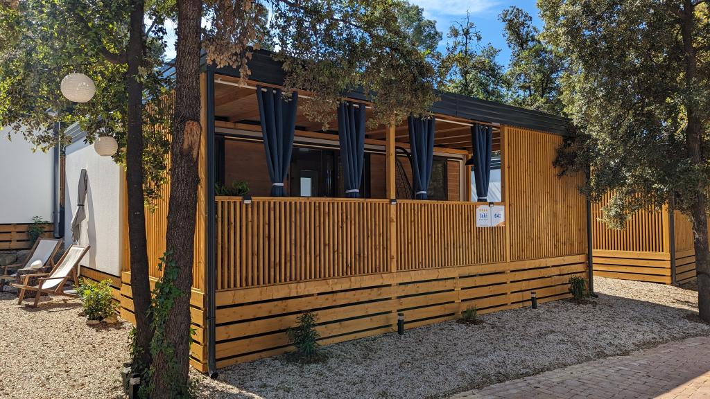 Ciesz się naturą i komfortem: domki mobilne Jaki na kempingu Soline w Biogradzie na Moru. Nasze nowocześnie wyposażone domki mobilne położone są w spokojnej części 4-gwiazdkowego kempingu, pośród lasów sosnowych i idealnie nadają się dla maksymalnie 6 osób. Ciesz się bliskością plaży (2-5 minut spacerem), sklepów i restauracji oraz promenady prowadzącej do centrum miasta (15 minut). Domki te oferują 2 sypialnie i 2 łazienki, salon, duży taras ze stołem jadalnym i częścią wypoczynkową, a także w pełni wyposażoną kuchnię ze zmywarką, kuchenką mikrofalową, ekspresem do kawy, tosterem, blenderem i grillem zewnętrznym. W domu dostępne jest także bezpłatne WiFi, bezpłatny parking tuż obok domu, telewizor Smart TV, klimatyzacja, ręczniki i pościel. Kemping oferuje wiele udogodnień dla całej rodziny: piękne piaszczyste i kamieniste plaże, które rozciągają się aż do centrum miasta, restaurację serwującą specjały kuchni śródziemnomorskiej, plac zabaw dla dzieci, zajęcia sportowe i wypożyczalnię rowerów. Dalmaland, największy park wodny w Chorwacji, oddalony jest o 15 minut jazdy samochodem.