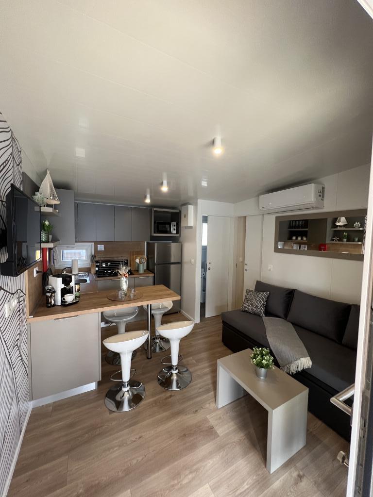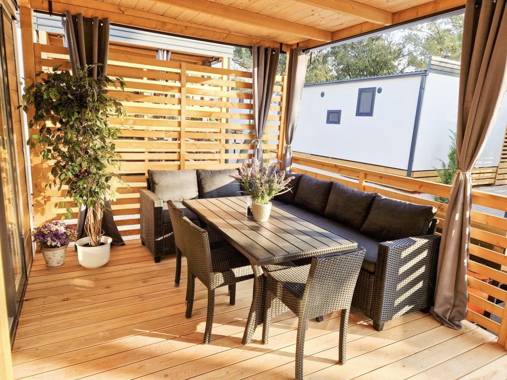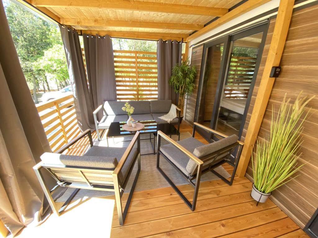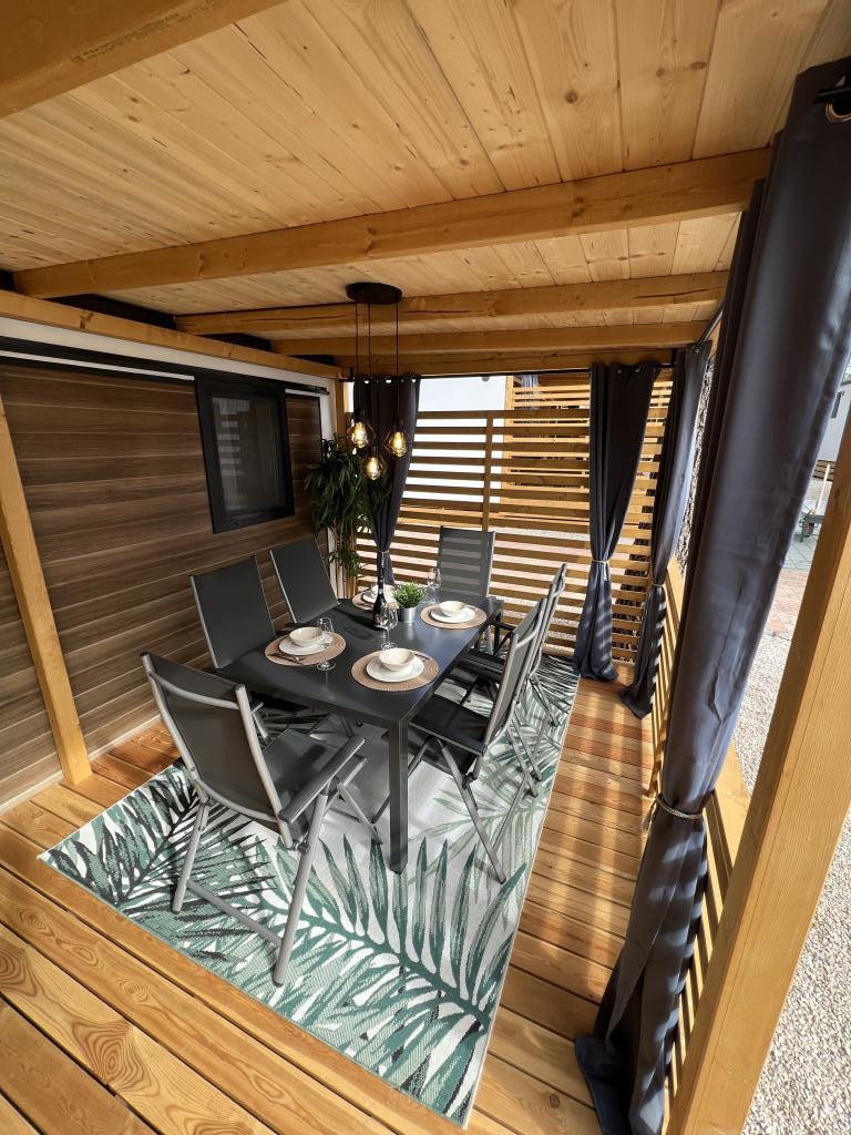 Zawartość domku mobilnego Domek mobilny zawiera: • 2 sypialnie • Salon z dodatkowym łóżkiem dla 2 osób • W pełni wyposażona kuchnia • Jadalnia • Łazienka • Duży zadaszony taras ok. 30 m² Wyposażenie • Klimatyzacja • Bezpłatny internet WiFi • Smart TV z kanałami satelitarnymi • Ekspres do kawy • Czajnik elektryczny • Toster • Mikrofalówka • Pełne wyposażenie kuchni • Grill • Suszarka do włosów • Pościel wliczona w cenę • Ręczniki wliczone w cenę Idealny dla rodzin Domek mobilny jest szczególnie odpowiedni dla rodzin z dziećmi. Dostępne są: • Łóżeczko dziecięce • Krzesełko do karmienia Zalety zakwaterowania Domek mobilny Biograd na Moru – Camping Park Soline Tylko 350 m od plaży Naturalny cień sosen Spokojna lokalizacja Duży taras Blisko morza Promenada wzdłuż morza do centrum Restauracje i sklepy na terenie kempingu Idealny dla rodzin