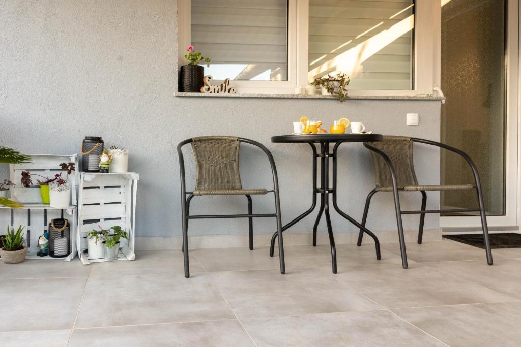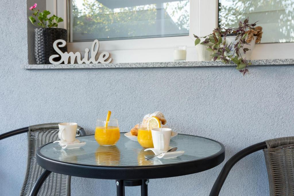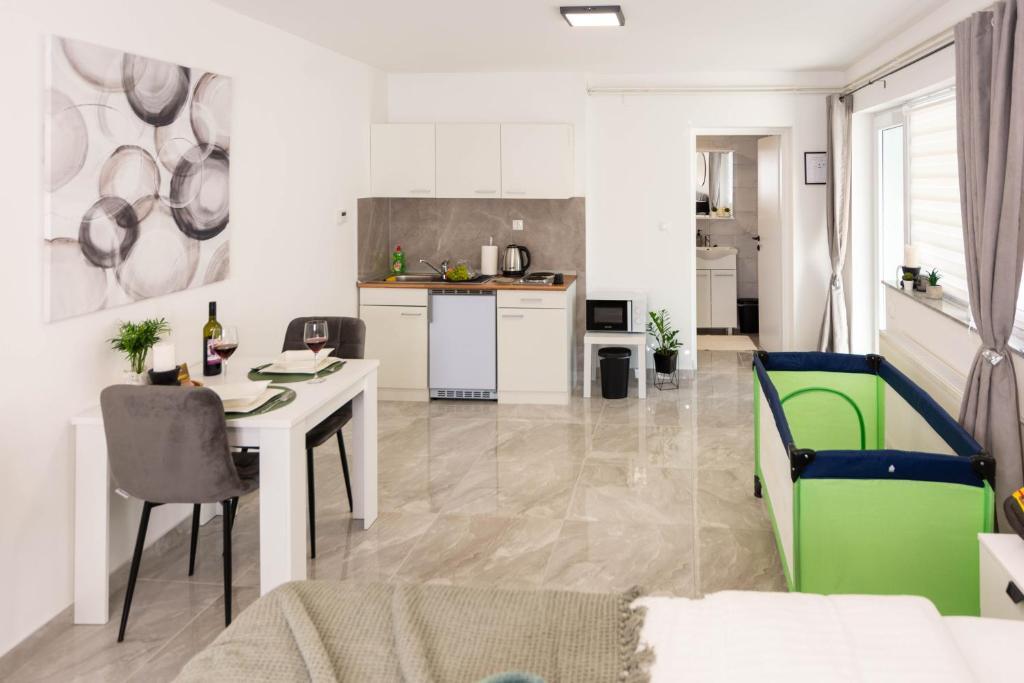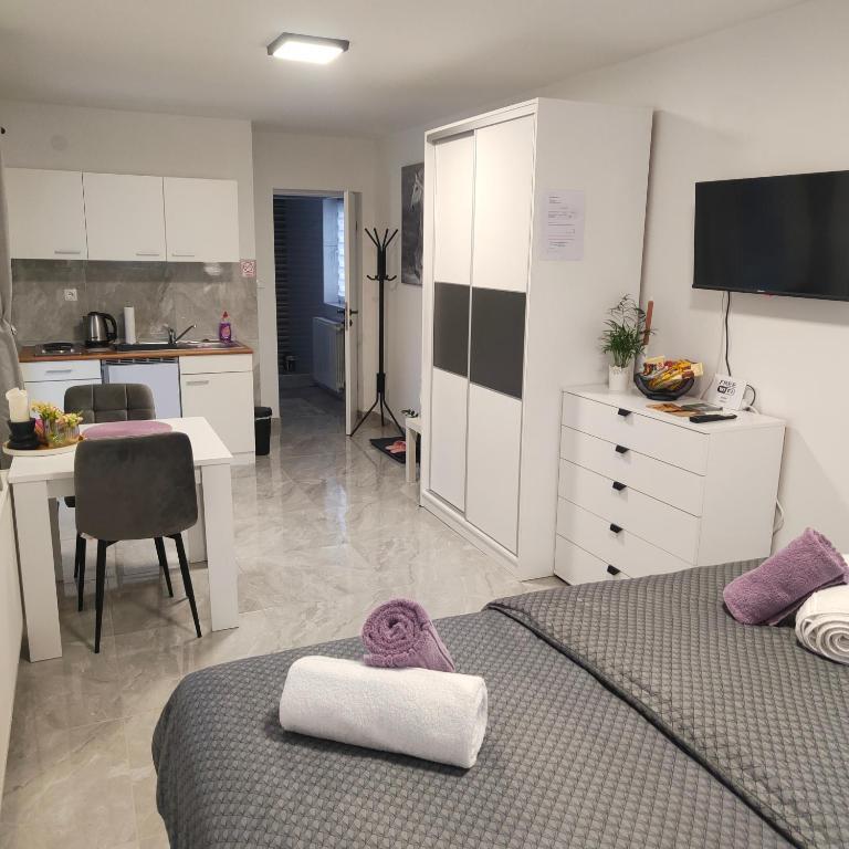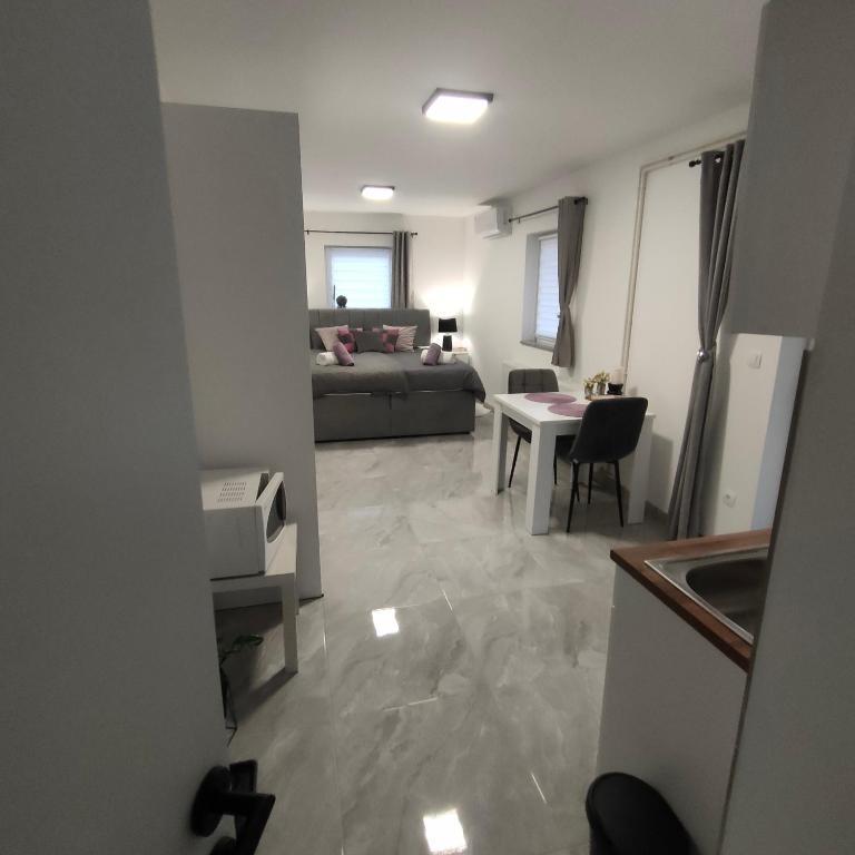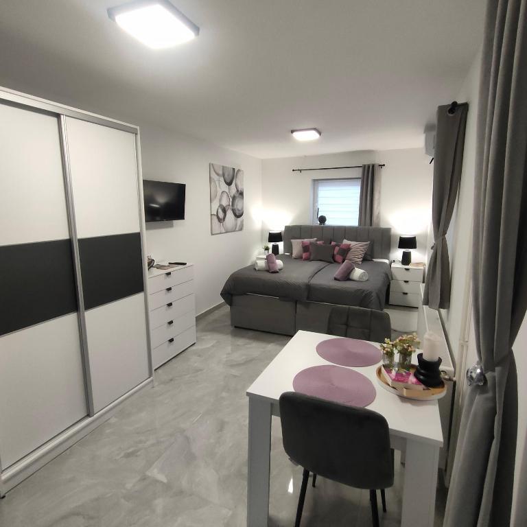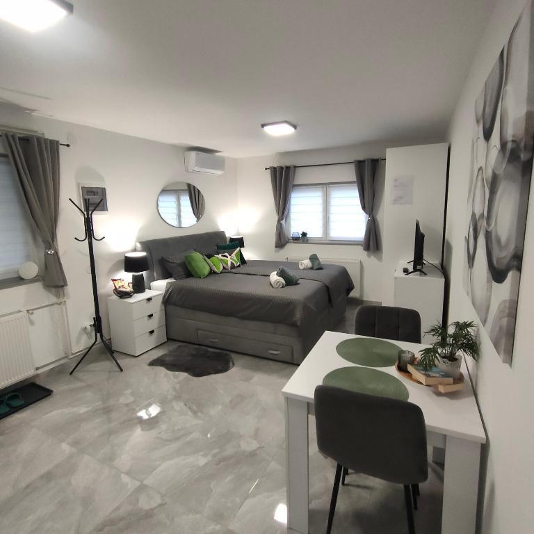 Dom składa się z dwóch apartamentów typu studio. Każdy apartament typu studio składa się z 1 sypialni z w pełni wyposażoną kuchnią, 1 łazienki, pościeli, ręczników, mydeł, żeli pod prysznic, szamponów, telewizora z płaskim ekranem, wspólnego tarasu do picia kawy i dużego ogrodu. Mieszkanie położone jest w spokojnej uliczce oddalonej o ok. 500 m od centrum miasta i jest wkomponowane w działkę. Dziedziniec i duży ogród oddzielają apartament od drogi, co pozwala na spokojny pobyt w apartamencie i na tarasie. Na podwórzu znajduje się parking dla samochodów osobowych.