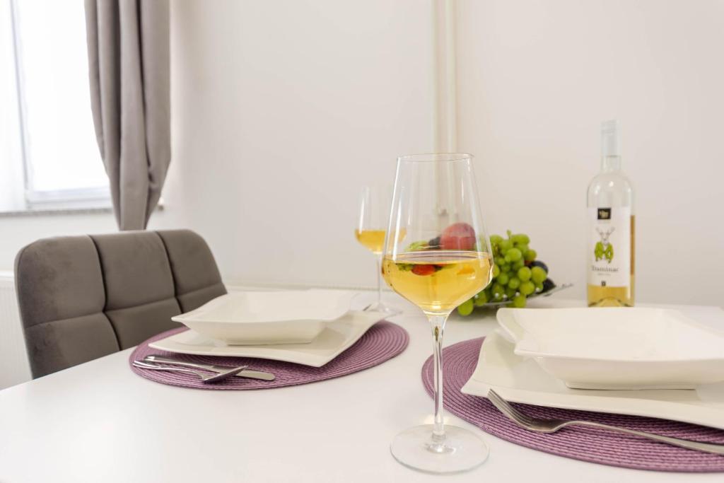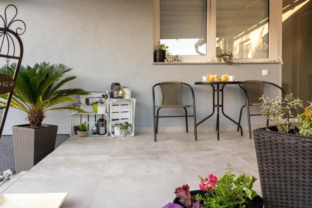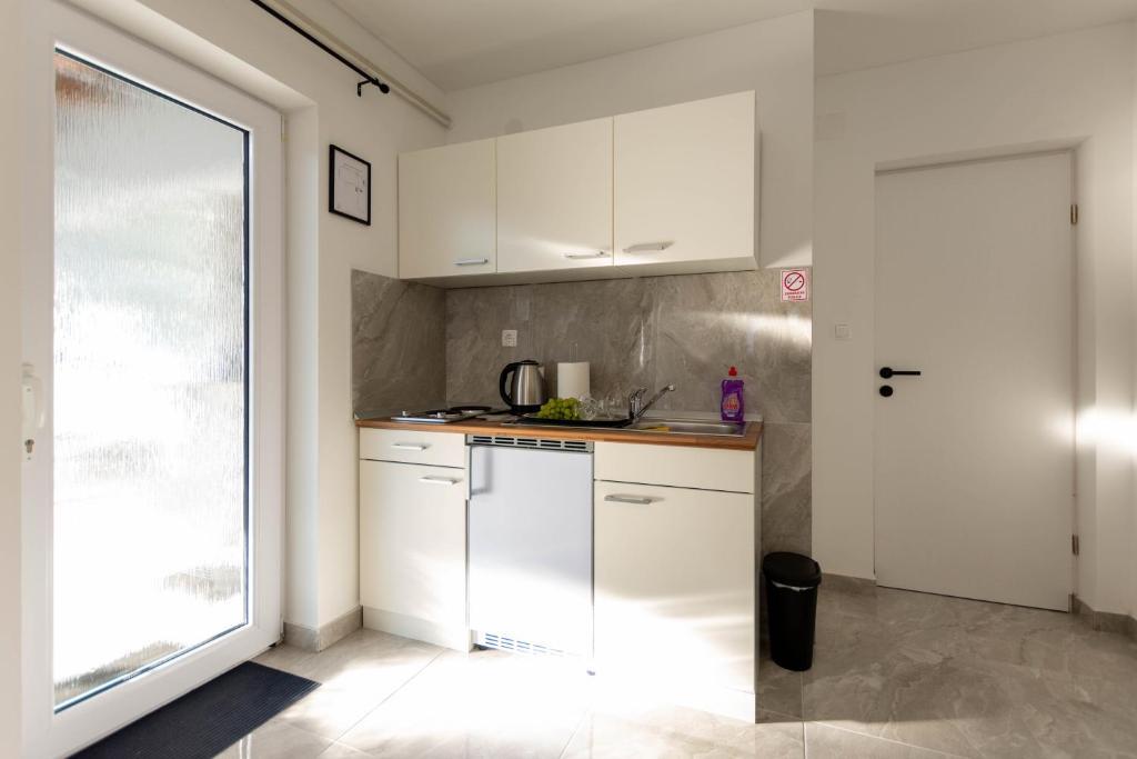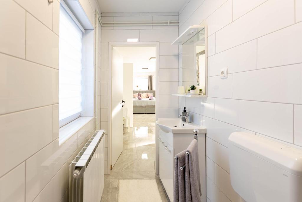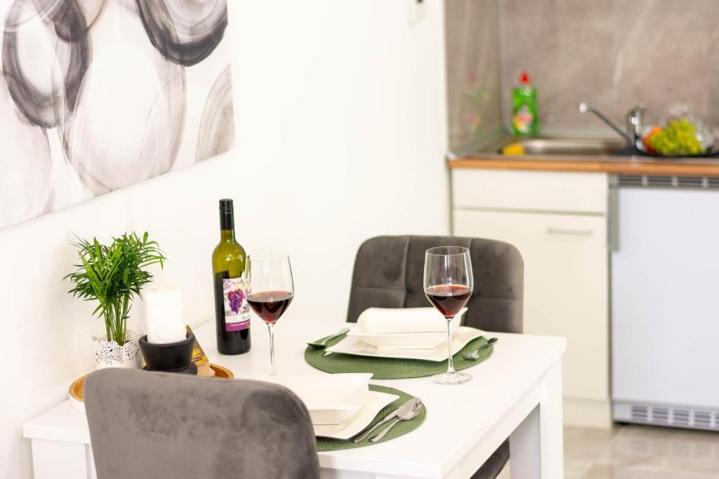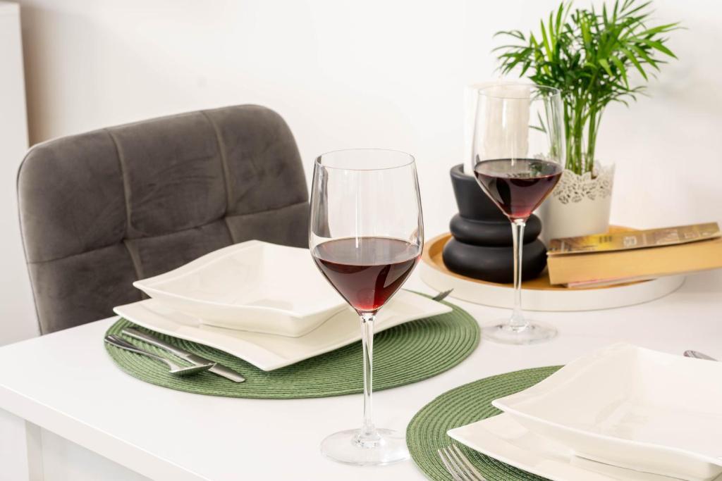 Dom składa się z dwóch apartamentów typu studio. Każdy apartament typu studio składa się z 1 sypialni z w pełni wyposażoną kuchnią, 1 łazienki, pościeli, ręczników, mydeł, żeli pod prysznic, szamponów, telewizora z płaskim ekranem, wspólnego tarasu do picia kawy i dużego ogrodu. Mieszkanie położone jest w spokojnej uliczce oddalonej o ok. 500 m od centrum miasta i jest wkomponowane w działkę. Dziedziniec i duży ogród oddzielają apartament od drogi, co pozwala na spokojny pobyt w apartamencie i na tarasie. Na podwórzu znajduje się parking dla samochodów osobowych.