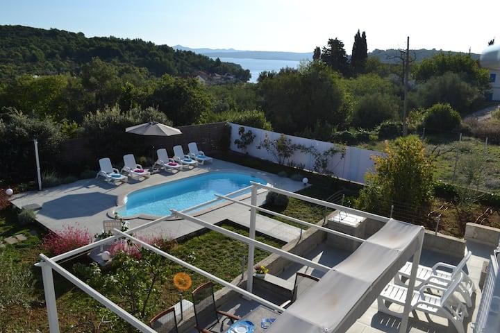 Byliśmy we 2 rodziny (łącznie 8 osbó). Dom wspaniale usytuowany z widokiem na morze. Pokoje bardzo czyste, posprzątane. Gospodyni ( Branka) stanęła na wysokości zadania. Cały czas przed rezerwacją kontaktowała się ze mną, pomagała nam zorganizować dojazd na wyspę. Przekazała nam cenne wskazówki co należy zwiedzić na wyspie, które plaże są najpiękniejsze, gdzie można smacznie zjeść. Przekazała kontakt do osób, które we wsi produkują sery, oliwy. Spróbowaliśmy - były przepyszne! W basenie ciepła, krystalicznie czyta woda. Ogródek przydomowy z owocami: pomarańcze, granaty, figi. Domek w bardzo kameralnej miejscowości. Byliśmy jedynymi turystami we wsi. Wrócimy tam w następnym roku! Domek warty swojej ceny! Polecamy!