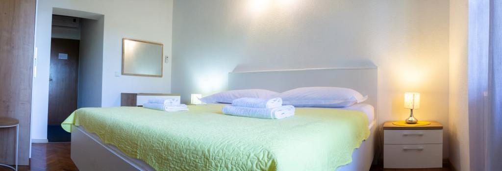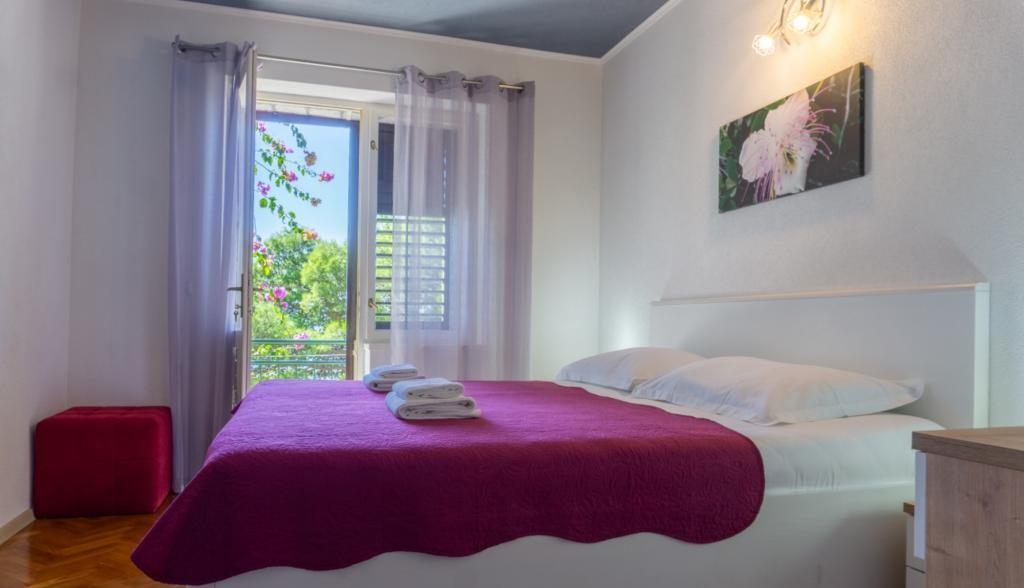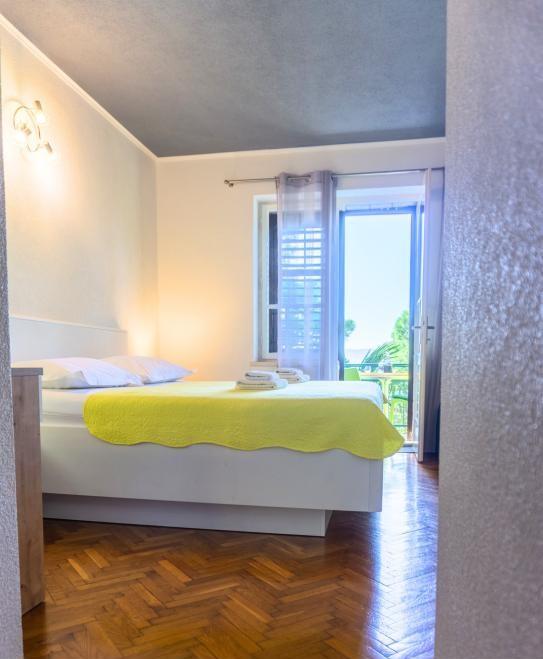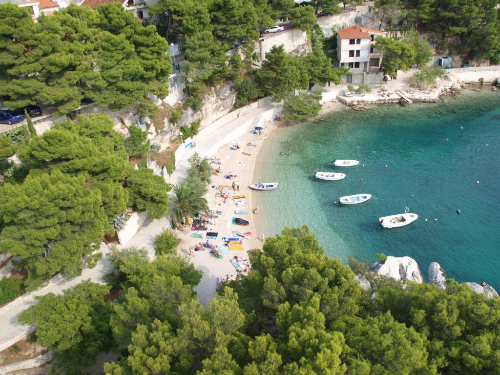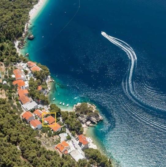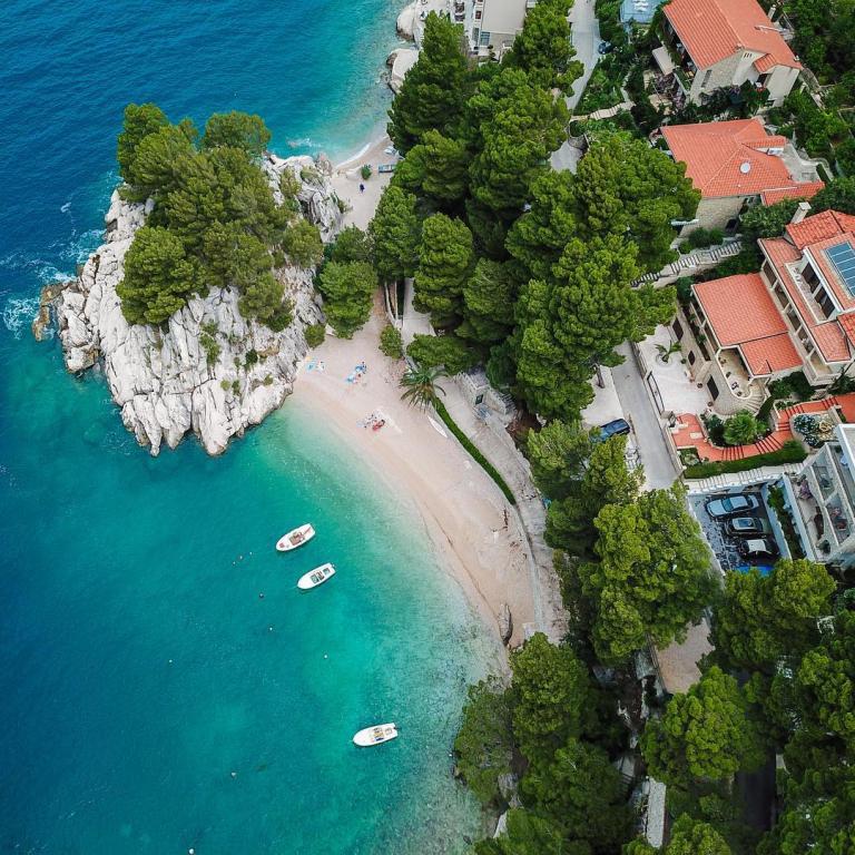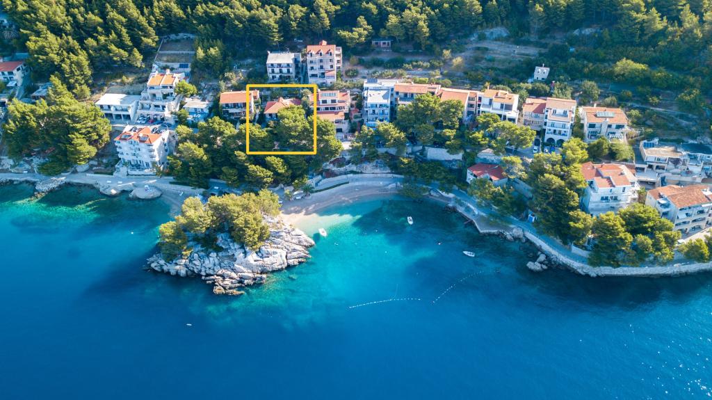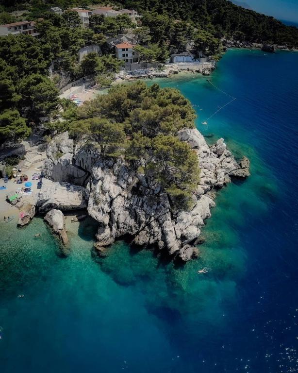 Apartament znajduje się w pierwszym rzędzie do morza, czyli tuż przy plaży Podrače, jednej z najsłynniejszych plaż w Chorwacji. Kamień Brela, symbol całej gminy Brela, znajduje się zaledwie dwie minuty spacerem od obiektu, a tuż obok Kamienia Brela znajduje się plaża Punta Rata, która od lat uznawana jest za jedną z najpiękniejszych plaż w świat. Samo mieszkanie składa się z dużego przedpokoju z dwiema sypialniami z dużymi podwójnymi łóżkami. Każdy pokój posiada własną łazienkę oraz balkon z widokiem na morze. W apartamencie znajduje się również wyposażona kuchnia. Inne udogodnienia obejmują klimatyzację, telewizję satelitarną i WiFi. Apartament może pomieścić maksymalnie 4 osoby