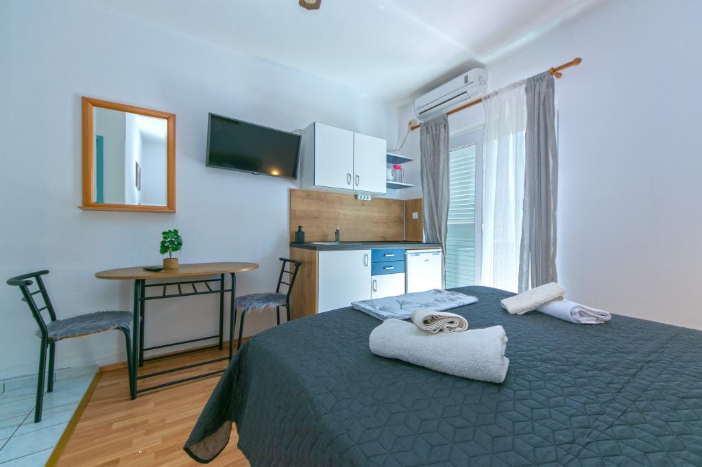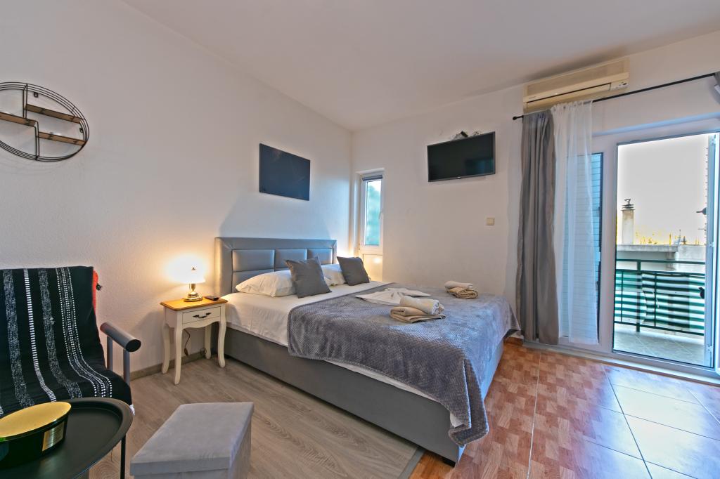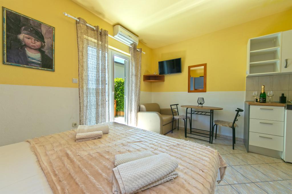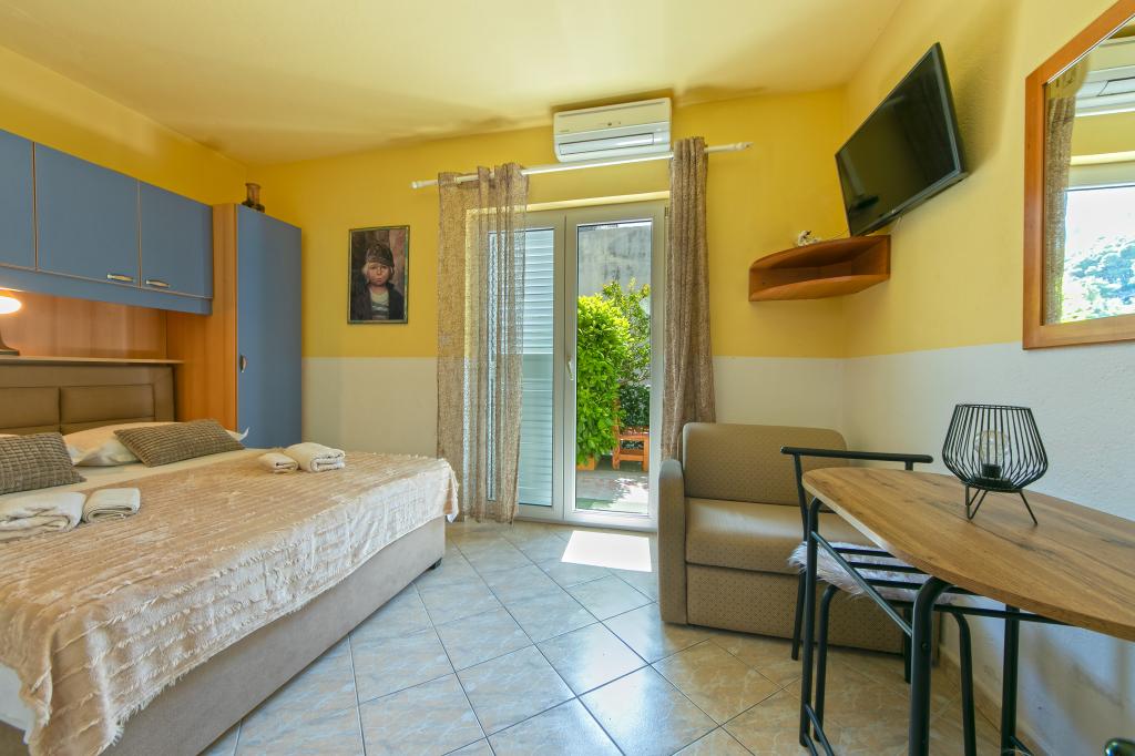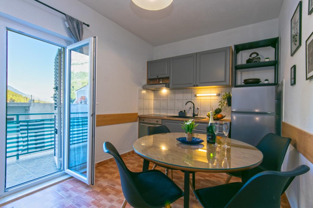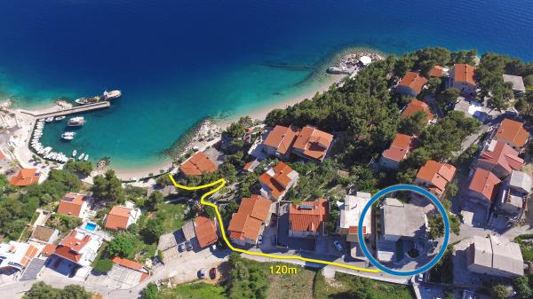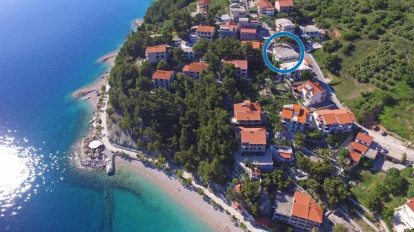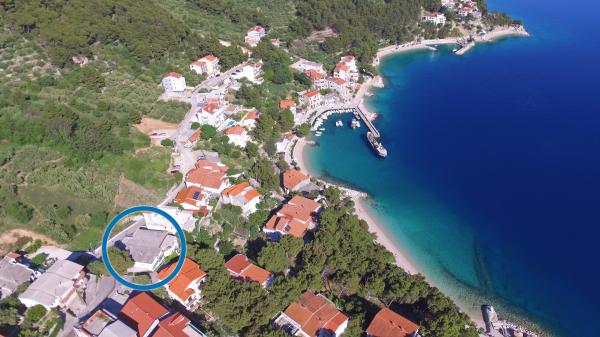 Apartamenty Hrvoje znajdują się na wzniesieniu, w cichej części ulicy Stomarica. Odległość od plaży żwirowej wynosi około 3 min. spacerem lub 150 m. Po jednej stronie domu znajduje się widok na morze, a drugi ma widok na górę Biokovo. Oferta rodziny Jelčić to jakość, a goście mogą w pełni zrelaksować się w apartamentach i spędzić niezapomniane wakacje. Apartamenty zadowolą wszystkich gości, którzy chcą spędzić przyjemny urlop. Oferta zakwaterowania obejmuje apartamenty wyposażone w kuchnię, sypialnię, klimatyzację, telewizję satelitarną, łazienkę i balkony. Za domem znajduje się taras ogrodowy ze stolikami, gdzie goście mogą odpocząć, podziwiając spokojną atmosferę z widokiem na morze. Dostępne jest również korzystanie z grilla na świeżym powietrzu, ale przyjazna pani. Jelcic chętnie im pomoże. Parking jest zabezpieczony.