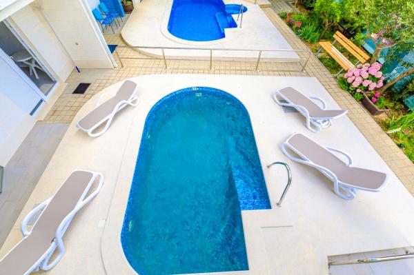Apartamenty Ulix Brela znajdują się w Breli, małej atrakcyjnej miejscowości na Riwierze Makarskiej z wieloletnią tradycją turystyczną. W naszej ofercie znajdują się 3 apartamenty dwupokojowe 4 2 (4 osoby, z możliwością 2 dostawek), 3 apartamenty typu studio 2 1 (2 osoby, z możliwością 1 dostawki) oraz 1 apartament typu studio (2 osoby ). Wszystkie apartamenty są świeżo wyremontowane, posiadają przestronny balkon z widokiem na morze i pobliskie wyspy (z wyjątkiem apartamentu typu studio dla 2 osób, który znajduje się tuż przy basenie), a nasi goście mają także do dyspozycji bezpłatne wi-fi, parking i basen na podwórzu domu, siłownia i wspólna pralka. Znajdujemy się w spokojnej okolicy, 150 m od morza, skąd można z łatwością dojść do centrum Breli w niecałe 10 minut i do centrum Baška Voda w 15 minut. Supermarket znajduje się zaledwie 50 m od hotelu, a pierwsza restauracja 300 m od obiektu.
