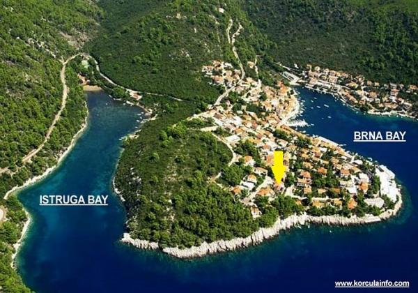 Apartamenty znajdują się w cichej zatoce Brna w południowej części wyspy. Oferujemy trzy apartamenty i studia. Studio jest przeznaczony dla 2 osób, znajdujących się na parterze, pokój i wc, kuchnia i taras. Apartament 3 +1 i 2 +2 osoby są odpowiednie dla rodzin z dziećmi, a Suite 4, które ma dwa pokoje i jest odpowiedni dla rodzin i par. Apartamenty znajdują się blisko morza i poza centrum miasta, dzięki czemu Goście mogą cieszyć się ciszą i spokojem. Centrum Brna od apartamentu jest 150-200 metrów, znajdują się sklepy, restauracje, poczta, kawiarnie i biura turystycznego. Blisko Brna jest piaszczysta plaża Istruga znany z błota, która występuje naturalnie i używam do leczenia chorób reumatycznych. Istruga oferuje zaplecze sportowe, a więc nadaje się dla dzieci.
