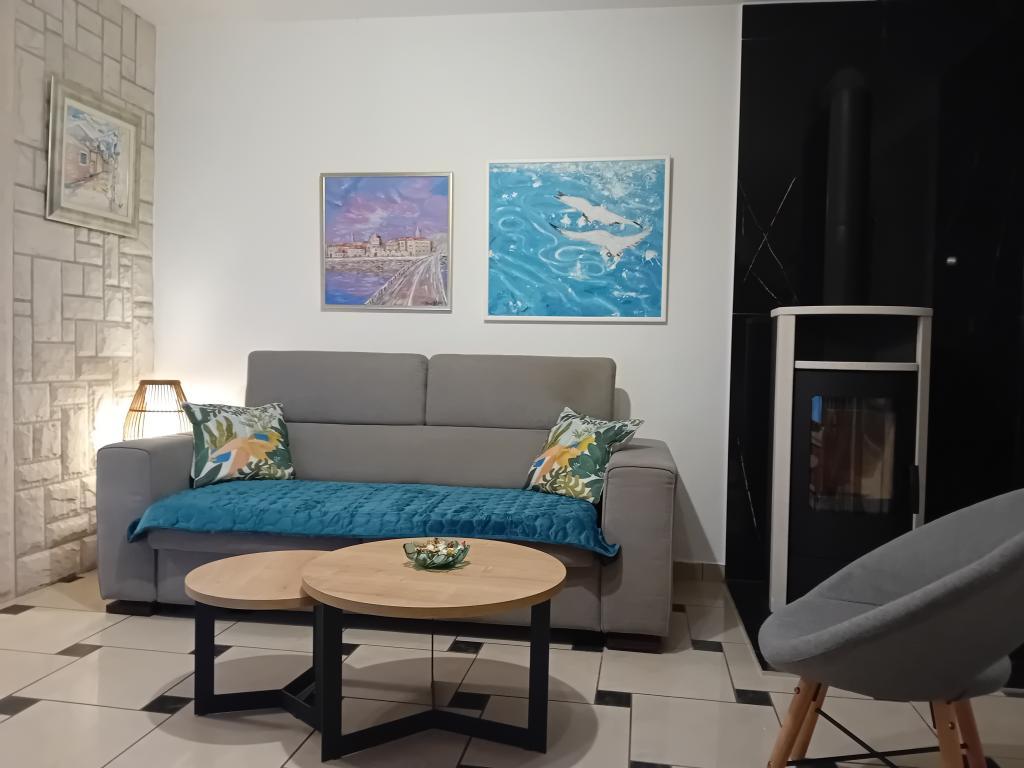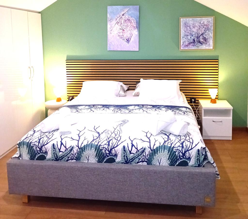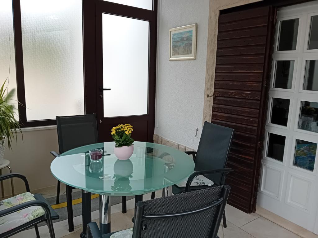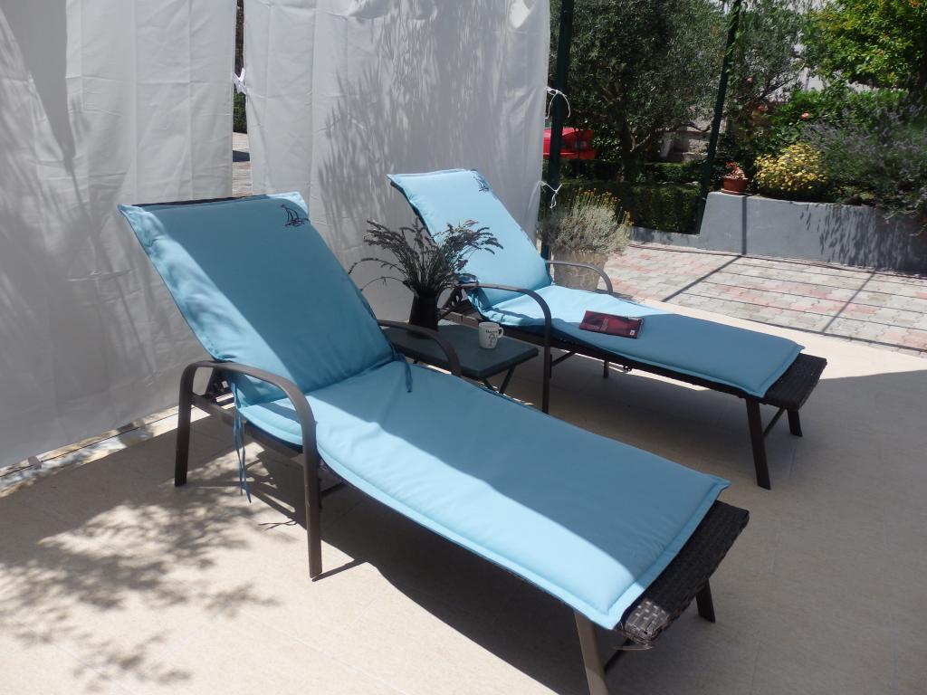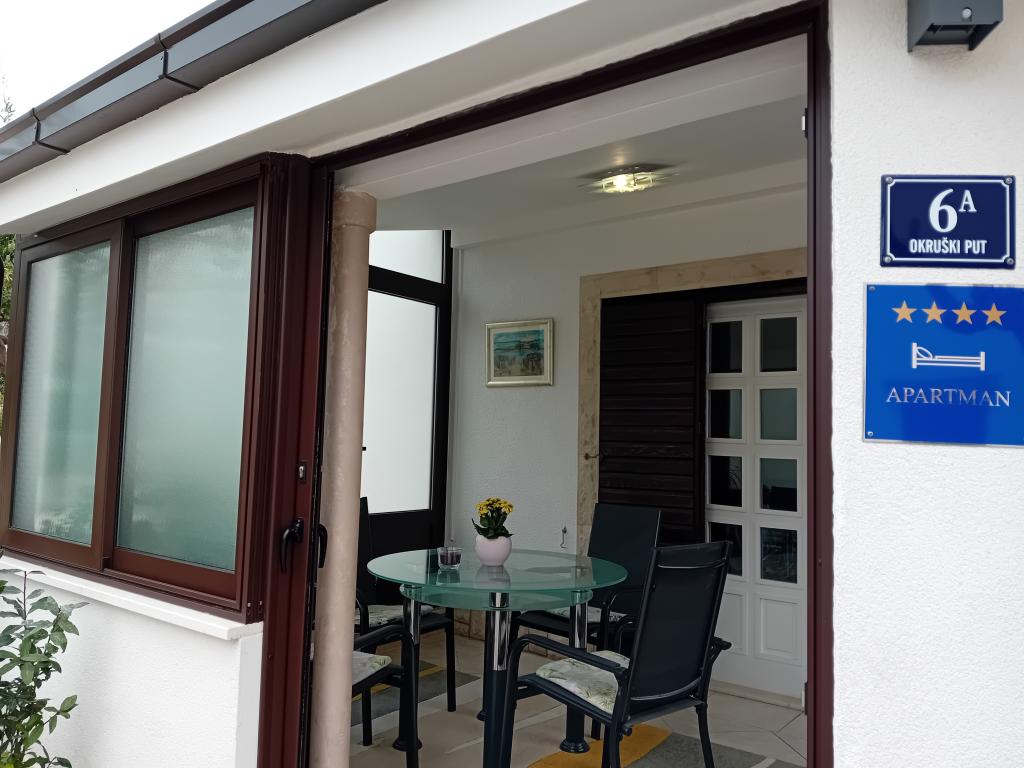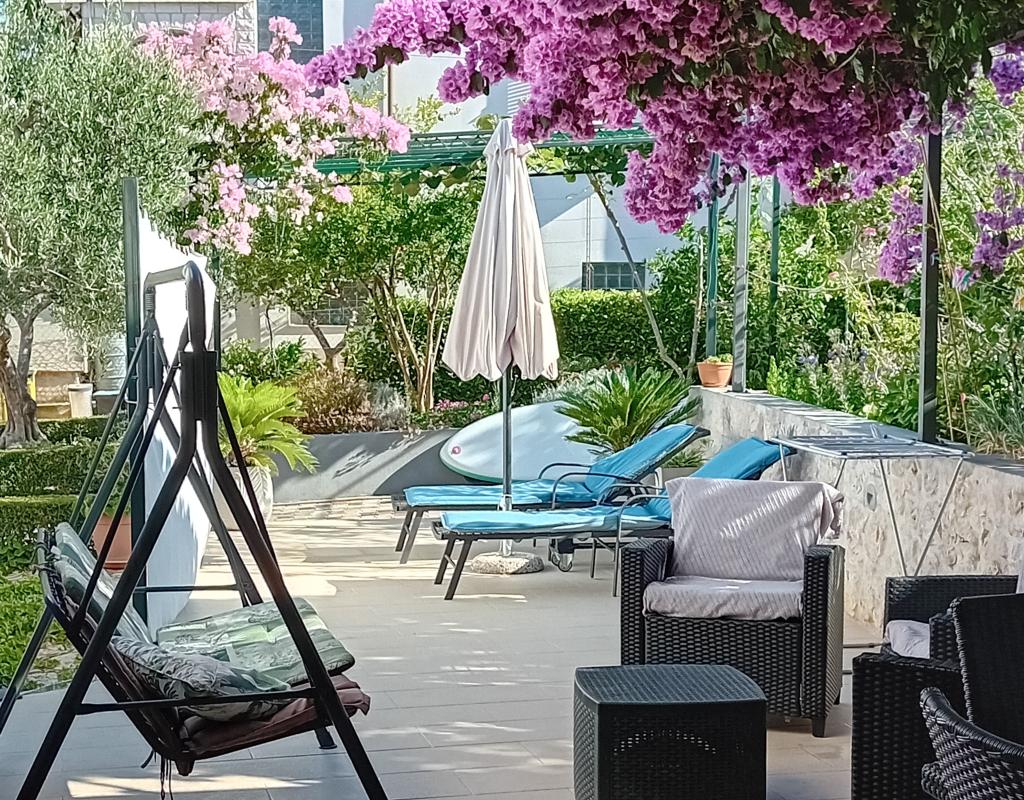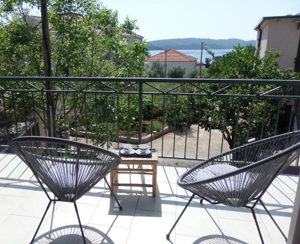 Nowocześnie wyposażony apartament z widokiem na morze, dużym tarasem i ogrodem, blisko plaży, 4 gwiazdki. Apartament znajduje się w domu (parter i pierwsze piętro). Na parterze znajduje się: przedpokój, kuchnia, salon i łazienka. Salon wyposażony jest w rozkładaną sofę dla dwóch osób. Na piętrze znajduje się: sypialnia, łazienka (z oddzielnym prysznicem i toaletą) oraz zadaszony balkon o powierzchni 10 m² z widokiem na morze. W sypialni znajduje się wygodne łóżko małżeńskie oraz fotel, który można rozłożyć jako łóżeczko dziecięce. Kuchnia na parterze prowadzi na taras o powierzchni 45 m². Grill i stół jadalny znajdują się w zadaszonej części (15 m²), a pozostała część to miejsce do opalania i relaksu z widokiem na ogród.