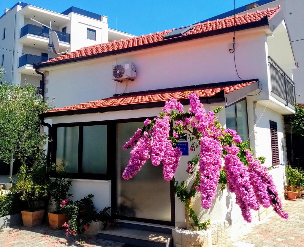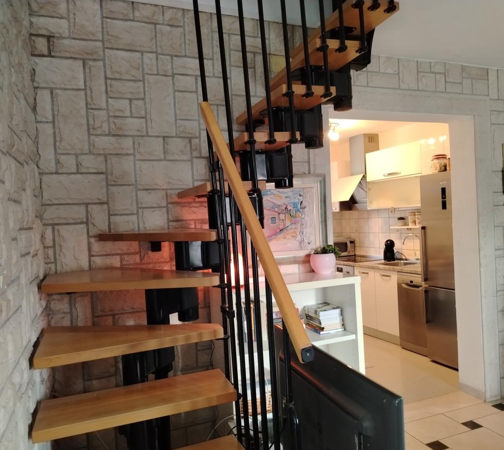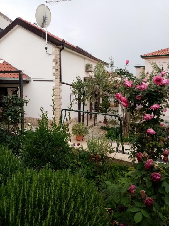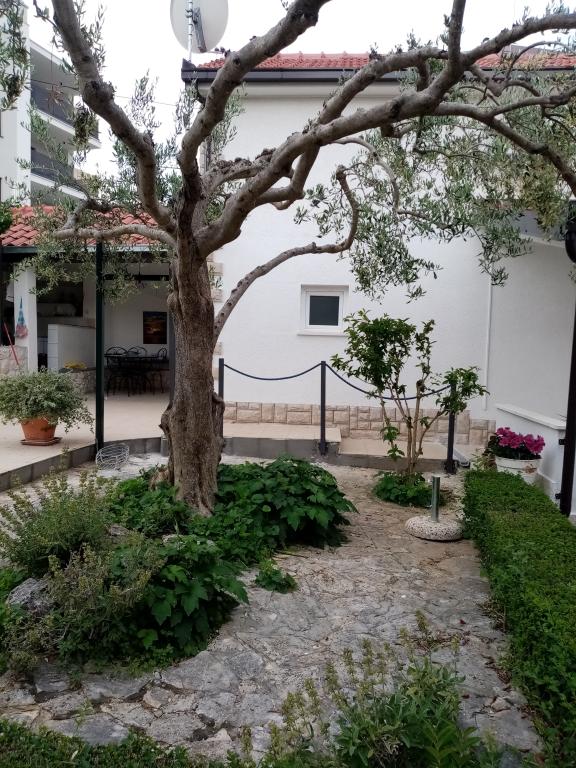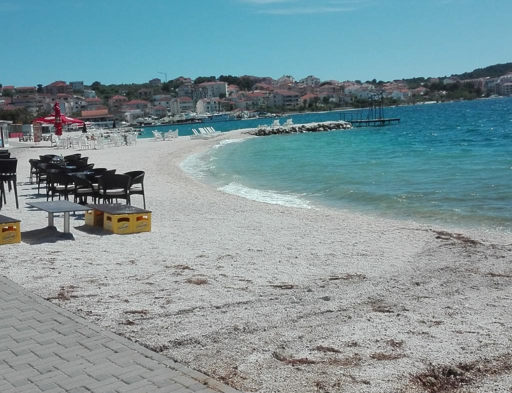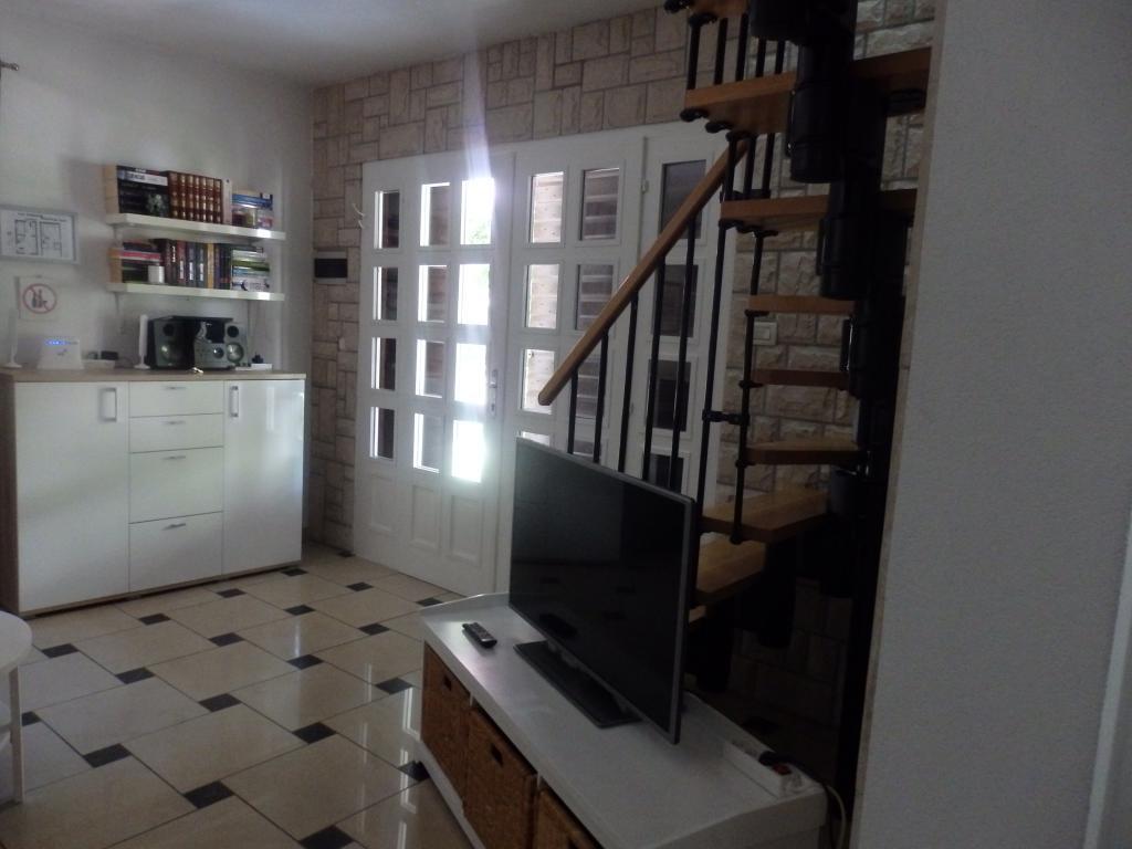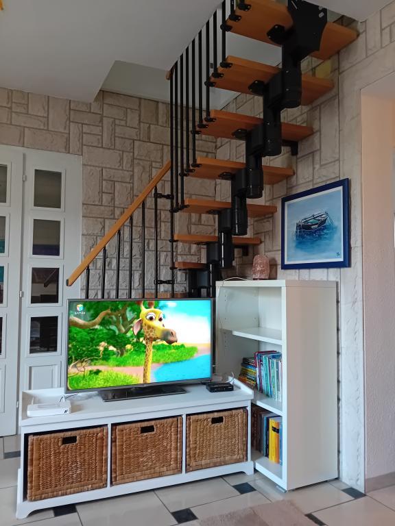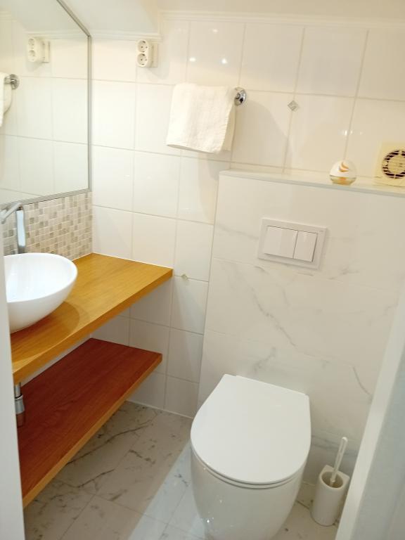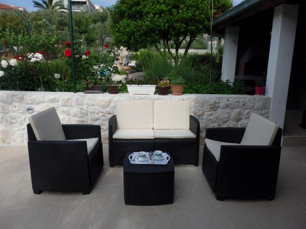 Nowocześnie wyposażony apartament z widokiem na morze, dużym tarasem i ogrodem, blisko plaży, 4 gwiazdki. Apartament znajduje się w domu (parter i pierwsze piętro). Na parterze znajduje się: przedpokój, kuchnia, salon i łazienka. Salon wyposażony jest w rozkładaną sofę dla dwóch osób. Na piętrze znajduje się: sypialnia, łazienka (z oddzielnym prysznicem i toaletą) oraz zadaszony balkon o powierzchni 10 m² z widokiem na morze. W sypialni znajduje się wygodne łóżko małżeńskie oraz fotel, który można rozłożyć jako łóżeczko dziecięce. Kuchnia na parterze prowadzi na taras o powierzchni 45 m². Grill i stół jadalny znajdują się w zadaszonej części (15 m²), a pozostała część to miejsce do opalania i relaksu z widokiem na ogród.
