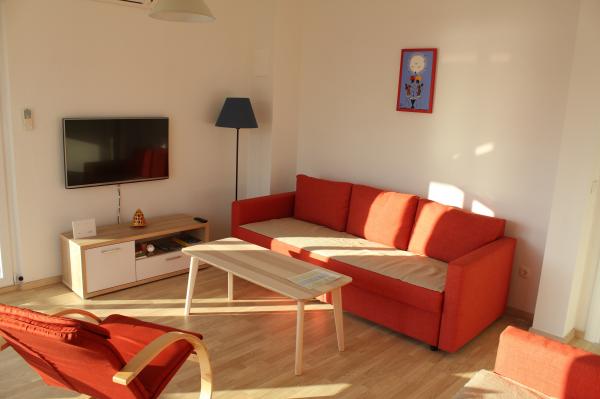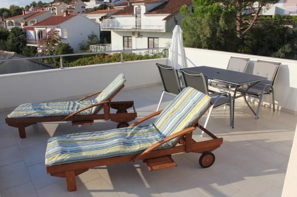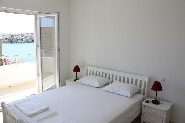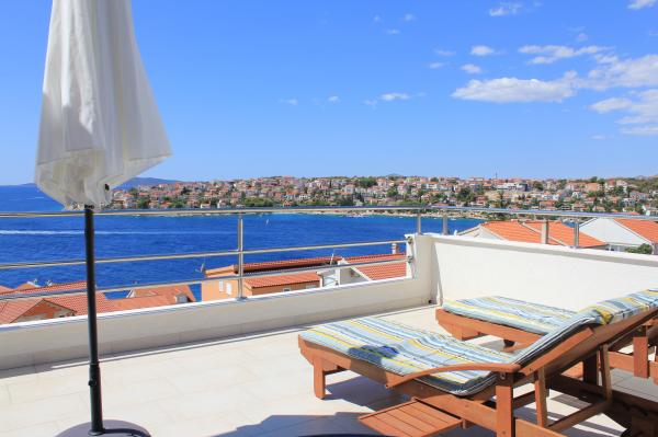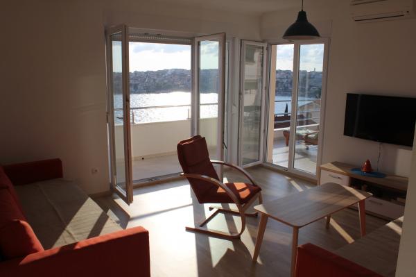 Apartamenty skierowane na południe są odpowiednie dla indywidualnych gości, jak również dla par i mniejszych grup oraz rodzin (4-5 osób). Apartamenty są nowo wybudowane i wyposażone w nowoczesne i wysokiej jakości materiały i urządzenia. Kuchnia, salon, sypialnia, łazienka są dostępne z korytarza. Apartamenty są przestronne i pełne światła we wszystkich pomieszczeniach z możliwością przyciemnienia za pomocą rolet. Przestrzeń wewnętrzna (56 m2) uzupełniona jest dodatkowym tarasem i balkonem o powierzchni 35 m2, do których można wejść z salonu i sypialni. Oferują piękny widok na morze, które znajduje się w odległości 120 m. Apartament wyposażony jest w 43-calowy telewizor, WiFi, zmywarkę, płytę ceramiczną i piekarnik, lodówkę, ekspres do kawy Nespresso, kuchenkę mikrofalową. Dla wygodnego snu łóżka wyposażone są w materace kieszeniowe o wymiarach 160x200 cm, a także wysokiej jakości pościel. 2 rozkładane sofy (140x200 cm) w salonie. Miejsce parkingowe. Pralka.