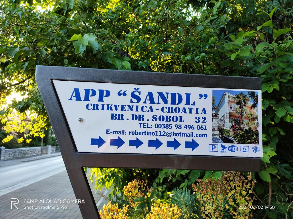 Apartament Šandl znajduje się w cichej i atrakcyjnej części miasta Crikvenica, w pobliżu szpitala talasoterapii, w otoczeniu zieleni i niedaleko głównej plaży miejskiej, która jest oddalona o 200 m. Mieszkanie jest wygodne, składa się z dwóch pokoi z możliwością 4 dostawek. Wyposażony jest w klimatyzację, TV-SAT, internet WI-FI... W kuchni znajduje się zmywarka, kuchenka mikrofalowa i zestaw stereo do słuchania muzyki. W mieszkaniu znajduje się łazienka z WC oraz druga oddzielna toaleta. Przed apartamentem znajduje się taras, a w ogródku grill. Posiadamy strzeżony parking dla dwóch pojazdów średniej klasy. Jesteśmy 1,7 km od centrum miasta, najbliższy mini sklep znajduje się zaledwie 60 m, a duże centra handlowe 800 m.