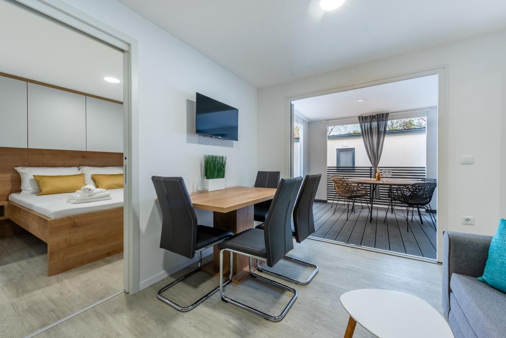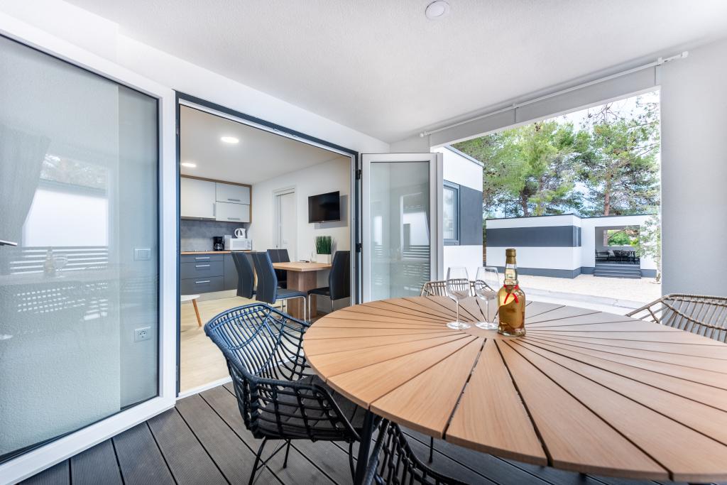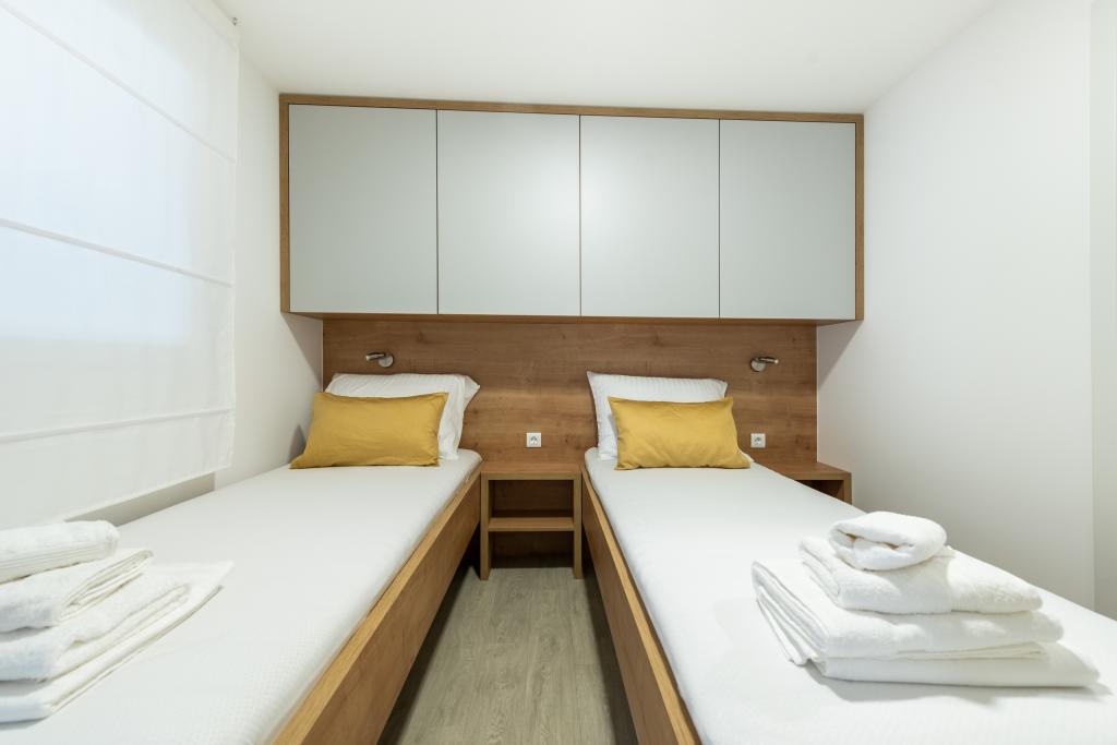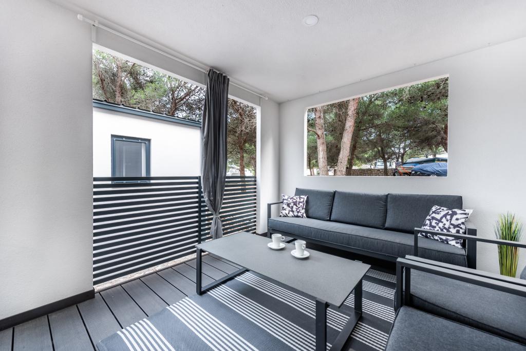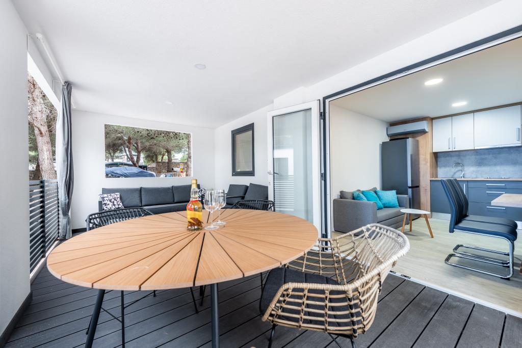 Luksusowy, nowocześnie wyposażony dom mobilny z pięknym tarasem, który zadowoli każdy gust. Dom mobilny położony jest na terenie kempingu „Oaza mira” w doskonałej lokalizacji, w zacienionym lesie sosnowym, zaledwie 50 metrów od pięknej plaży. W bezpośrednim sąsiedztwie znajduje się duży basen oraz liczne obiekty sportowe (kort tenisowy, boisko do gry w bule, plac zabaw dla dzieci). Na terenie obozu znajduje się restauracja, supermarket i duży węzeł sanitarny z pralnią. W każdym domu znajdują się dwie sypialnie: pokój z łóżkiem podwójnym i pokój z dwoma pojedynczymi łóżkami. W salonie narożnik może służyć jako dodatkowe łóżko dla dwóch osób. Dom składa się z dużego salonu, kuchni ze sprzętem AGD, kuchenką i lodówką, a także jednej/dwóch łazienek z prysznicem, umywalką i toaletą. Dom mobilny posiada ogródek z tarasem i zadaszeniem.