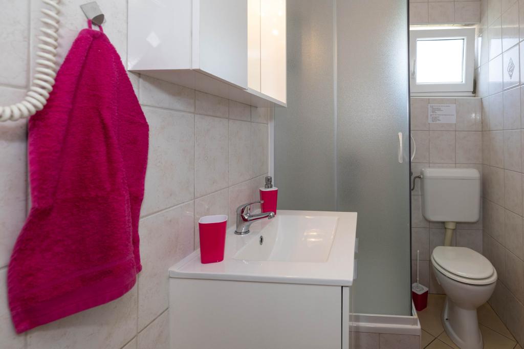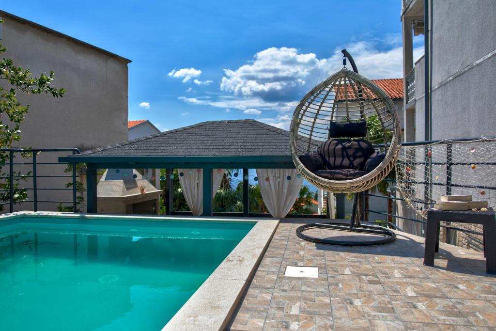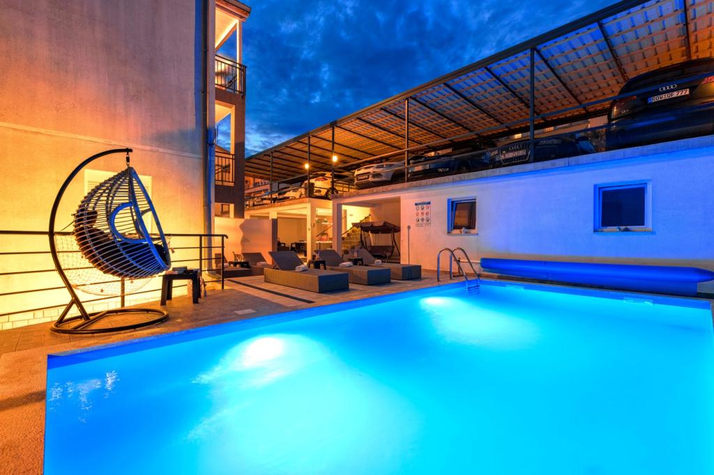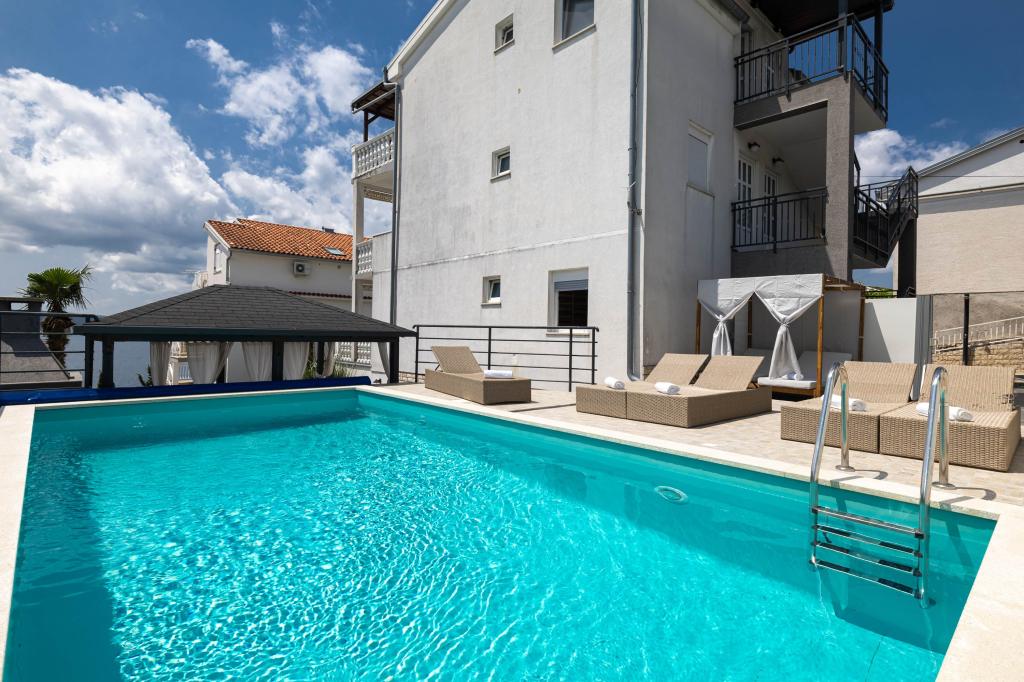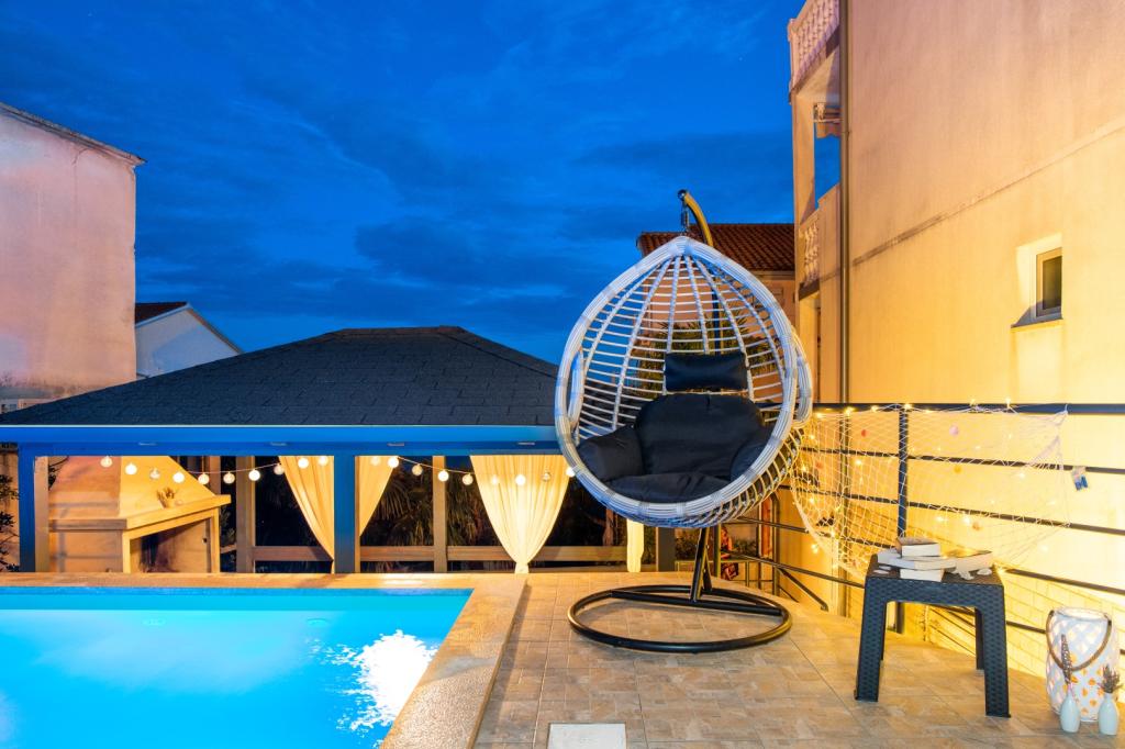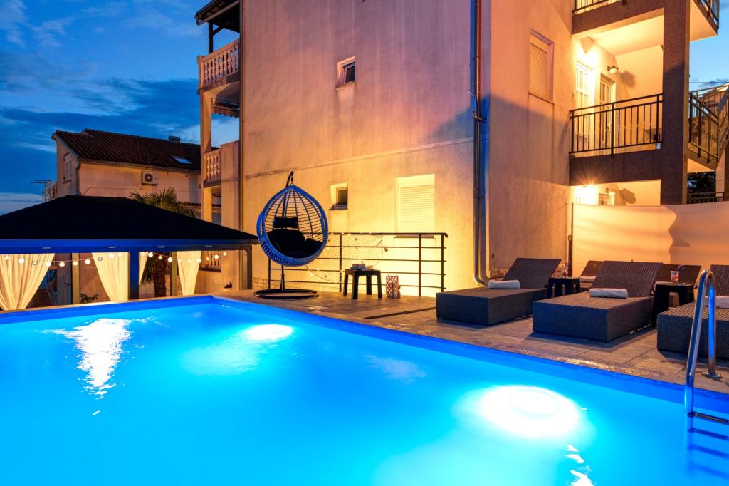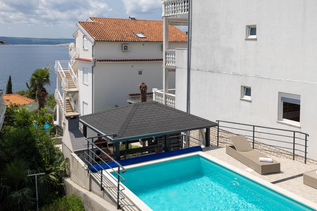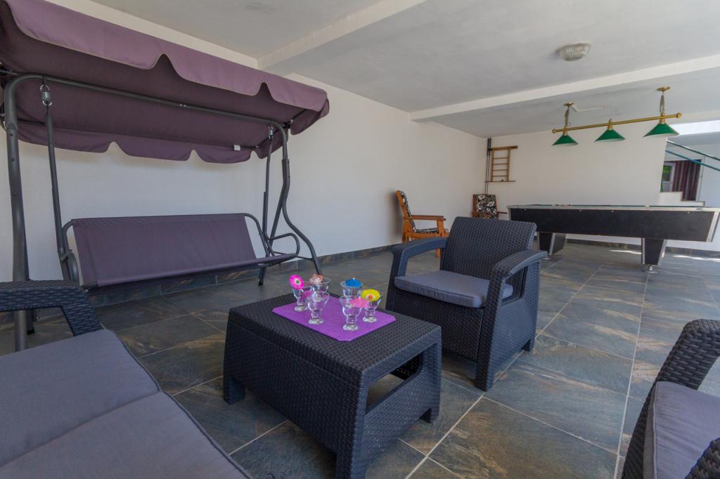 Nasz obiekt położony jest w drugim rzędzie od morza, co sprawia, że jest to idealne miejsce na relaksujący letni wypoczynek. Dom posiada sześć nowocześnie urządzonych apartamentów z widokiem na morze, wyposażonych tak, aby zapewnić przyjemny pobyt. Wszystkie apartamenty posiadają wyposażoną kuchnię z czajnikiem, ekspresem do kawy, tosterem i kuchenką mikrofalową. Łazienki wyposażone są w prysznic, toaletę i suszarkę do włosów. Na dziedzińcu znajdują się liczne udogodnienia umożliwiające relaks i rozrywkę. Do dyspozycji gości jest basen o wymiarach 7 x 3,5 m z leżakami, wanną z hydromasażem, prysznicem i altaną z grillem. Grill wyposażony jest w zlew i wszystkie niezbędne przybory kuchenne. W altanie znajduje się duży stół z dwiema ławkami, idealny na spotkania w większym gronie. W zadaszonej części podwórka znajduje się stół bilardowy, rzutki, gry planszowe i mała biblioteczka z książkami. Przed domem znajduje się zadaszony parking, na każdy apartament przypada jedno miejsce parkingowe. Apartamenty są rozmieszczone w następujący sposób: A1 i A2 na parterze, A3 na pierwszym piętrze, A5 na drugim piętrze oraz A7 i A8 na trzecim piętrze. Powitanie!!!