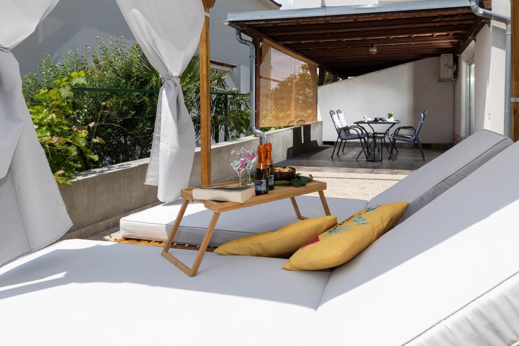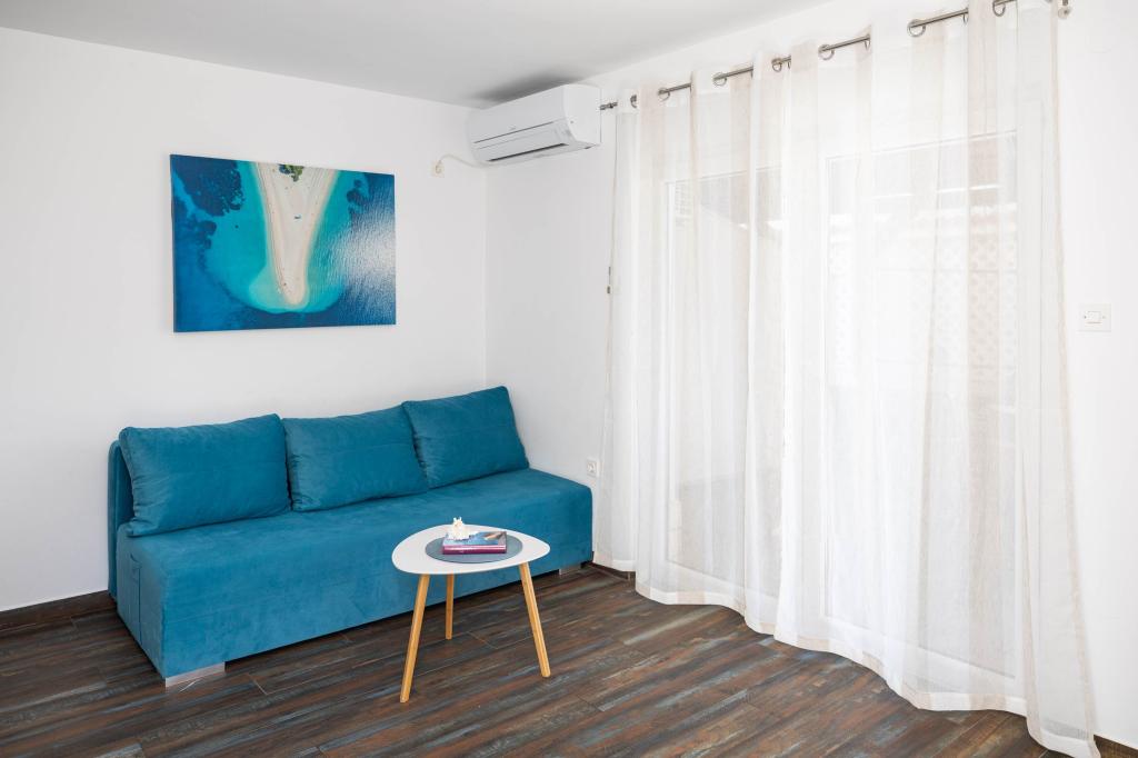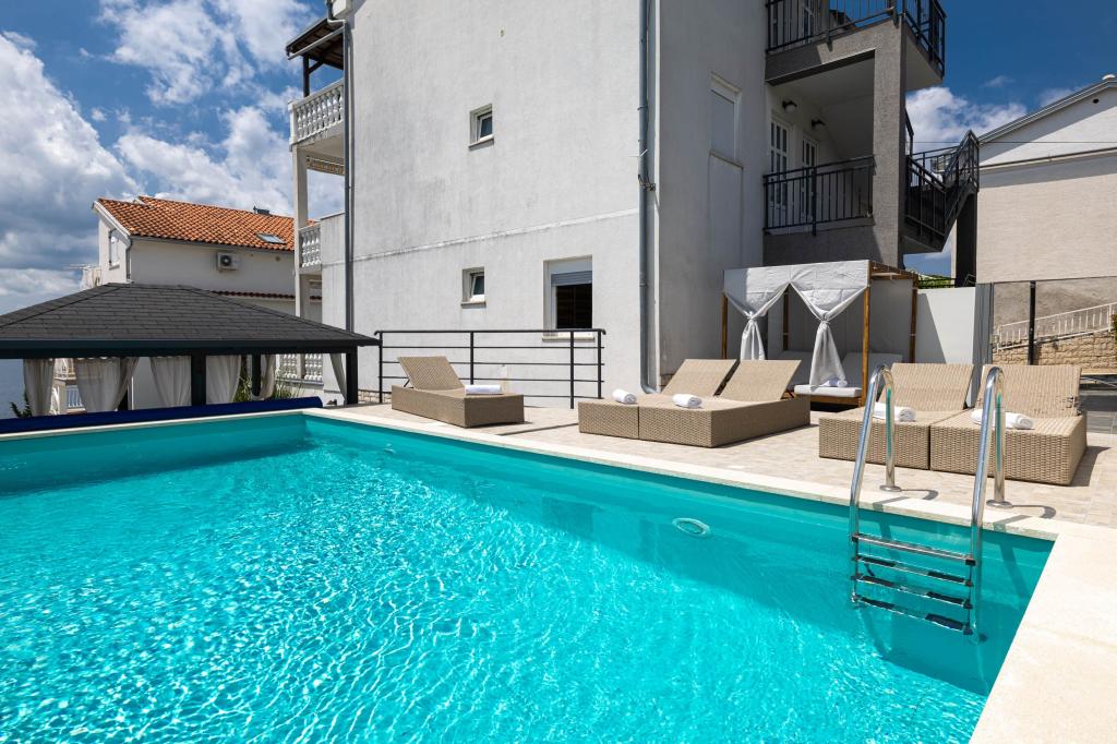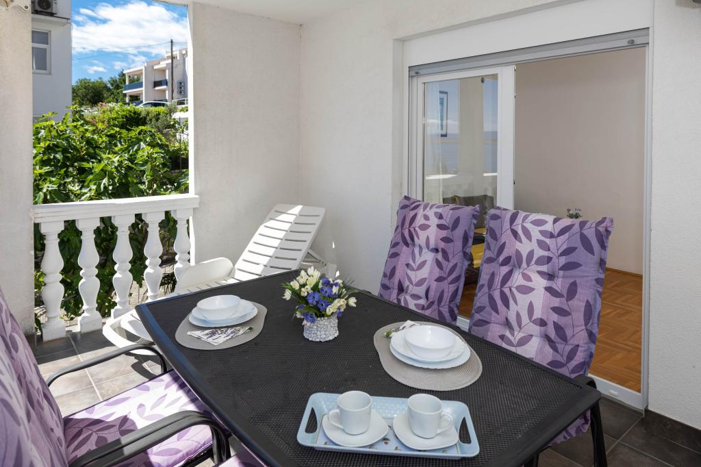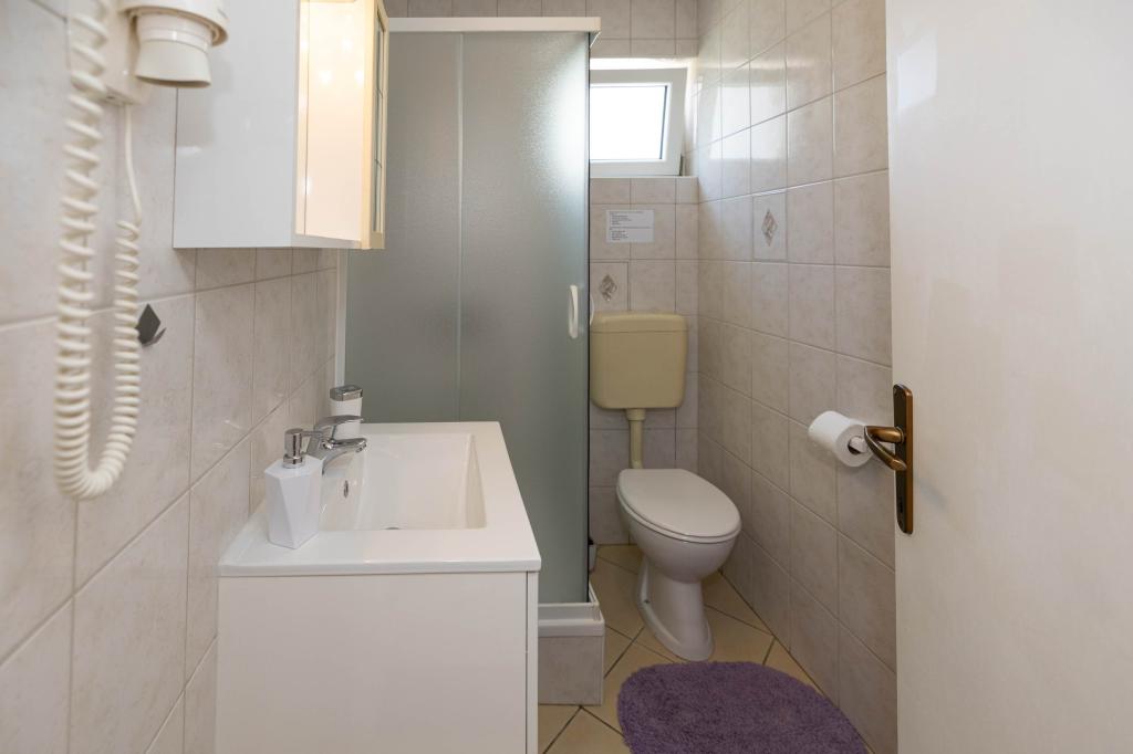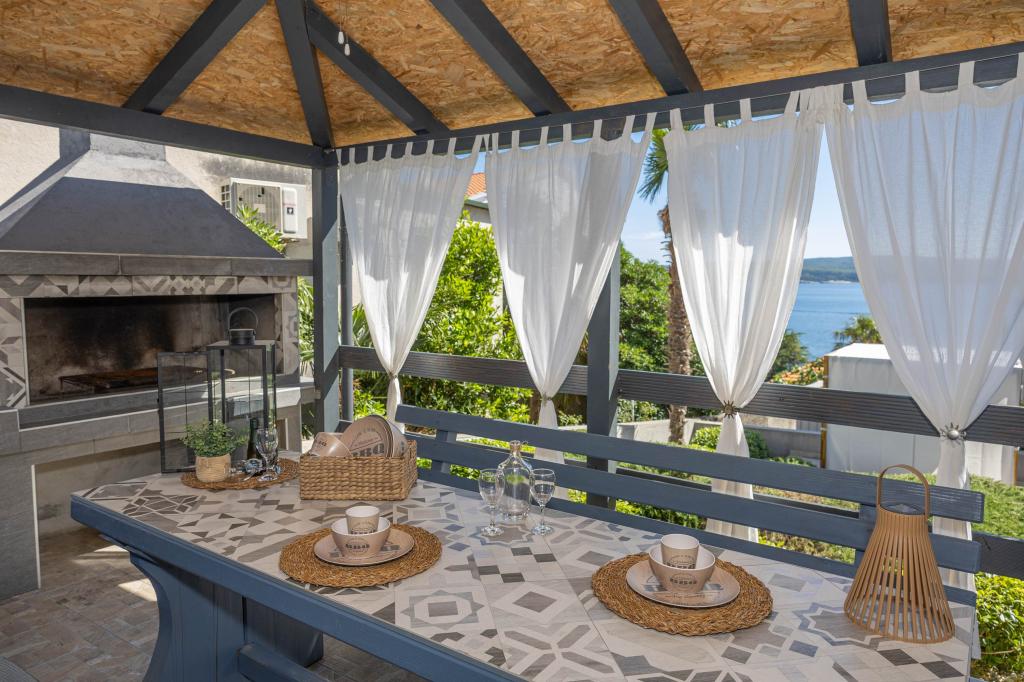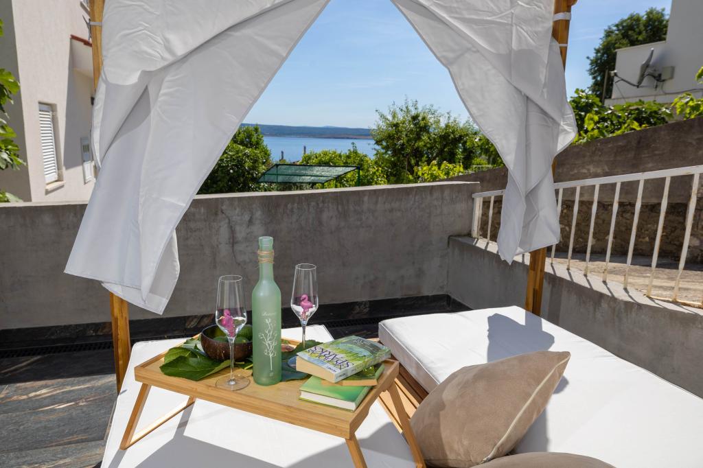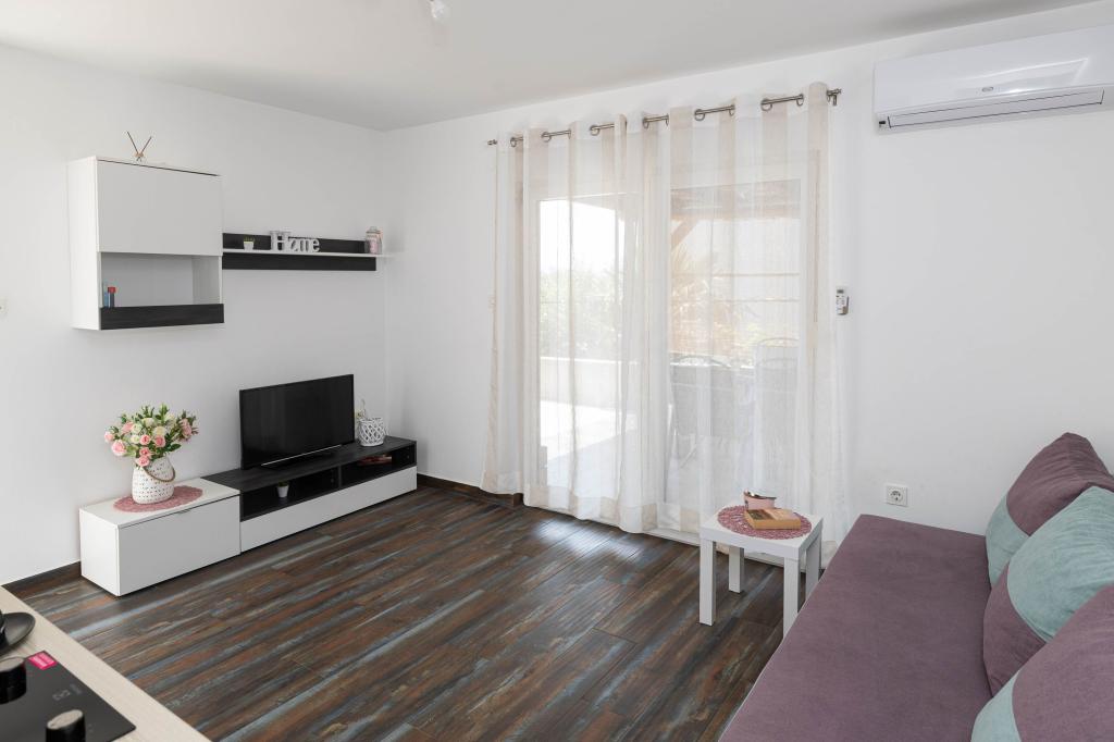 Nasz obiekt położony jest w drugim rzędzie od morza, co sprawia, że jest to idealne miejsce na relaksujący letni wypoczynek. Dom posiada sześć nowocześnie urządzonych apartamentów z widokiem na morze, wyposażonych tak, aby zapewnić przyjemny pobyt. Wszystkie apartamenty posiadają wyposażoną kuchnię z czajnikiem, ekspresem do kawy, tosterem i kuchenką mikrofalową. Łazienki wyposażone są w prysznic, toaletę i suszarkę do włosów. Na dziedzińcu znajdują się liczne udogodnienia umożliwiające relaks i rozrywkę. Do dyspozycji gości jest basen o wymiarach 7 x 3,5 m z leżakami, wanną z hydromasażem, prysznicem i altaną z grillem. Grill wyposażony jest w zlew i wszystkie niezbędne przybory kuchenne. W altanie znajduje się duży stół z dwiema ławkami, idealny na spotkania w większym gronie. W zadaszonej części podwórka znajduje się stół bilardowy, rzutki, gry planszowe i mała biblioteczka z książkami. Przed domem znajduje się zadaszony parking, na każdy apartament przypada jedno miejsce parkingowe. Apartamenty są rozmieszczone w następujący sposób: A1 i A2 na parterze, A3 na pierwszym piętrze, A5 na drugim piętrze oraz A7 i A8 na trzecim piętrze. Powitanie!!!