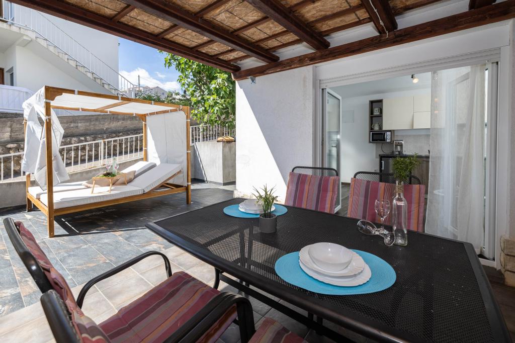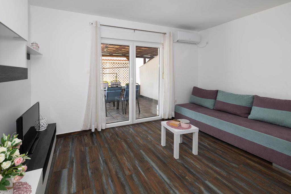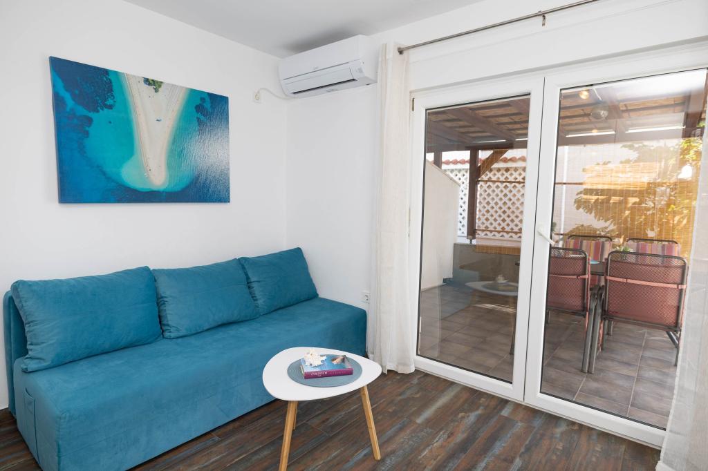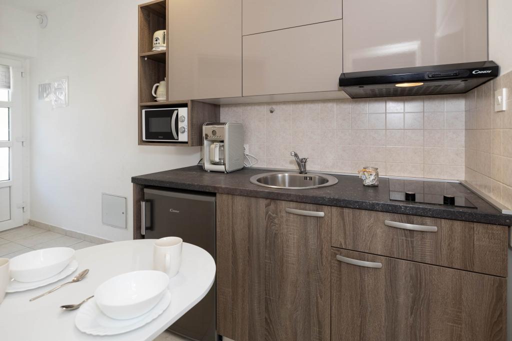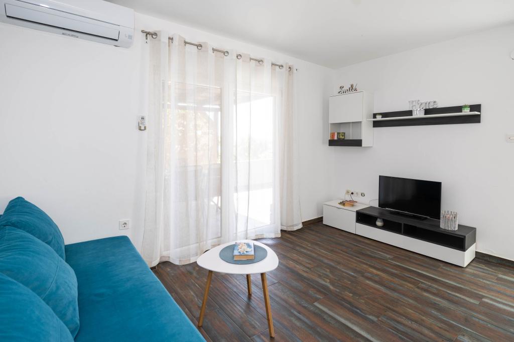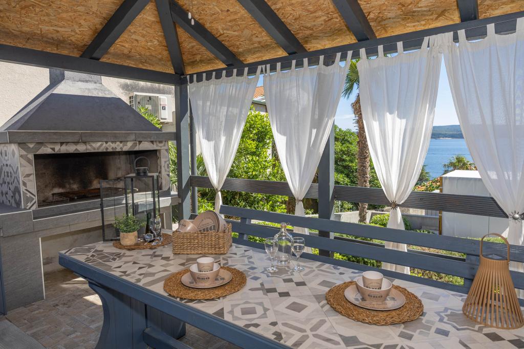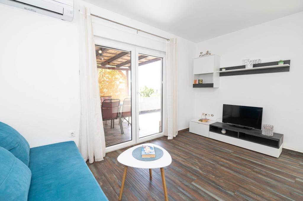 Nasz obiekt położony jest w drugim rzędzie od morza, co sprawia, że jest to idealne miejsce na relaksujący letni wypoczynek. Dom posiada sześć nowocześnie urządzonych apartamentów z widokiem na morze, wyposażonych tak, aby zapewnić przyjemny pobyt. Wszystkie apartamenty posiadają wyposażoną kuchnię z czajnikiem, ekspresem do kawy, tosterem i kuchenką mikrofalową. Łazienki wyposażone są w prysznic, toaletę i suszarkę do włosów. Na dziedzińcu znajdują się liczne udogodnienia umożliwiające relaks i rozrywkę. Do dyspozycji gości jest basen o wymiarach 7 x 3,5 m z leżakami, wanną z hydromasażem, prysznicem i altaną z grillem. Grill wyposażony jest w zlew i wszystkie niezbędne przybory kuchenne. W altanie znajduje się duży stół z dwiema ławkami, idealny na spotkania w większym gronie. W zadaszonej części podwórka znajduje się stół bilardowy, rzutki, gry planszowe i mała biblioteczka z książkami. Przed domem znajduje się zadaszony parking, na każdy apartament przypada jedno miejsce parkingowe. Apartamenty są rozmieszczone w następujący sposób: A1 i A2 na parterze, A3 na pierwszym piętrze, A5 na drugim piętrze oraz A7 i A8 na trzecim piętrze. Powitanie!!!