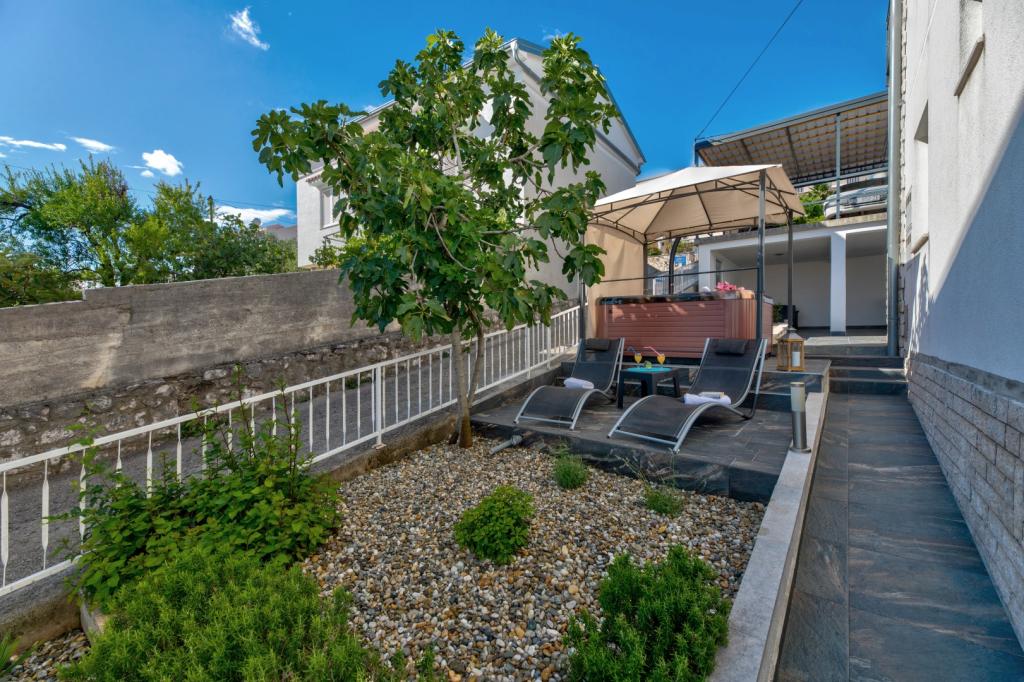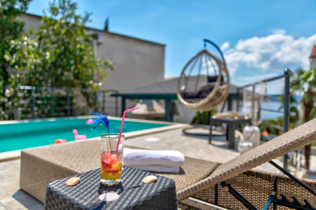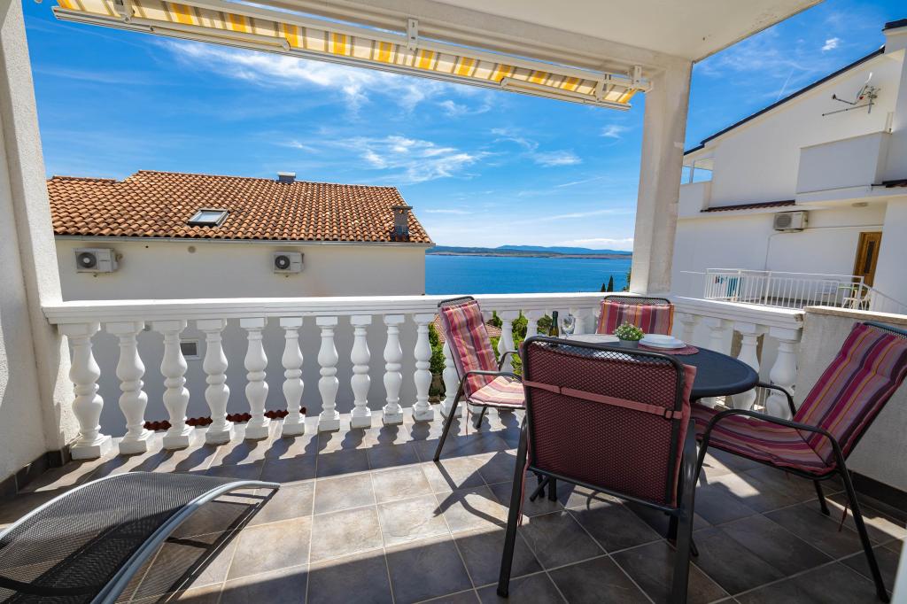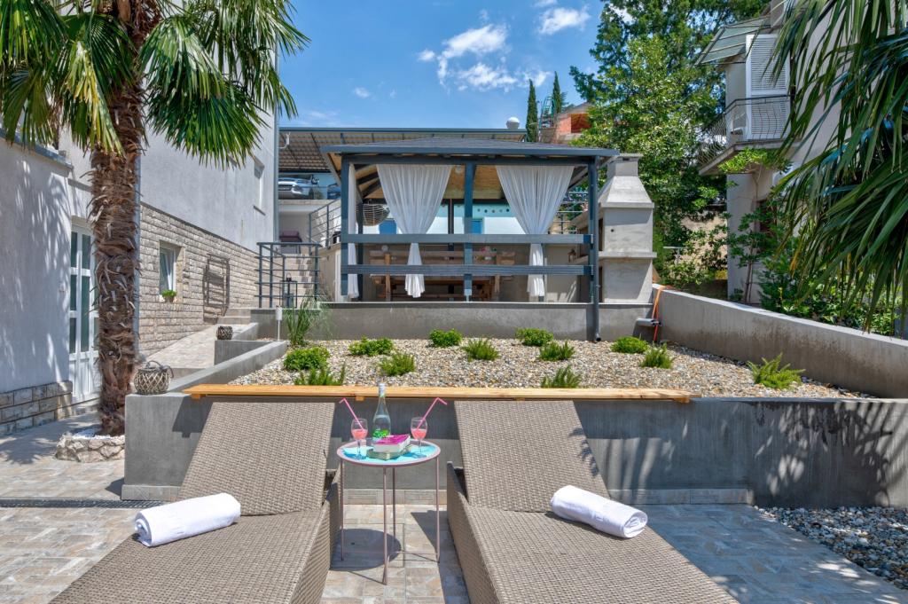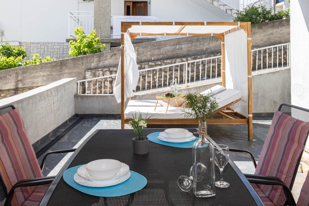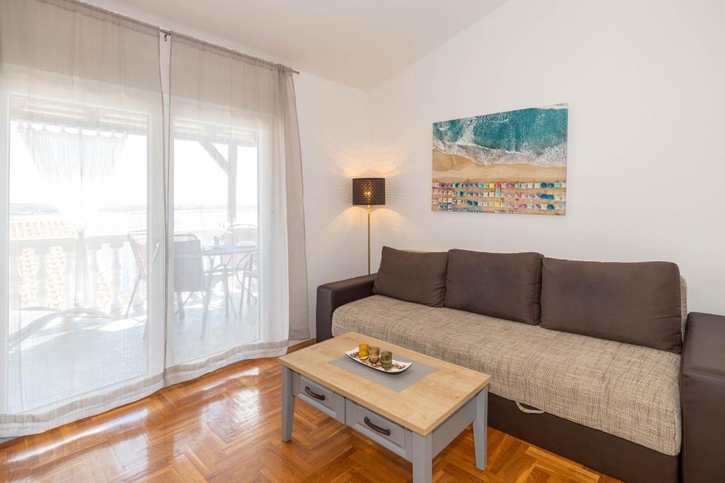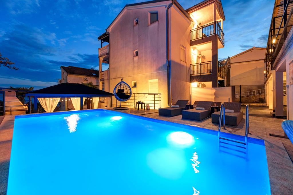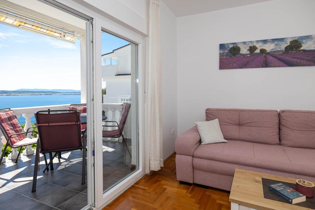 Nasz obiekt położony jest w drugim rzędzie od morza, co sprawia, że jest to idealne miejsce na relaksujący letni wypoczynek. Dom posiada sześć nowocześnie urządzonych apartamentów z widokiem na morze, wyposażonych tak, aby zapewnić przyjemny pobyt. Wszystkie apartamenty posiadają wyposażoną kuchnię z czajnikiem, ekspresem do kawy, tosterem i kuchenką mikrofalową. Łazienki wyposażone są w prysznic, toaletę i suszarkę do włosów. Na dziedzińcu znajdują się liczne udogodnienia umożliwiające relaks i rozrywkę. Do dyspozycji gości jest basen o wymiarach 7 x 3,5 m z leżakami, wanną z hydromasażem, prysznicem i altaną z grillem. Grill wyposażony jest w zlew i wszystkie niezbędne przybory kuchenne. W altanie znajduje się duży stół z dwiema ławkami, idealny na spotkania w większym gronie. W zadaszonej części podwórka znajduje się stół bilardowy, rzutki, gry planszowe i mała biblioteczka z książkami. Przed domem znajduje się zadaszony parking, na każdy apartament przypada jedno miejsce parkingowe. Apartamenty są rozmieszczone w następujący sposób: A1 i A2 na parterze, A3 na pierwszym piętrze, A5 na drugim piętrze oraz A7 i A8 na trzecim piętrze. Powitanie!!!