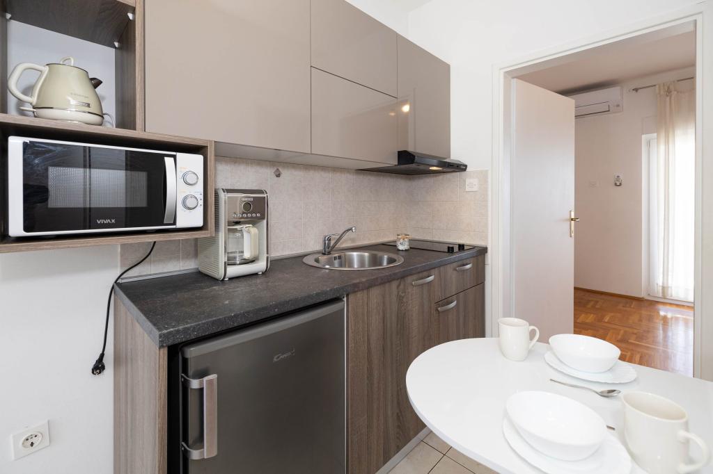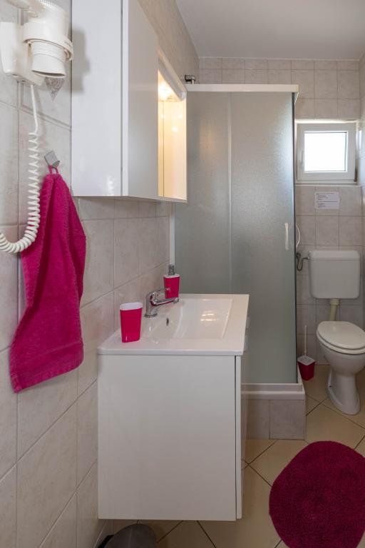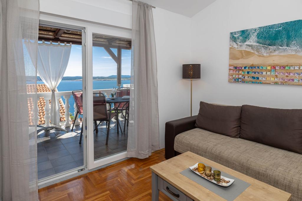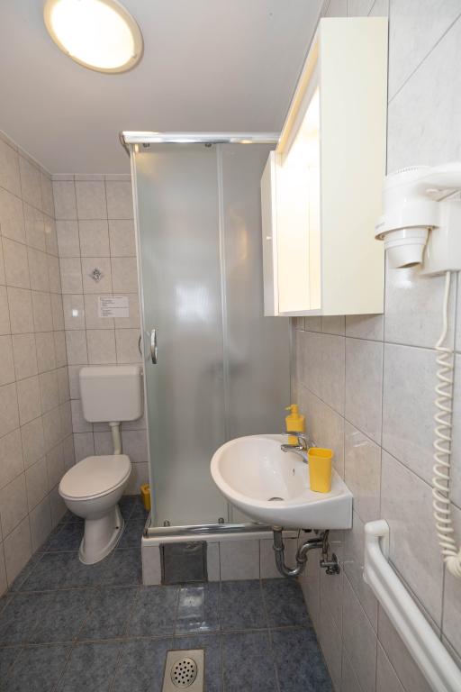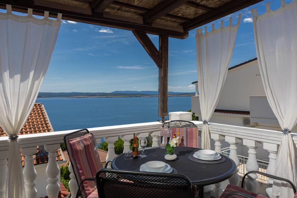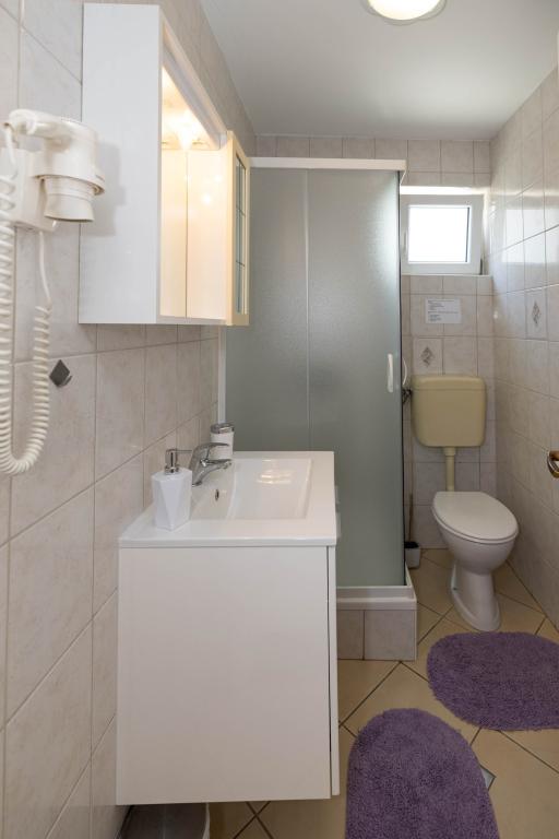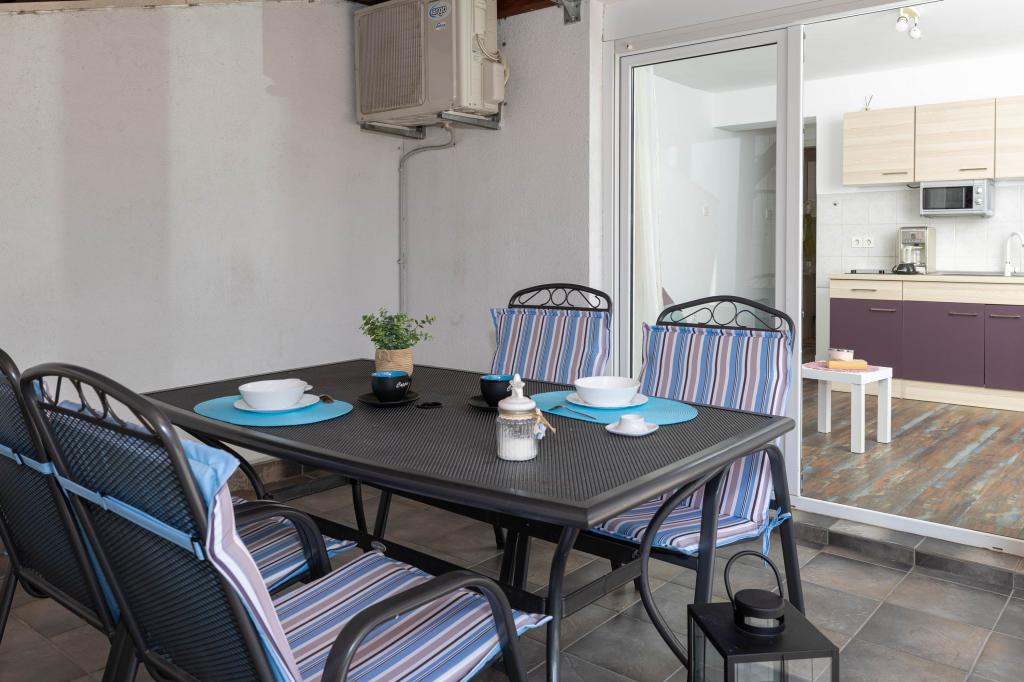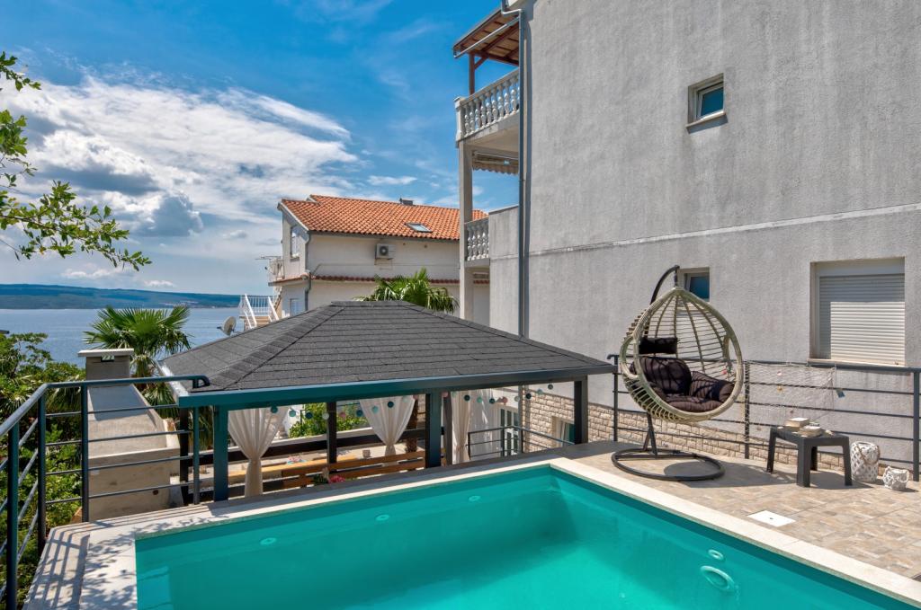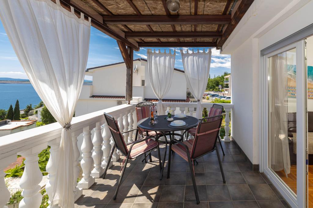 Nasz obiekt położony jest w drugim rzędzie od morza, co sprawia, że jest to idealne miejsce na relaksujący letni wypoczynek. Dom posiada sześć nowocześnie urządzonych apartamentów z widokiem na morze, wyposażonych tak, aby zapewnić przyjemny pobyt. Wszystkie apartamenty posiadają wyposażoną kuchnię z czajnikiem, ekspresem do kawy, tosterem i kuchenką mikrofalową. Łazienki wyposażone są w prysznic, toaletę i suszarkę do włosów. Na dziedzińcu znajdują się liczne udogodnienia umożliwiające relaks i rozrywkę. Do dyspozycji gości jest basen o wymiarach 7 x 3,5 m z leżakami, wanną z hydromasażem, prysznicem i altaną z grillem. Grill wyposażony jest w zlew i wszystkie niezbędne przybory kuchenne. W altanie znajduje się duży stół z dwiema ławkami, idealny na spotkania w większym gronie. W zadaszonej części podwórka znajduje się stół bilardowy, rzutki, gry planszowe i mała biblioteczka z książkami. Przed domem znajduje się zadaszony parking, na każdy apartament przypada jedno miejsce parkingowe. Apartamenty są rozmieszczone w następujący sposób: A1 i A2 na parterze, A3 na pierwszym piętrze, A5 na drugim piętrze oraz A7 i A8 na trzecim piętrze. Powitanie!!!