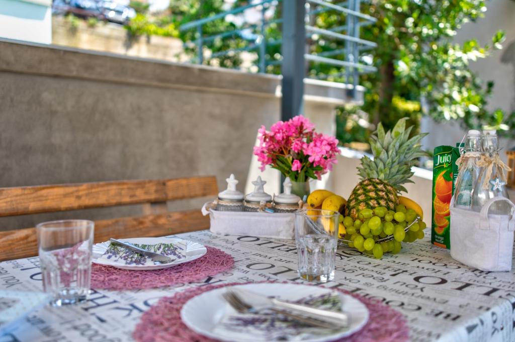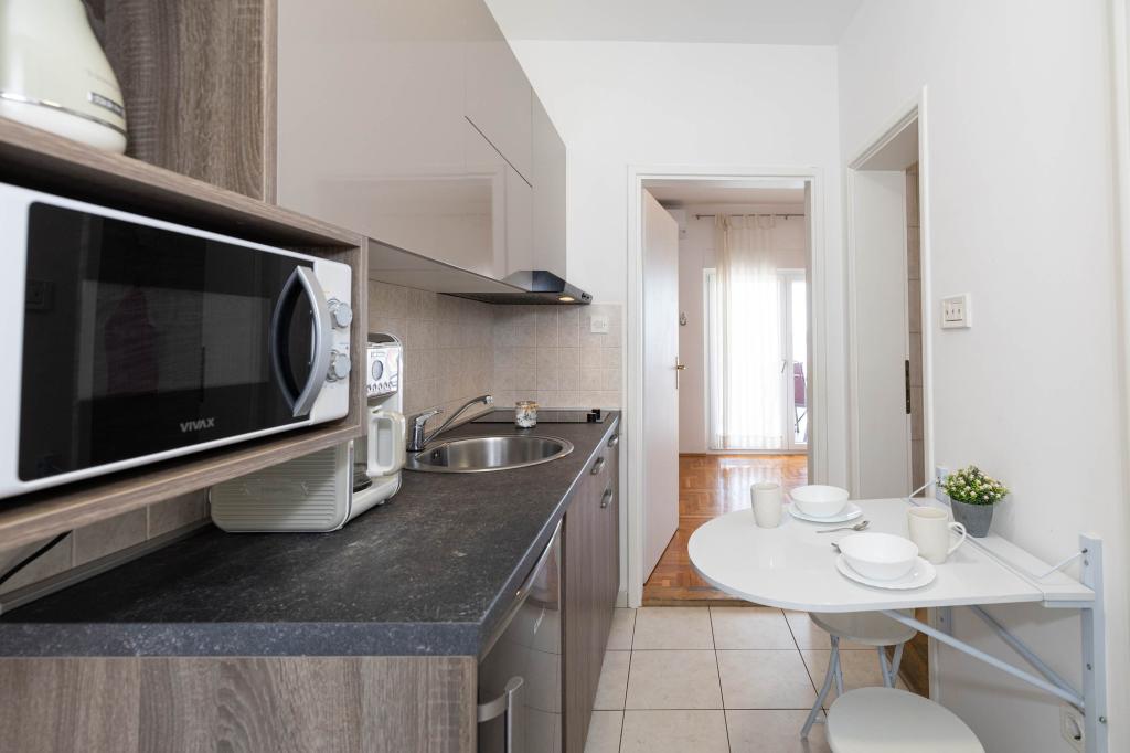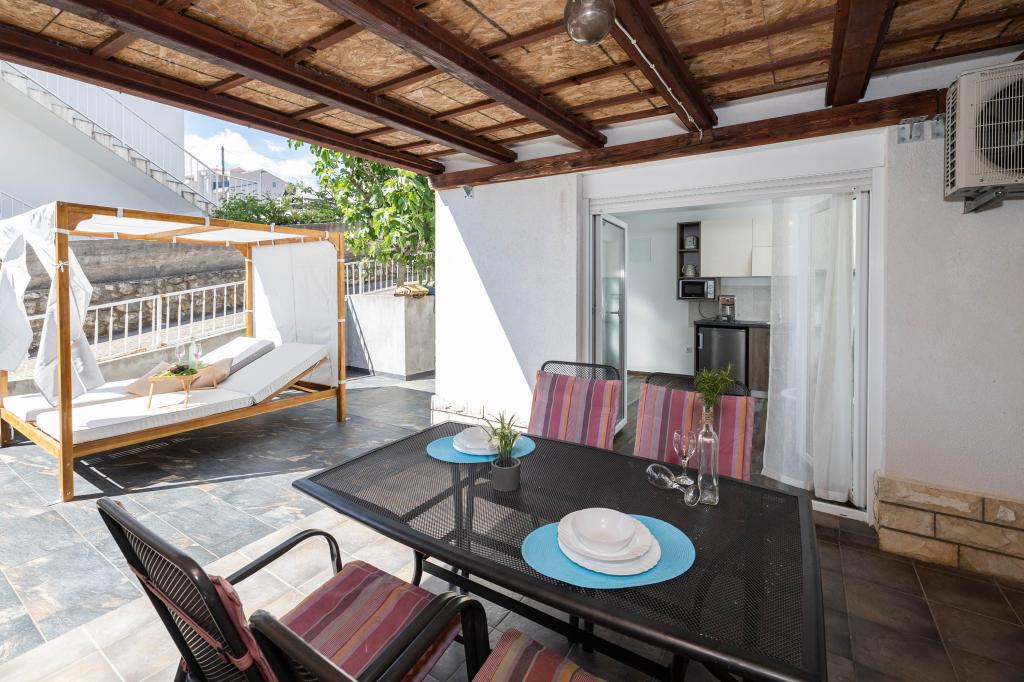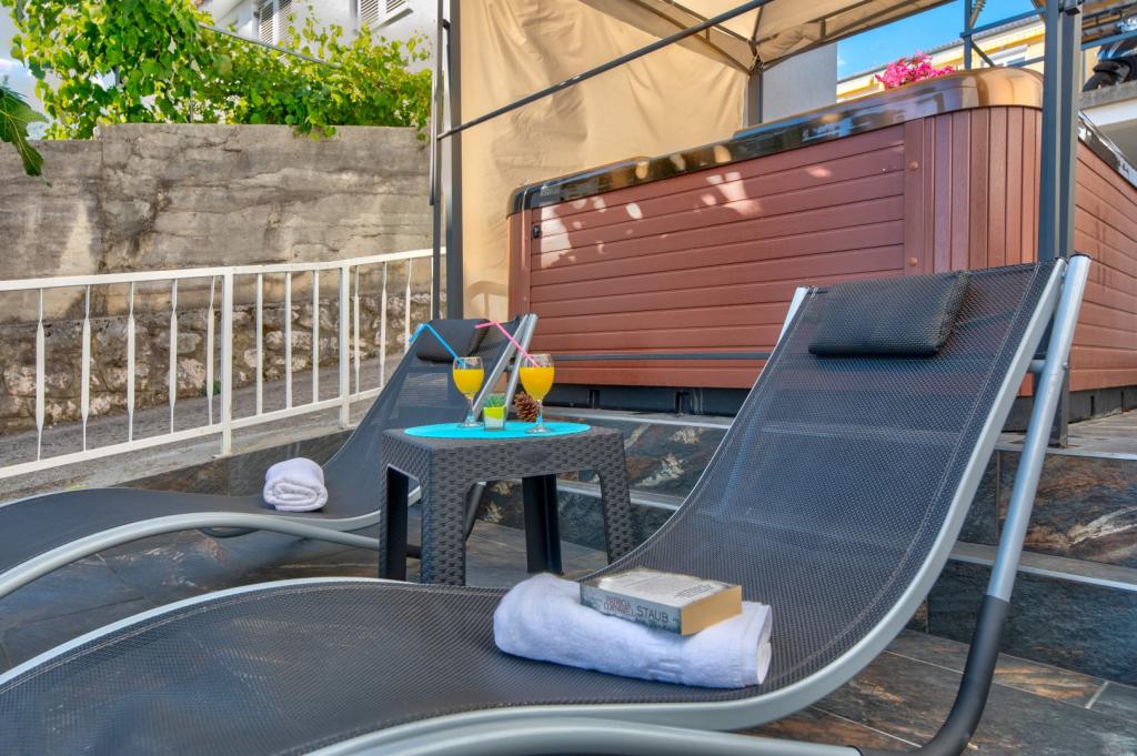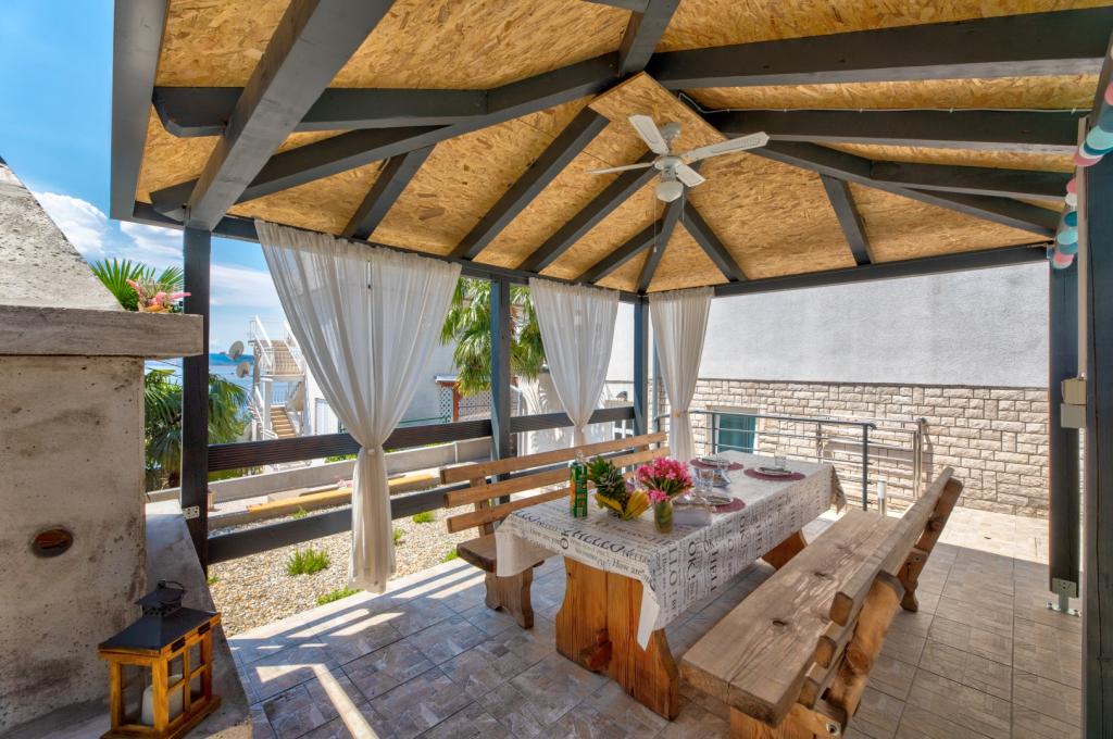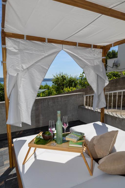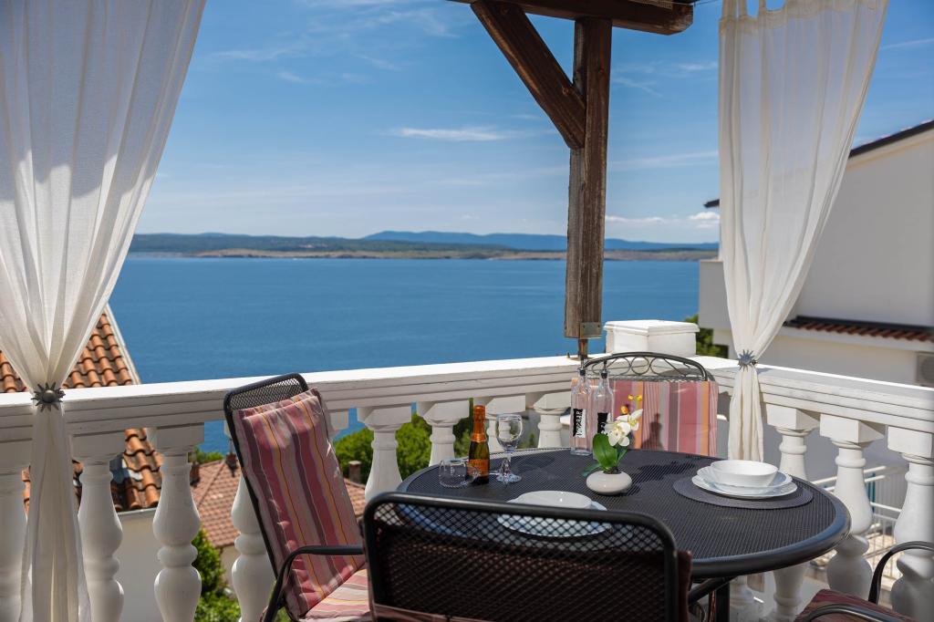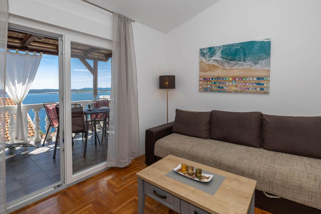 Nasz obiekt położony jest w drugim rzędzie od morza, co sprawia, że jest to idealne miejsce na relaksujący letni wypoczynek. Dom posiada sześć nowocześnie urządzonych apartamentów z widokiem na morze, wyposażonych tak, aby zapewnić przyjemny pobyt. Wszystkie apartamenty posiadają wyposażoną kuchnię z czajnikiem, ekspresem do kawy, tosterem i kuchenką mikrofalową. Łazienki wyposażone są w prysznic, toaletę i suszarkę do włosów. Na dziedzińcu znajdują się liczne udogodnienia umożliwiające relaks i rozrywkę. Do dyspozycji gości jest basen o wymiarach 7 x 3,5 m z leżakami, wanną z hydromasażem, prysznicem i altaną z grillem. Grill wyposażony jest w zlew i wszystkie niezbędne przybory kuchenne. W altanie znajduje się duży stół z dwiema ławkami, idealny na spotkania w większym gronie. W zadaszonej części podwórka znajduje się stół bilardowy, rzutki, gry planszowe i mała biblioteczka z książkami. Przed domem znajduje się zadaszony parking, na każdy apartament przypada jedno miejsce parkingowe. Apartamenty są rozmieszczone w następujący sposób: A1 i A2 na parterze, A3 na pierwszym piętrze, A5 na drugim piętrze oraz A7 i A8 na trzecim piętrze. Powitanie!!!