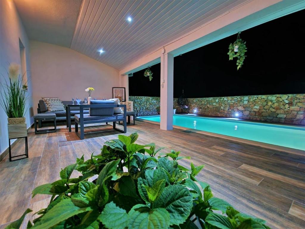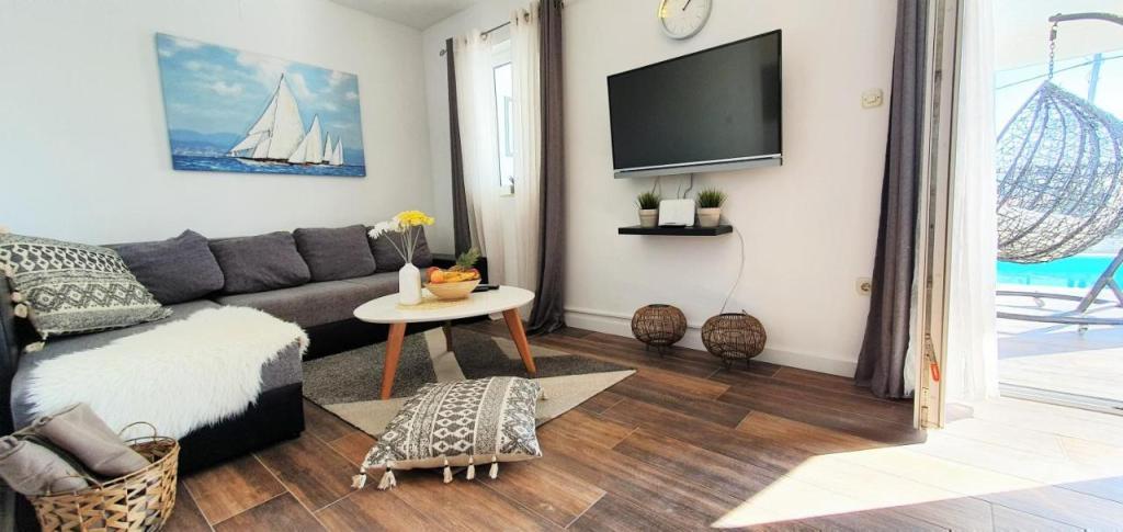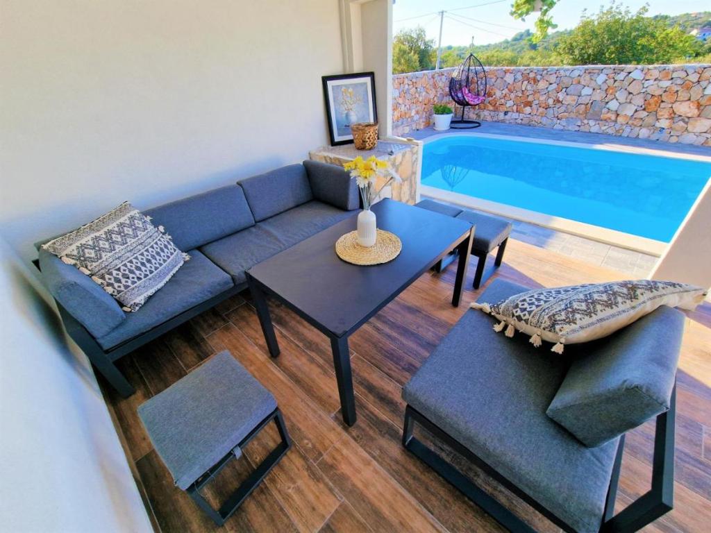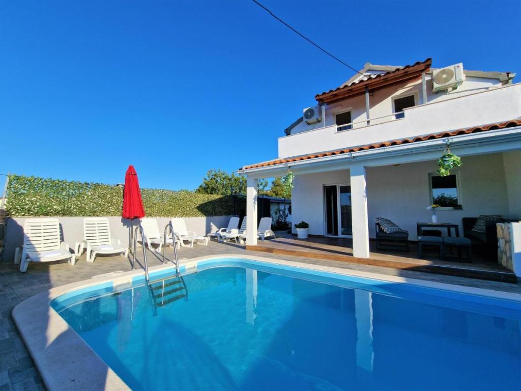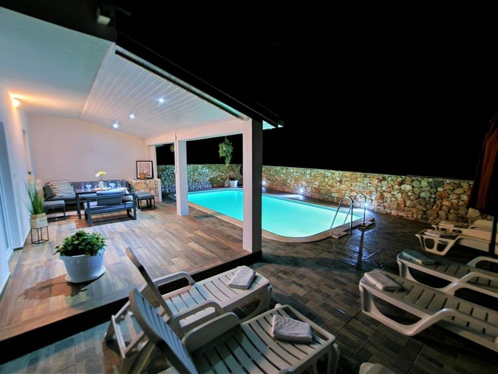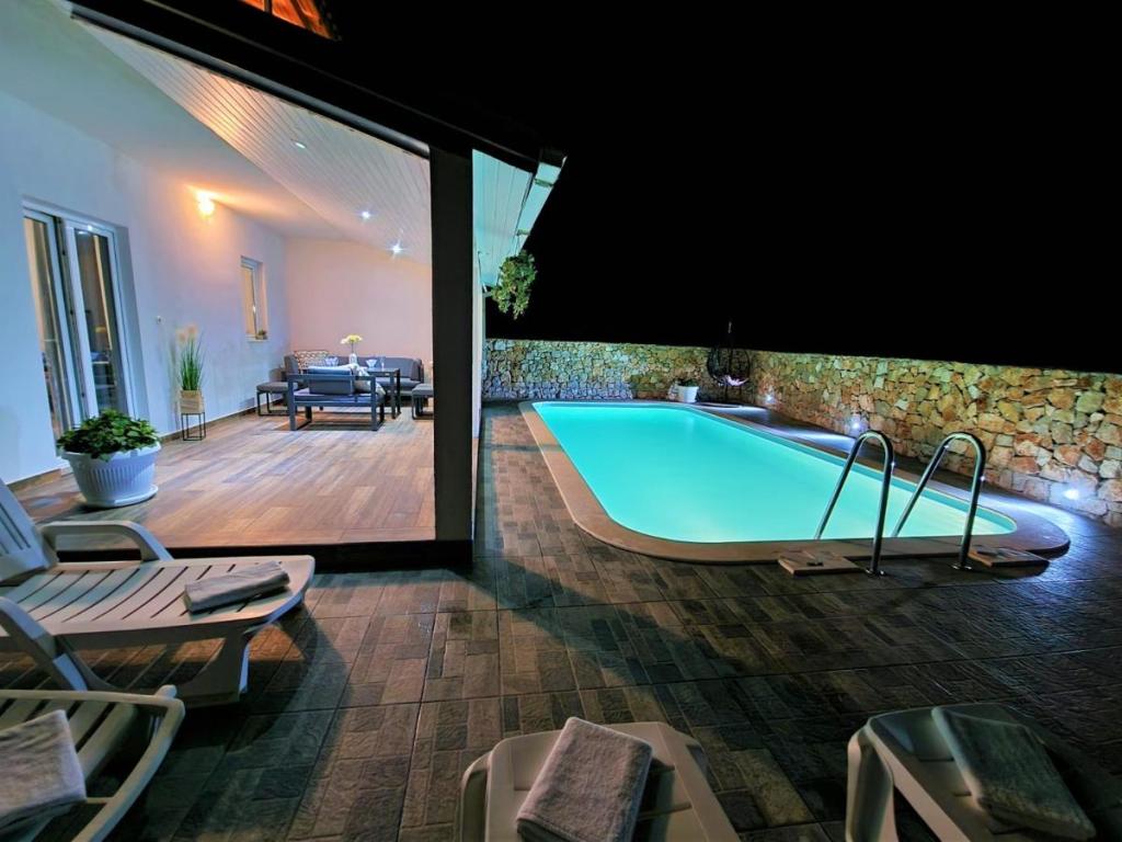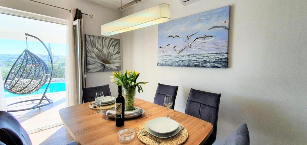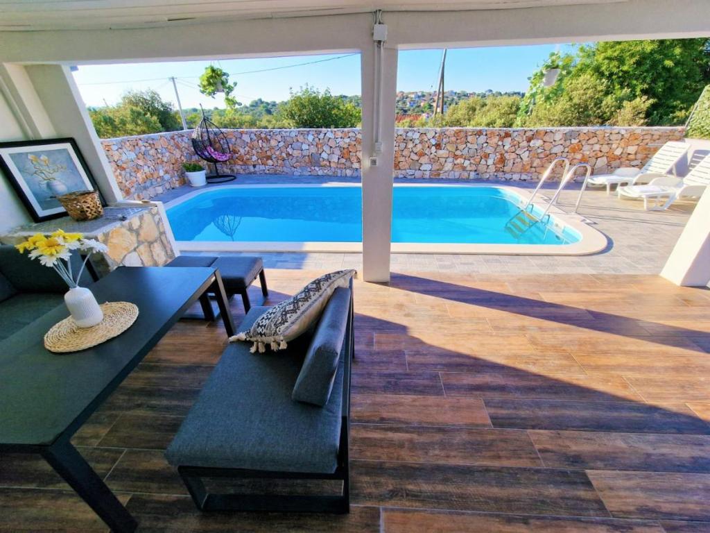 Dom wakacyjny Ana Laguna położony jest na wyspie Drvenik Mali niedaleko Trogiru i oferuje klimatyzowane pokoje z prywatnym basenem. Znajduje się 200 metrów od plaży Vela Rina. W domu znajdują się 3 sypialnie, 2 łazienki, pościel, ręczniki, telewizor z płaskim ekranem i dostępem do kanałów kablowych, jadalnia, w pełni wyposażona kuchnia oraz balkon z widokiem na basen. Goście mogą zjeść posiłek w jadalni na świeżym powietrzu z widokiem na ogród.