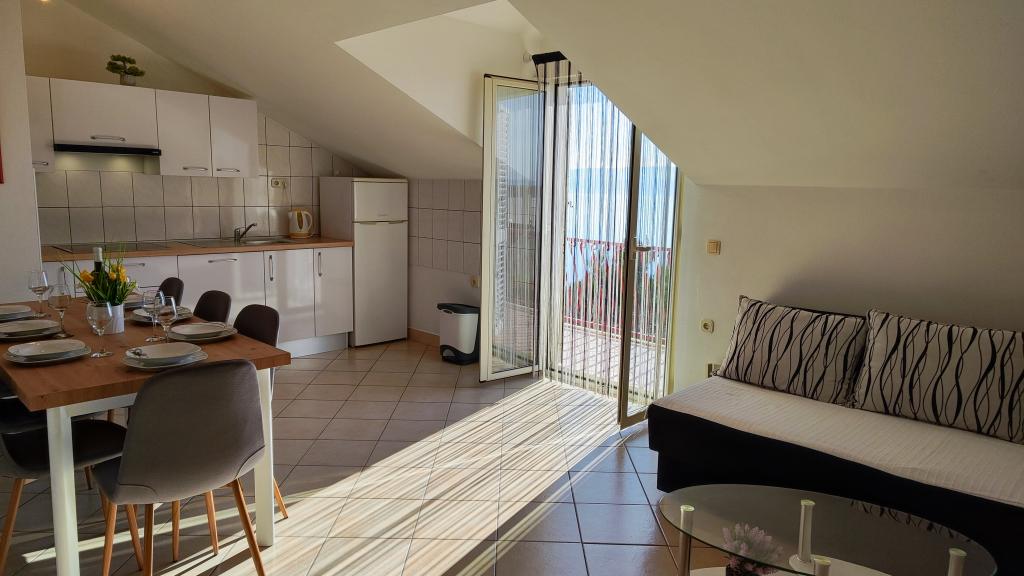 Mieszkaliśmy w apartamencie A2+2 OD 08-15.08.2024. Ładnie, schludnie i czysto. Identyczny jak w reklamie. Nowocześnie urządzone. Przed apartamentem znajduje się duży taras, który zapewnia cień przez cały dzień. Piękny trawnik, zieleń z kwiatami i palmą, naprawdę ładnie to wygląda. Oczywiście widok na morze Gospodarze bardzo mili i mili. Dostępne, jeśli czegoś potrzebujesz, a jednocześnie dyskretne. Plaża jest piękna i czysta, jest zarówno słońce, jak i cień. Może wybrać to, co mu się podoba. Trochę czasu zajęło nam przyzwyczajenie się do chodzenia pod górę po powrocie z plaży, ale są skróty, więc i to opanowaliśmy, Lokalizacja jest świetna, do Splitu i Omiša można dojechać w 15-20 minut. Autobusem lub samochodem. Rekomendacja dla restauracji Terapia na plaży.