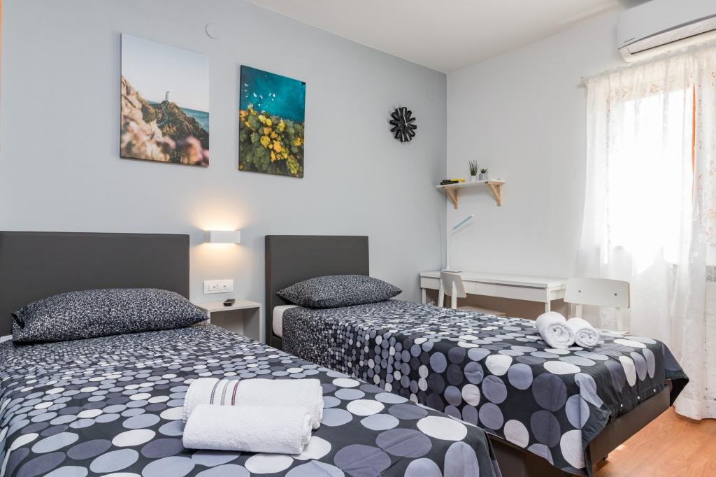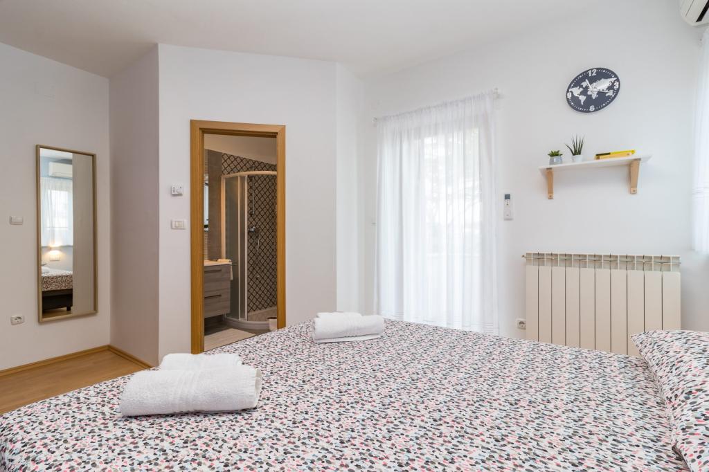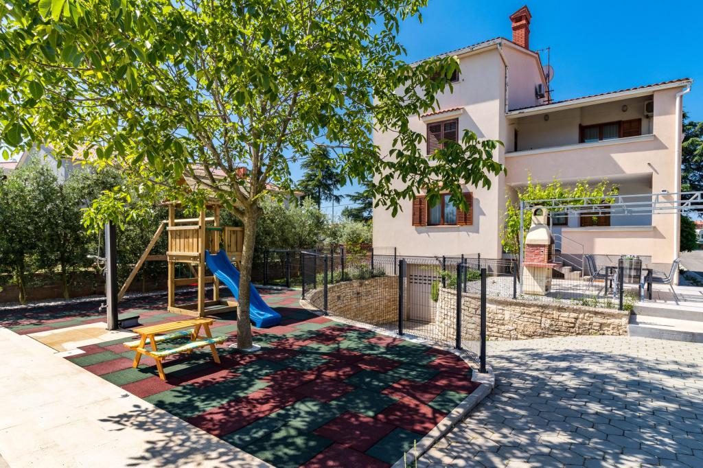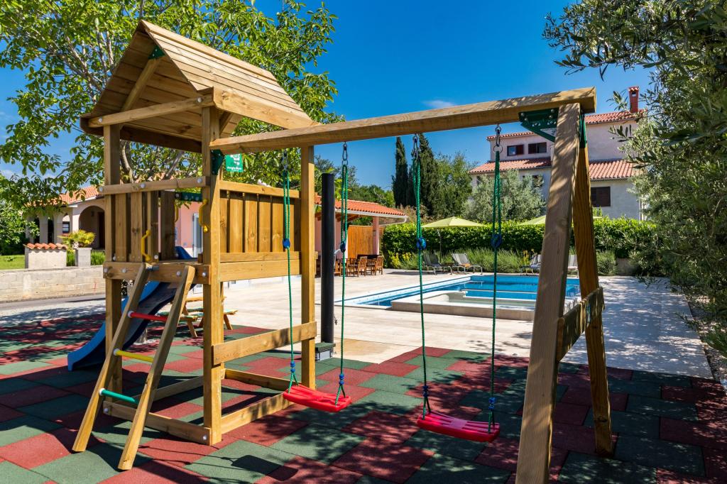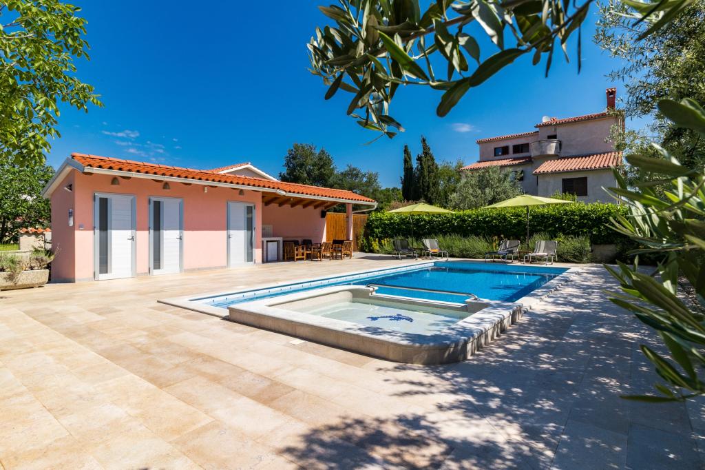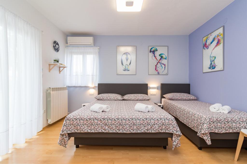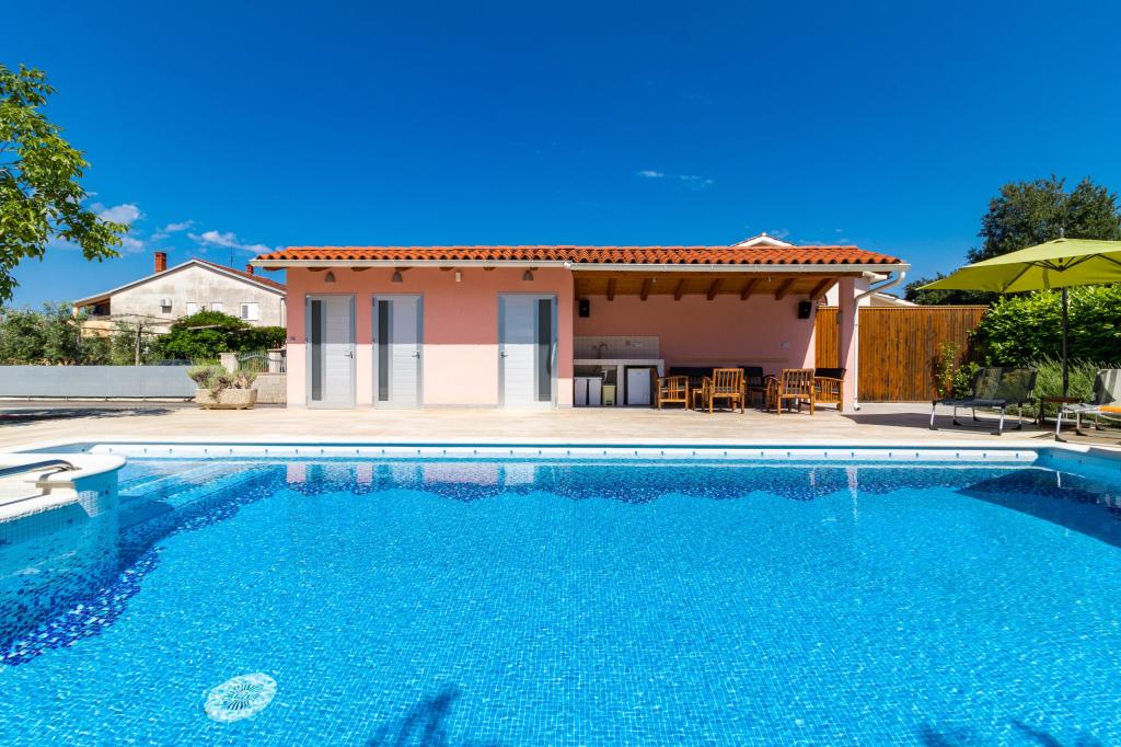 W pełni wyposażony apartament dla 8 osób, z trzema sypialniami i łazienkami, zaledwie 800 m od plaży. Prywatny basen ze słoną wodą, plac zabaw dla dzieci i grill sprawią, że Twoje wakacje będą niezapomniane. Każda sypialnia posiada własną telewizję satelitarną, klimatyzację i ogrzewanie, kuchnia jest w pełni wyposażona, dostępny jest również parking i bezpłatny bezprzewodowy dostęp do Internetu. Apartament znajduje się pomiędzy małym miasteczkiem rybackim Fažana i starożytną Pulą, w pobliżu Parku Narodowego Brijuni.