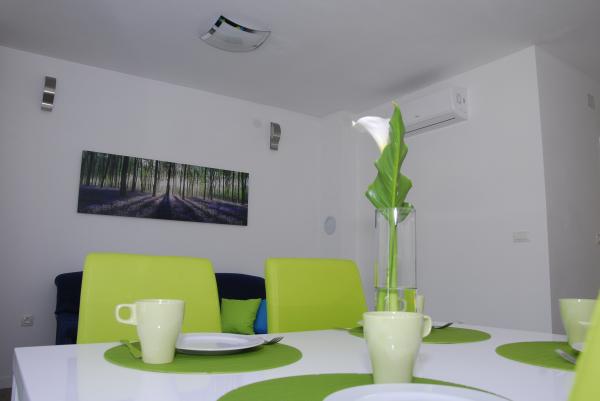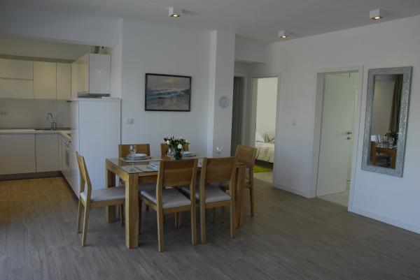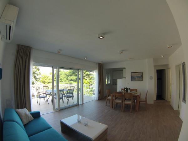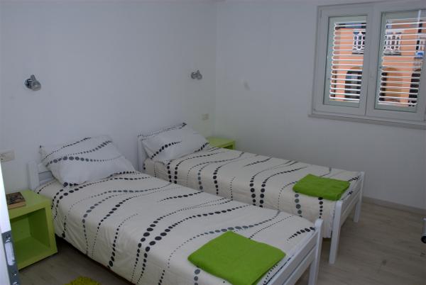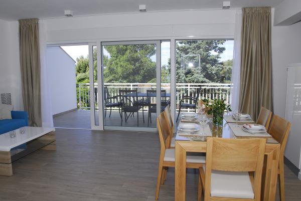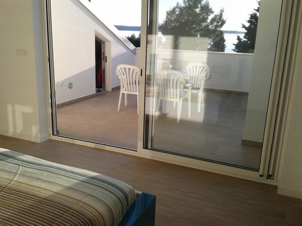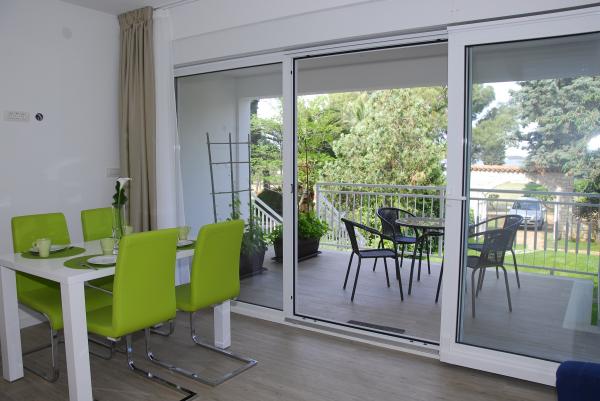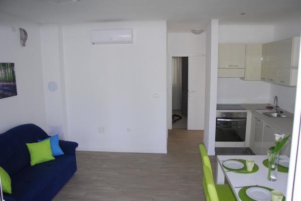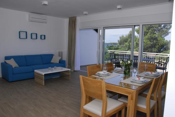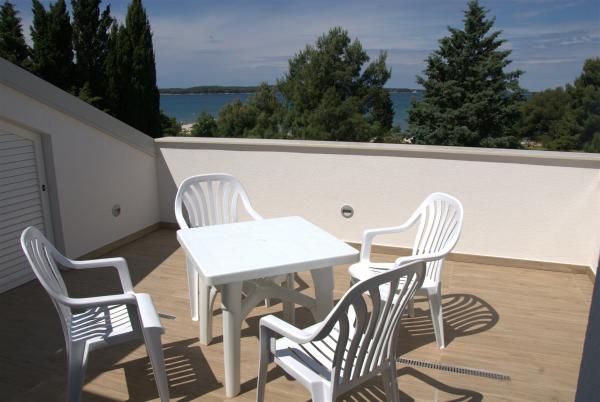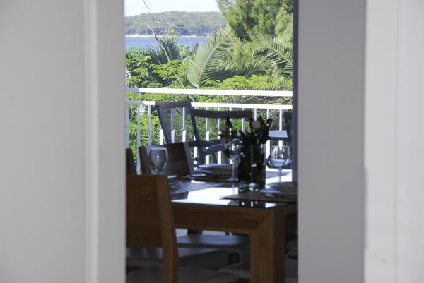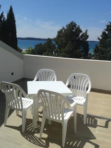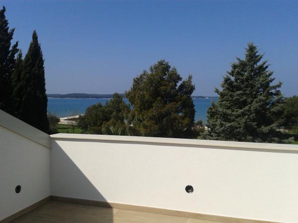 3 całkowicie nowo wybudowany i nowoczesne apartamenty znajdują się w pierwszym rzędzie do morza, znajduje się w spokojnej okolicy, Fazana, w zieleni, z idyllicznym widokiem na morze i Wyspy Brijuni. Znajdują się one w odległości zaledwie 50 metrów od plaży. Z przodu jest chodnik i trawnik i plaża. Parking znajduje się przed domem. Samochód jest używany tylko do podróży, gdyż wszystko to jest w bezpośrednim sąsiedztwie. Apartamenty są odpowiednie dla rodzin z dziećmi, ponieważ jest w pobliżu plac zabaw dla dzieci (60 mln), a ze względu na odległość od dróg. W bezpośrednim sąsiedztwie znajdują się obiekty sportowe; siatkówka plażowa, żeglarstwo, windsurfing, kolarstwo górskie szlaków ... Wszystkie trzy apartamenty posiadają duże tarasy (20 m2) z widokiem na morze.