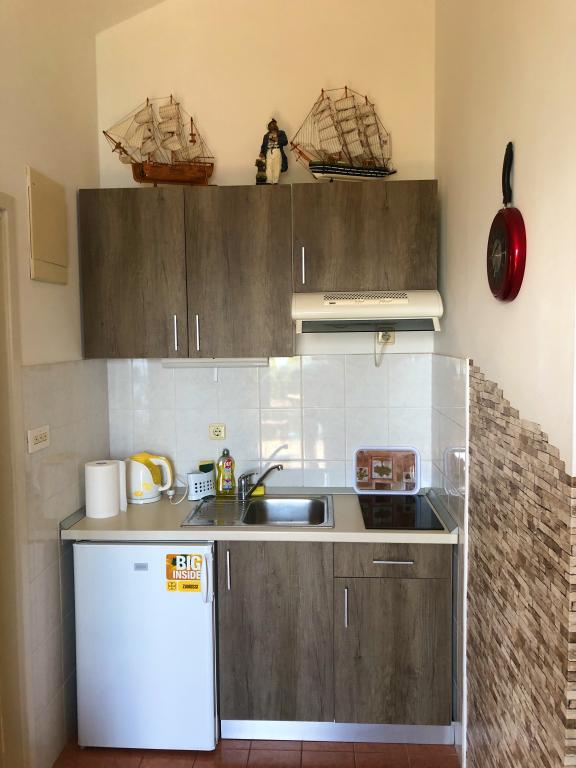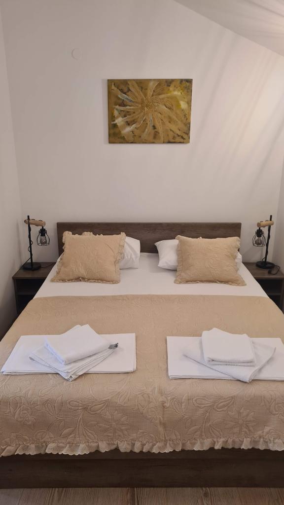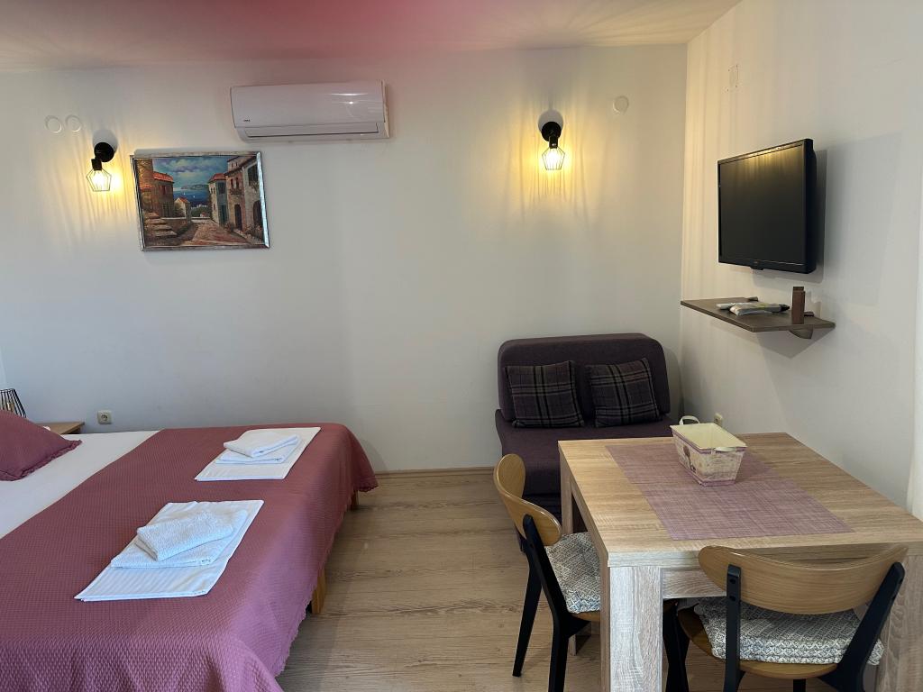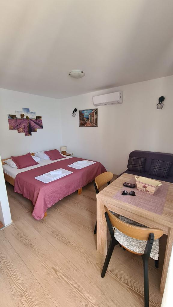 Dom wakacyjny, pierwszy rząd do morza. W domu znajdują się dwa apartamenty typu studio z łóżkiem podwójnym i dodatkowym łóżkiem. Maksymalna ilość osób 4 osoby dorosłe + 2 dzieci. Górne Studio posiada balkon z pięknym otwartym widokiem na morze. Dolne Studio posiada taras o powierzchni 25 m2 ze stołem jadalnym i pięknym widokiem na morze. Oba apartamenty posiadają własną mini kuchnię i łazienkę z toaletą. Bezpłatny internet dostępny w całym obiekcie. Darmowy parking. Dom jest wynajmowany w całości, a gość ma pełną prywatność. Właściciel mieszka w pobliżu.