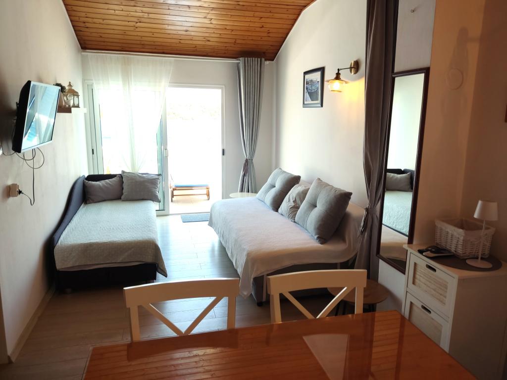 Dom znajduje się w super lokalizacji - kilka metrów od morza. Byliśmy trzyrodzinnymi rodzinami – cały dom należał do nas. Mieliśmy własne morze, leżaki, parasole, duże podwórko i kuchnię na zewnątrz - wszystko było w cenie tych apartamentów. Wszystko było czyste, wystarczająco dużo miejsca. Właściciel był niesamowity i bardzo pomocny. Spotkał nas z powitalnymi zimnymi napojami, polecanymi miejscami na obiad. Przed wyjazdem wysłał zdjęcia z wodą, plażą dla dzieci itp. o co prosiliśmy. W tym miejscu nie ma żadnych sklepów, ale codziennie są tutejsi ludzie, którzy codziennie rano przywozili chleb, lody i warzywa.