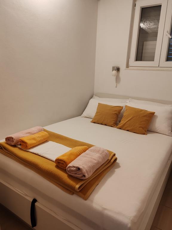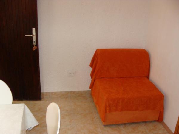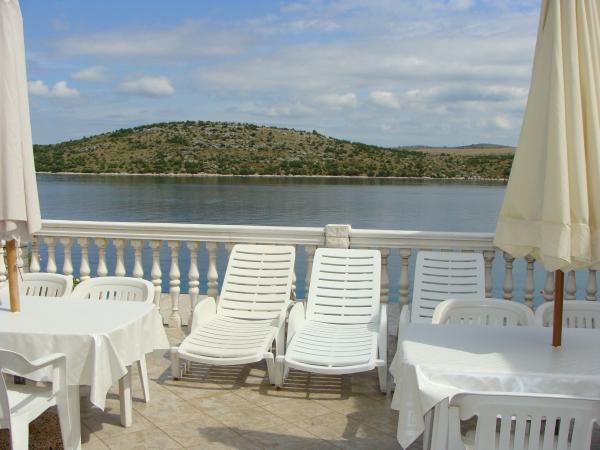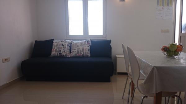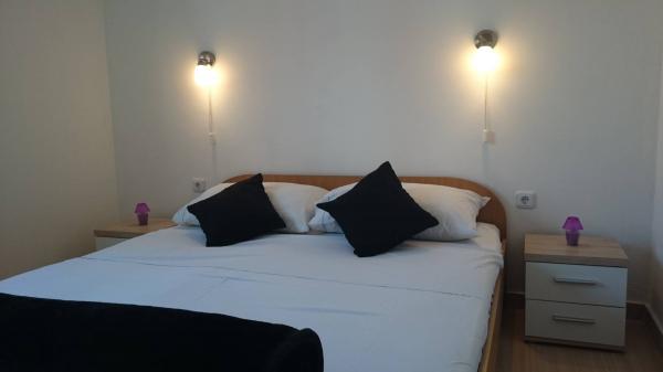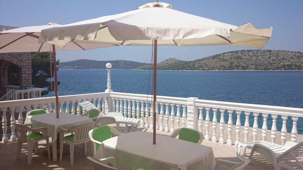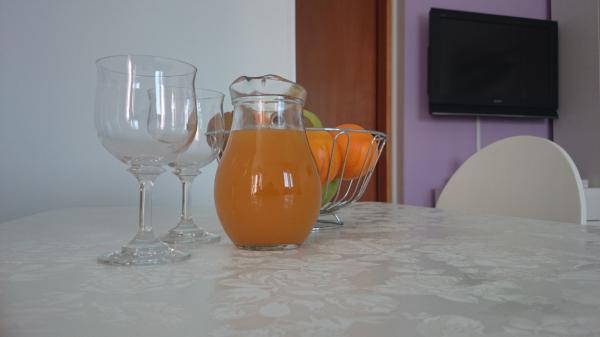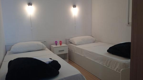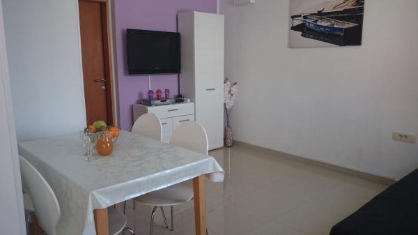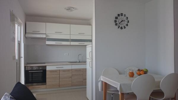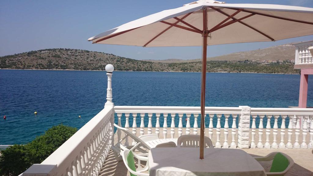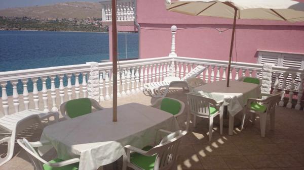 Apartamenty położone 7 metrów od morza dla 7-8 osób, z tarasem o powierzchni 34 m² i widokiem na morze. Apartamenty posiadają kuchnię z przyborami kuchennymi i naczyniami do serwowania, salon z rozkładaną sofą do wypoczynku lub spania, telewizję satelitarną, klimatyzację, dostęp do internetu, 3 sypialnie (2 dwuosobowe i 1 trzyosobowa) z ręcznikami i pościelą, dostawką, łazienką z prysznicem, toaletą i pralką oraz grillem. Na tarasie znajdują się meble ogrodowe dla 8 osób, leżaki, 2 rowery, parking. Plaża znajduje się 7 metrów od apartamentu. Przed apartamentem znajduje się mobilny market (minibus), który zaopatruje nas w podstawowe produkty. To idealne miejsce na wakacje z dziećmi, rodziną lub przyjaciółmi.