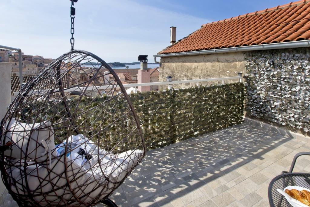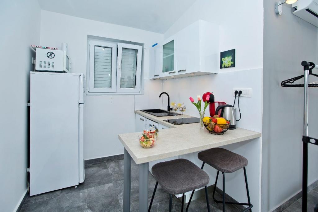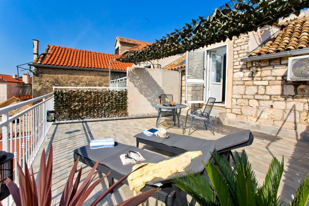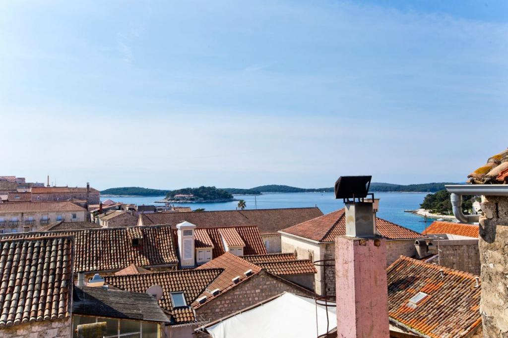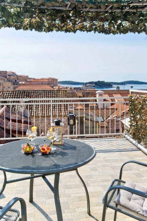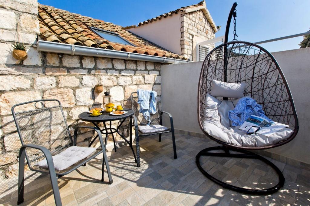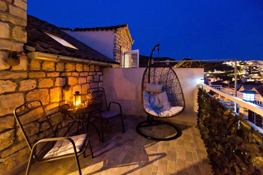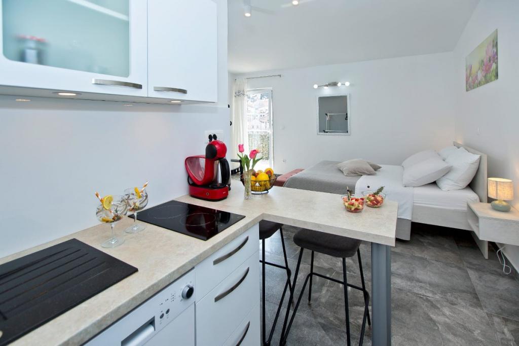 Elegancko urządzone apartamenty typu studio, położone w samym sercu Hvaru, oferują idealne połączenie komfortu i doskonałej lokalizacji. Jasne i nowoczesne apartamenty wyposażone są w wygodne łóżko podwójne (160 × 200), w pełni wyposażoną kuchnię ze wszystkimi niezbędnymi udogodnieniami (lodówka z zamrażarką, czajnik, toster, płyta grzewcza, kuchenka mikrofalowa, zmywarka), łazienki z kabiną prysznicową, klimatyzację oraz prywatne tarasy (stół, krzesła i leżaki ogrodowe) z hipnotyzującym widokiem na starówkę i piękny port Hvar. Odkryj to, co najlepsze w Hvarze, dosłownie na wyciągnięcie ręki: urocze kawiarnie, znakomite restauracje, przytulne śniadaniownie, lokalne butiki i sklepy z pamiątkami. Główny plac miasta z katedrą św. Szczepana i najstarszym teatrem publicznym w Europie znajduje się zaledwie 3 minuty spacerem od Twoich drzwi. Zatrzymasz się w samym centrum Hvaru, a jednocześnie przy idealnie zacisznej ulicy, która zapewni Ci spokojny i przyjemny sen.