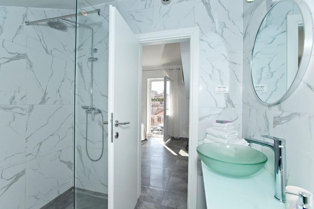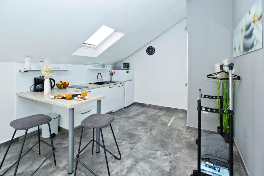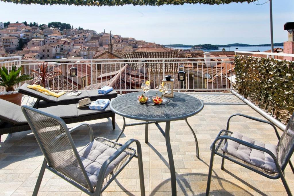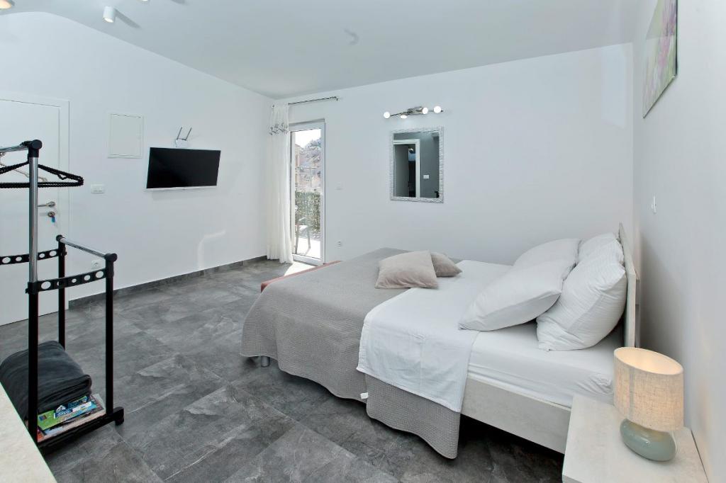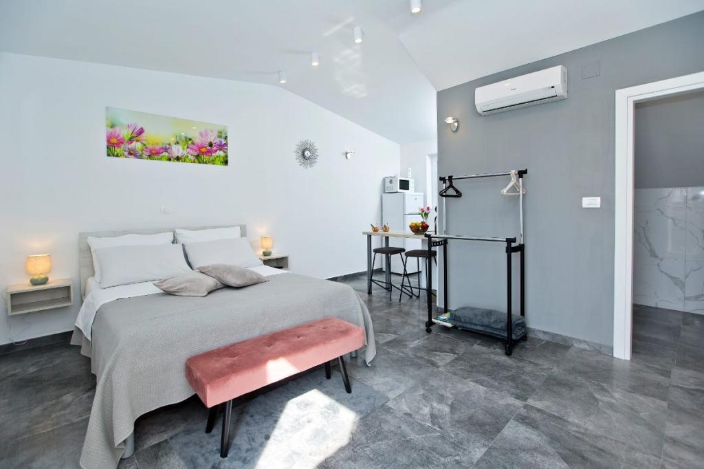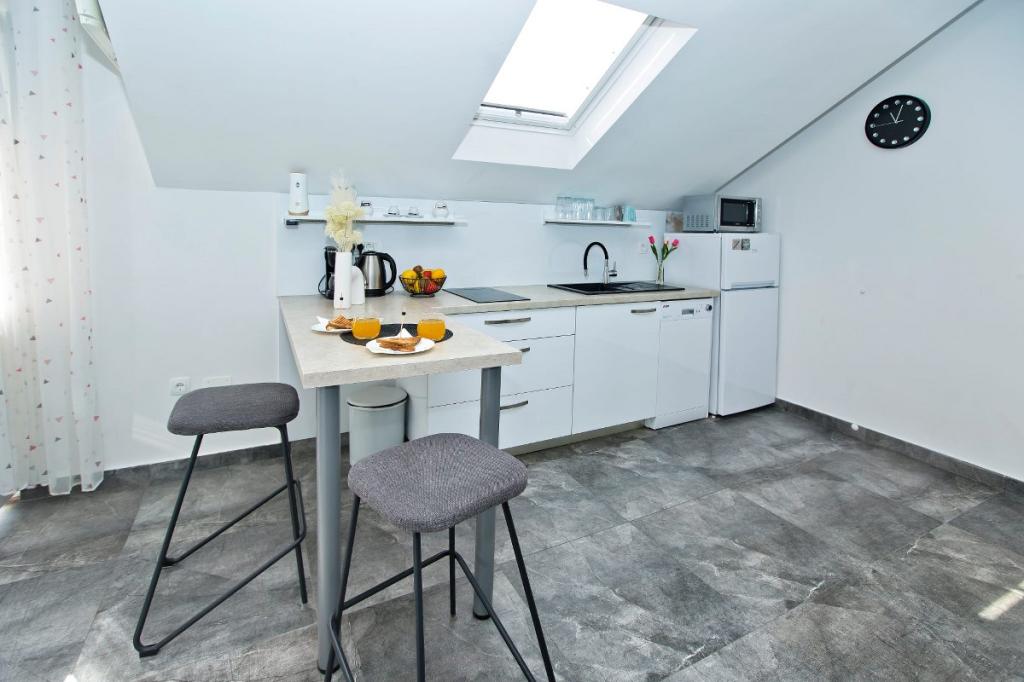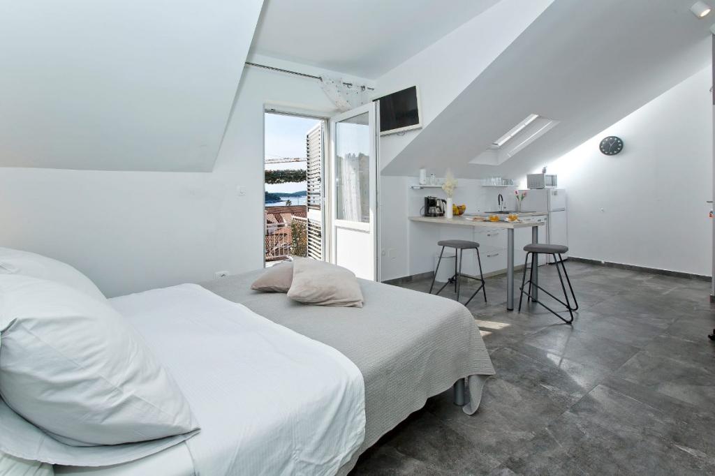 Elegancko urządzone apartamenty typu studio, położone w samym sercu Hvaru, oferują idealne połączenie komfortu i doskonałej lokalizacji. Jasne i nowoczesne apartamenty wyposażone są w wygodne łóżko podwójne (160 × 200), w pełni wyposażoną kuchnię ze wszystkimi niezbędnymi udogodnieniami (lodówka z zamrażarką, czajnik, toster, płyta grzewcza, kuchenka mikrofalowa, zmywarka), łazienki z kabiną prysznicową, klimatyzację oraz prywatne tarasy (stół, krzesła i leżaki ogrodowe) z hipnotyzującym widokiem na starówkę i piękny port Hvar. Odkryj to, co najlepsze w Hvarze, dosłownie na wyciągnięcie ręki: urocze kawiarnie, znakomite restauracje, przytulne śniadaniownie, lokalne butiki i sklepy z pamiątkami. Główny plac miasta z katedrą św. Szczepana i najstarszym teatrem publicznym w Europie znajduje się zaledwie 3 minuty spacerem od Twoich drzwi. Zatrzymasz się w samym centrum Hvaru, a jednocześnie przy idealnie zacisznej ulicy, która zapewni Ci spokojny i przyjemny sen.