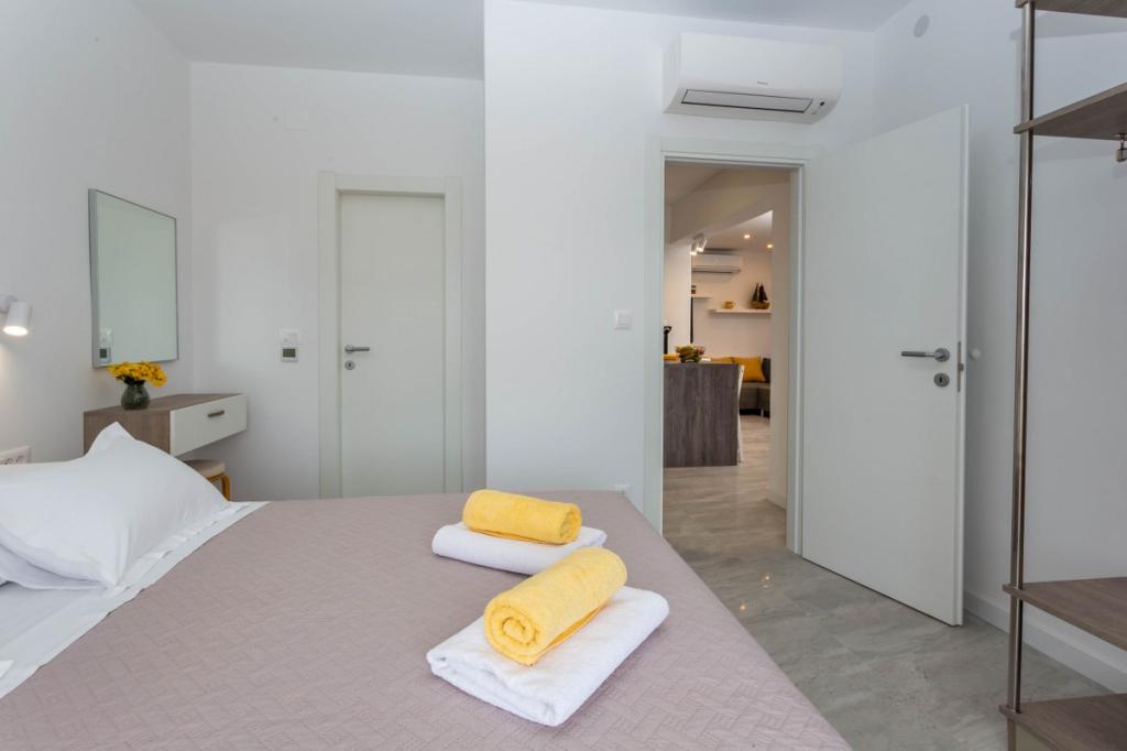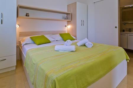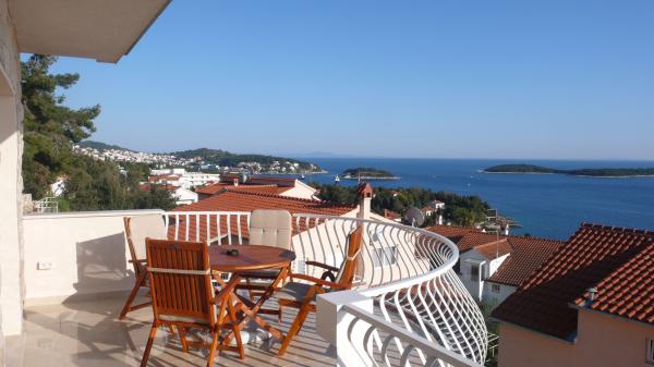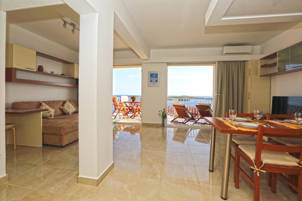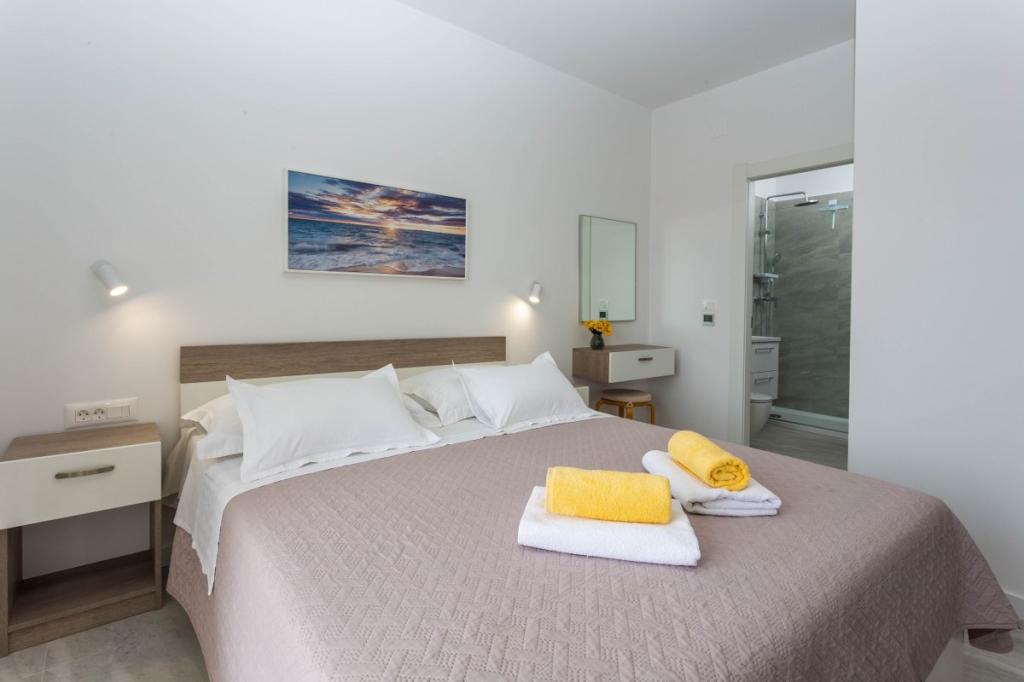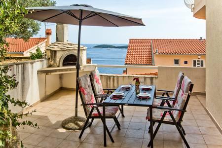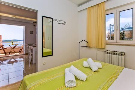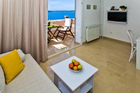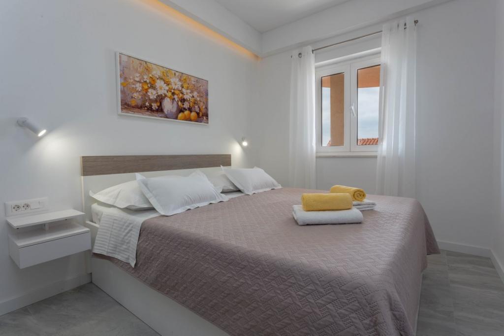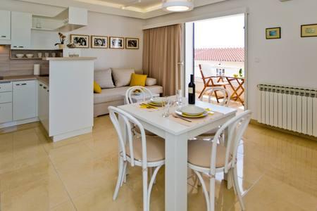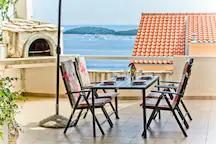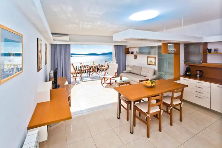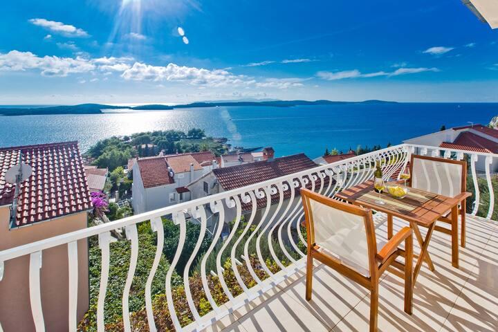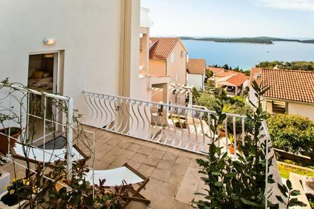 Nowoczesne i nowoczesne apartamenty Dominis z niesamowitym, 180-stopniowym, panoramicznym widokiem, który zapiera dech w piersiach. Oferujemy naszym gościom 4 nowoczesne apartamenty, w pełni wyposażone we wszystkie niezbędne udogodnienia, zapewniające przyjemny wypoczynek: apartament Blue Peace (4 gwiazdki), apartament Blue Horizon (4 gwiazdki), apartament White (4 gwiazdki) i apartament Green (3 gwiazdki). Apartamenty wyposażone są w pralki lub zmywarki, telewizję satelitarną, klimatyzację i szybkie łącze Wi-Fi. Do dyspozycji gości jest parking dla samochodów oraz grill, na którym można przygotować różnorodne rybne i mięsne przysmaki. Ciesz się wschodami i zachodami słońca z naszych przestronnych tarasów w towarzystwie bliskich, słuchając jedynie szumu morza. A gdy zechcesz uciec od miejskiego zgiełku, przyjemny spacer zaprowadzi Cię do centrum miasta w zaledwie 15 minut. W upalne letnie dni poszukaj orzeźwienia w czystym morzu na plażach, zaledwie 5 minut spacerem od naszego domu. WITAMY!!!