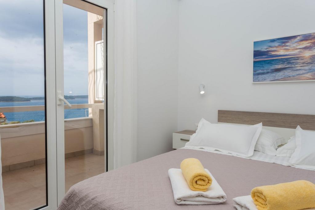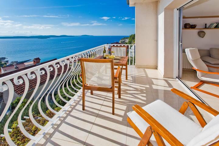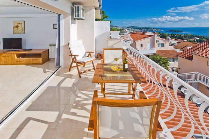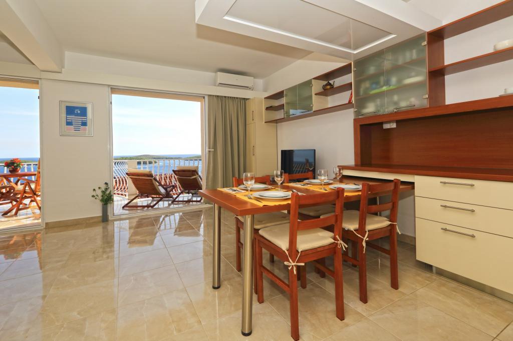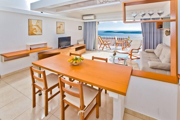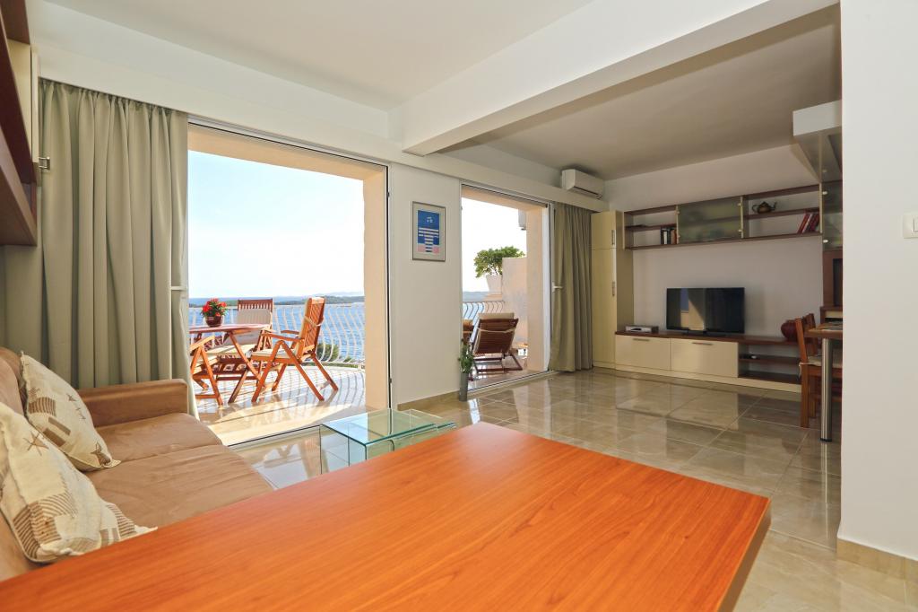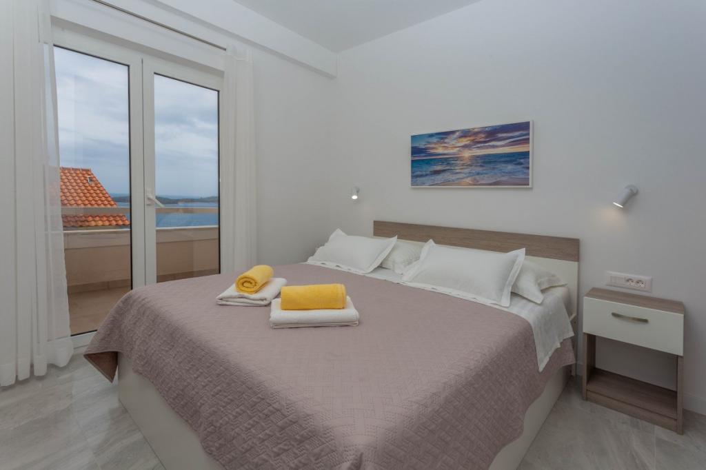 Nowoczesne i nowoczesne apartamenty Dominis z niesamowitym, 180-stopniowym, panoramicznym widokiem, który zapiera dech w piersiach. Oferujemy naszym gościom 4 nowoczesne apartamenty, w pełni wyposażone we wszystkie niezbędne udogodnienia, zapewniające przyjemny wypoczynek: apartament Blue Peace (4 gwiazdki), apartament Blue Horizon (4 gwiazdki), apartament White (4 gwiazdki) i apartament Green (3 gwiazdki). Apartamenty wyposażone są w pralki lub zmywarki, telewizję satelitarną, klimatyzację i szybkie łącze Wi-Fi. Do dyspozycji gości jest parking dla samochodów oraz grill, na którym można przygotować różnorodne rybne i mięsne przysmaki. Ciesz się wschodami i zachodami słońca z naszych przestronnych tarasów w towarzystwie bliskich, słuchając jedynie szumu morza. A gdy zechcesz uciec od miejskiego zgiełku, przyjemny spacer zaprowadzi Cię do centrum miasta w zaledwie 15 minut. W upalne letnie dni poszukaj orzeźwienia w czystym morzu na plażach, zaledwie 5 minut spacerem od naszego domu. WITAMY!!!