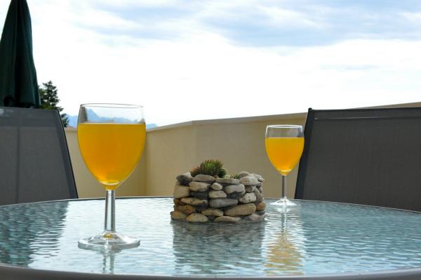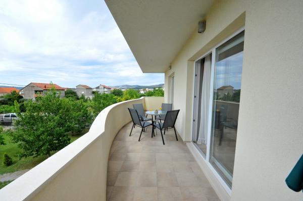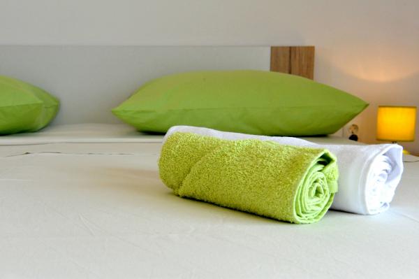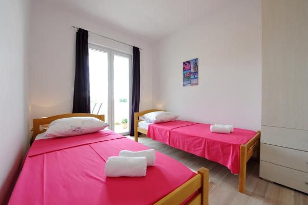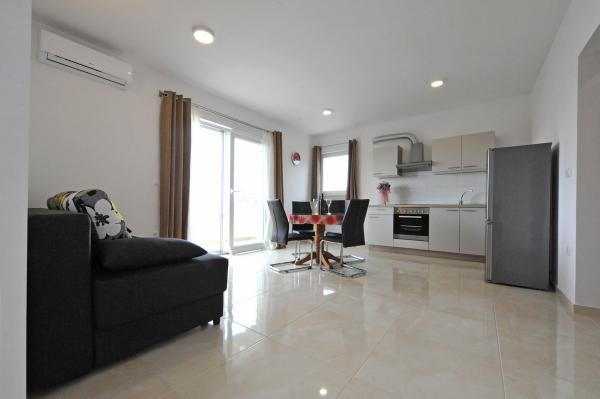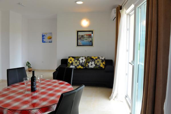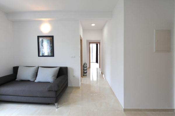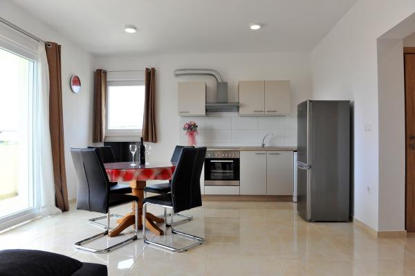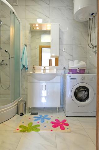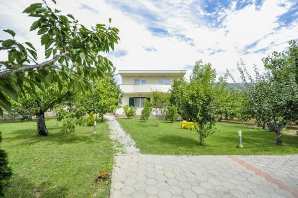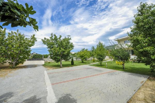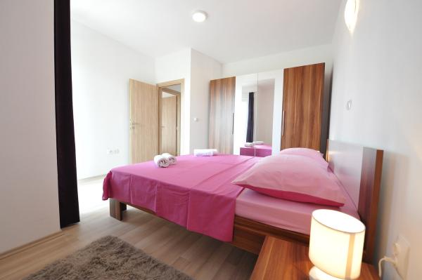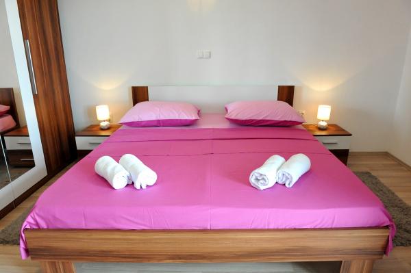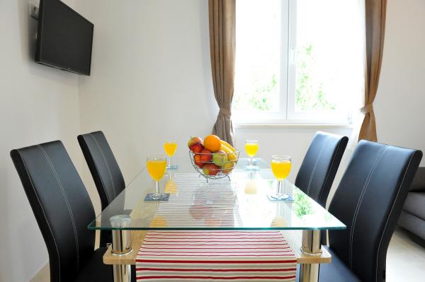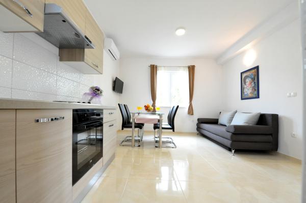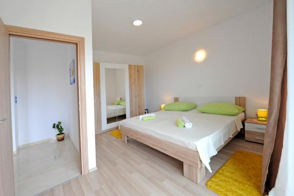 Nowoczesny nowo wybudowany dom z nowocześnie urządzonymi i urządzonymi apartamentami. Dom położony jest w spokojnej okolicy, idealny na rodzinne wakacje, z dużym trawnikiem, ogrodem i drzewami owocowymi. Apartamenty posiadają w pełni wyposażoną kuchnię ze zmywarką, pokój dzienny, TV, łazienka z prysznicem. Goście mają bezpłatny parking i wifi.