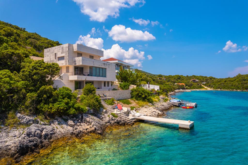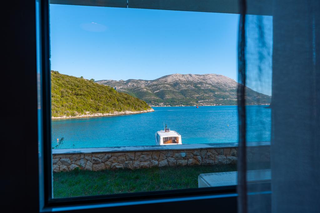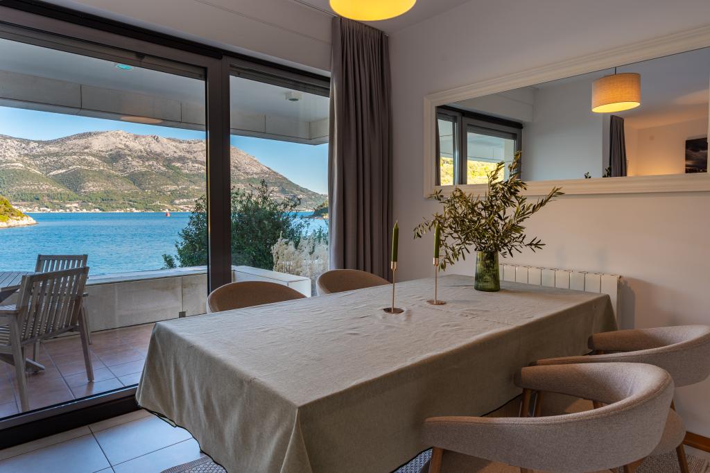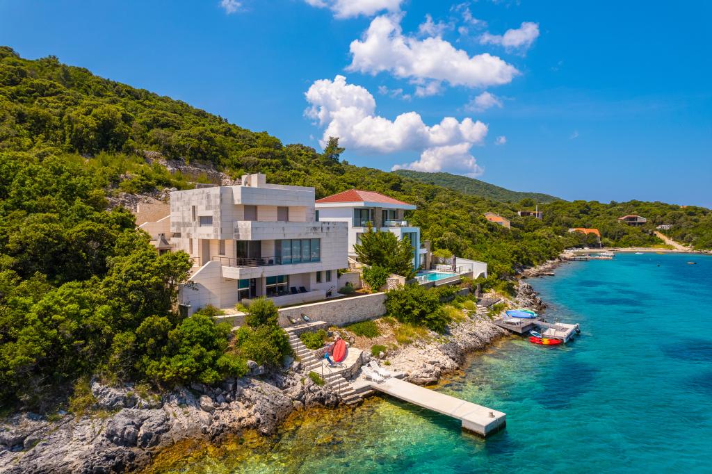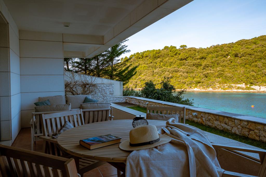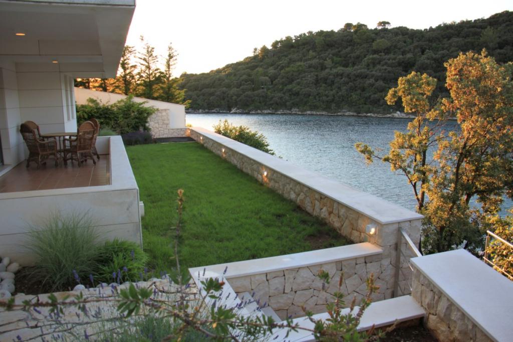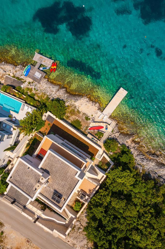 Villa Avantgarde - apartament bezpośrednio nad morzem dla 4 osób - bardzo cicha zatoka - wyspa Korčula - Chorwacja Jest dziełem znanego chorwackiego i światowej sławy architekta. Położony jest w spokojnej zatoce, ok. 4 km od centrum miasta. W willi mają Państwo do dyspozycji komfortowe mieszkanie o powierzchni ok. 100 m2, na który składają się 2 sypialnie, łazienka oraz salon z dobrze wyposażoną kuchnią, jadalnią i salonem, z którego jest wyjście na przestronny taras z bezpośrednim wyjściem na prywatną plażę. Plaża znajduje się 9 m od apartamentu. W Willi jest tylko jedno mieszkanie do wynajęcia. Jest otoczony zadbanymi trawnikami, zielenią, śpiewem ptaków i morzem. Do dyspozycji gości jest zamknięty prywatny parking. Sypialnia, pokój dzienny, jadalnia i taras wychodzą bezpośrednio na morze. Można z niego korzystać przez cały rok, gdyż wyposażony jest w centralne ogrzewanie.