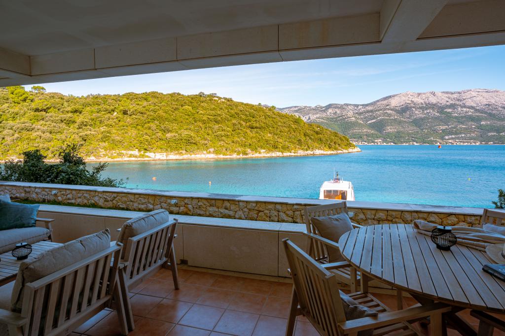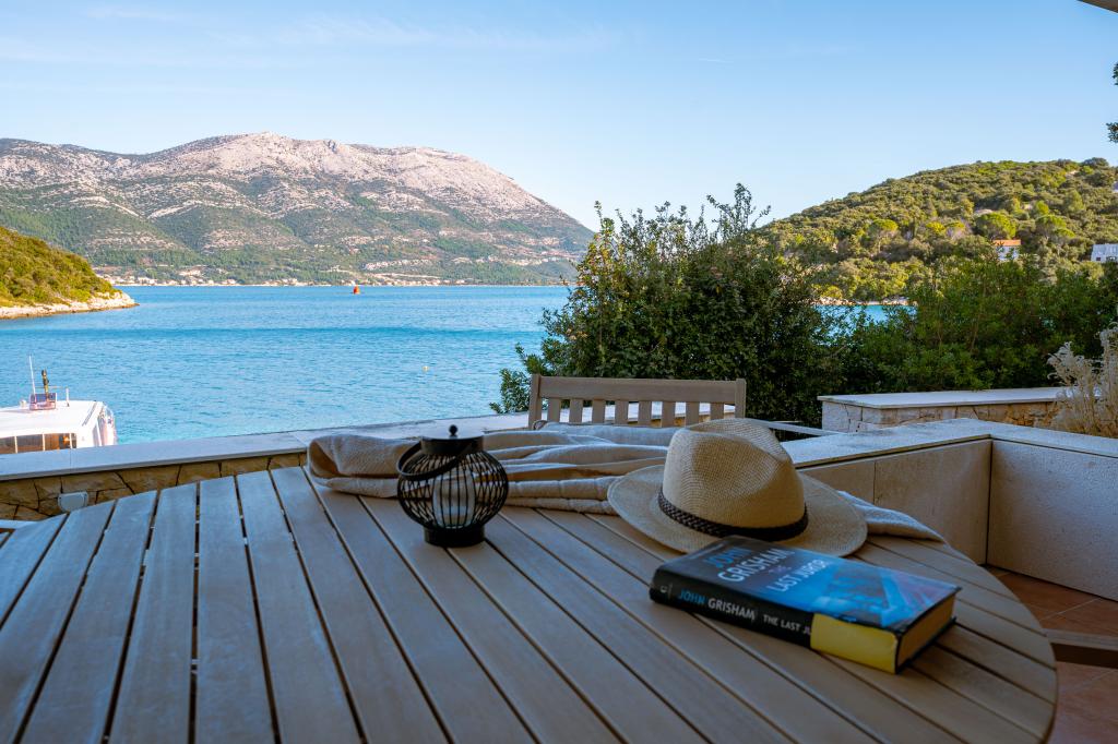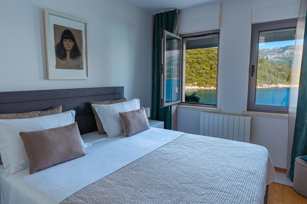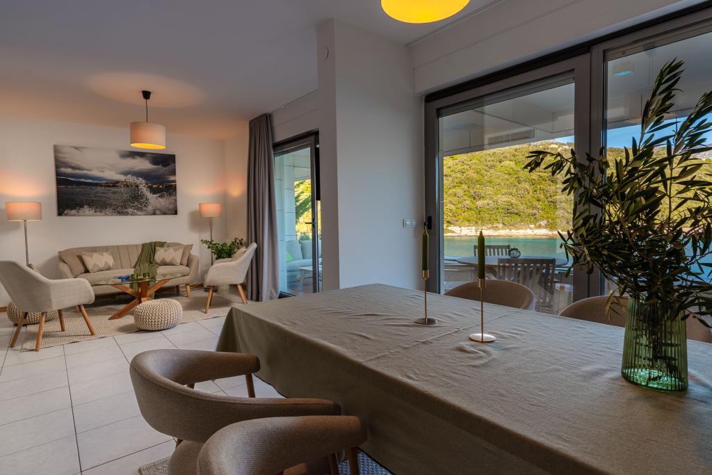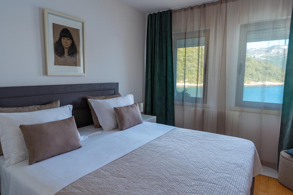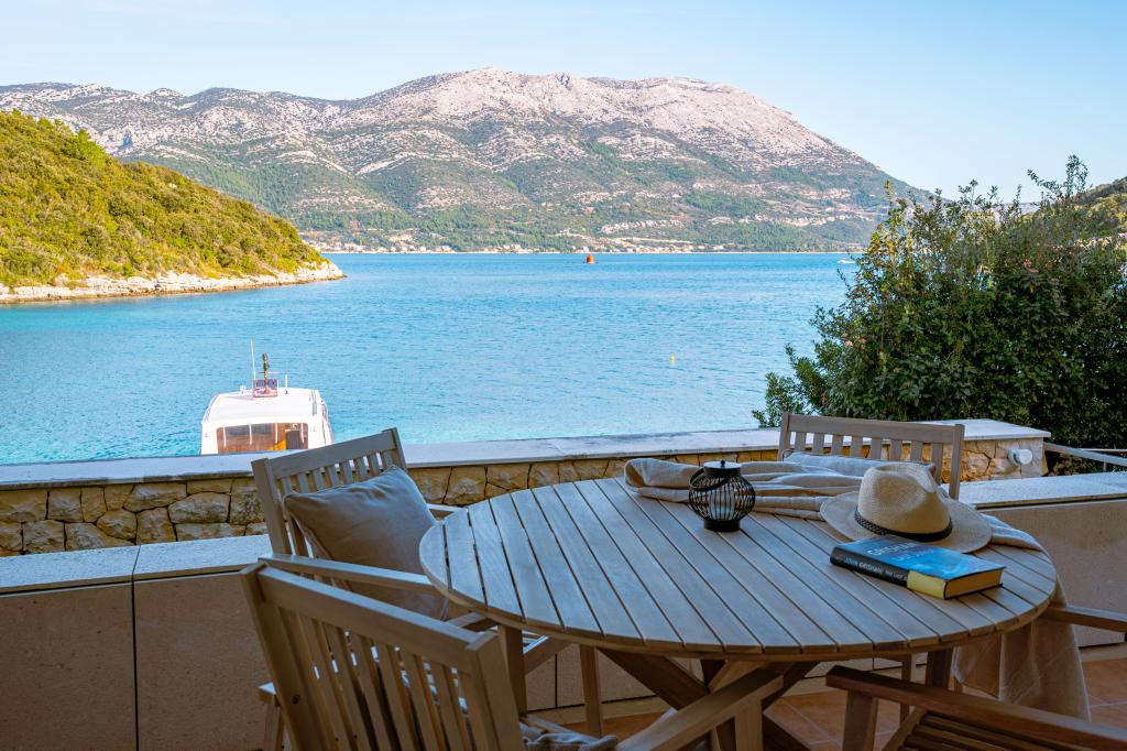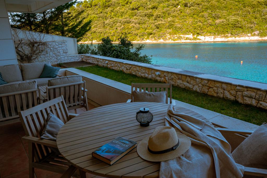 Villa Avantgarde - apartament bezpośrednio nad morzem dla 4 osób - bardzo cicha zatoka - wyspa Korčula - Chorwacja Jest dziełem znanego chorwackiego i światowej sławy architekta. Położony jest w spokojnej zatoce, ok. 4 km od centrum miasta. W willi mają Państwo do dyspozycji komfortowe mieszkanie o powierzchni ok. 100 m2, na który składają się 2 sypialnie, łazienka oraz salon z dobrze wyposażoną kuchnią, jadalnią i salonem, z którego jest wyjście na przestronny taras z bezpośrednim wyjściem na prywatną plażę. Plaża znajduje się 9 m od apartamentu. W Willi jest tylko jedno mieszkanie do wynajęcia. Jest otoczony zadbanymi trawnikami, zielenią, śpiewem ptaków i morzem. Do dyspozycji gości jest zamknięty prywatny parking. Sypialnia, pokój dzienny, jadalnia i taras wychodzą bezpośrednio na morze. Można z niego korzystać przez cały rok, gdyż wyposażony jest w centralne ogrzewanie.