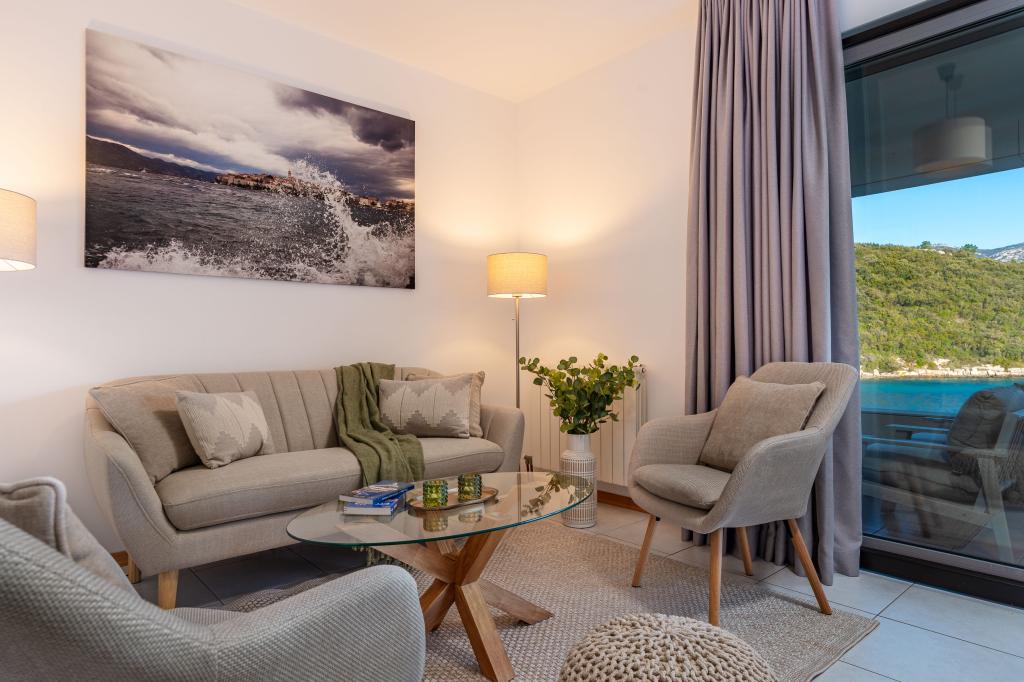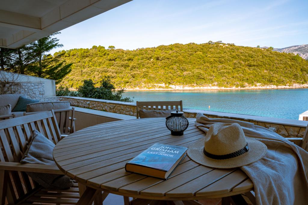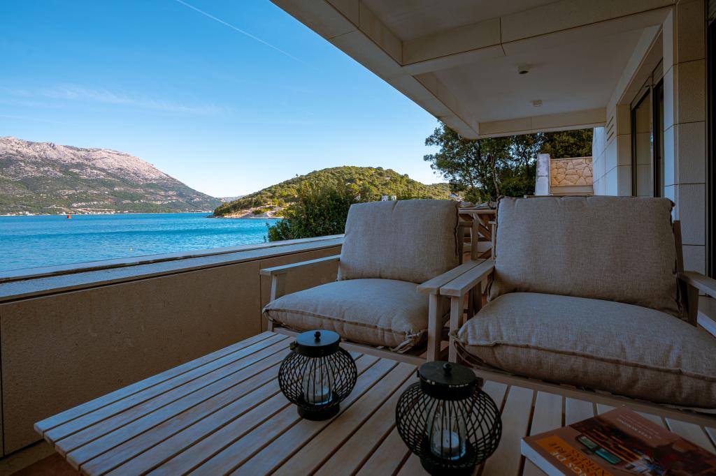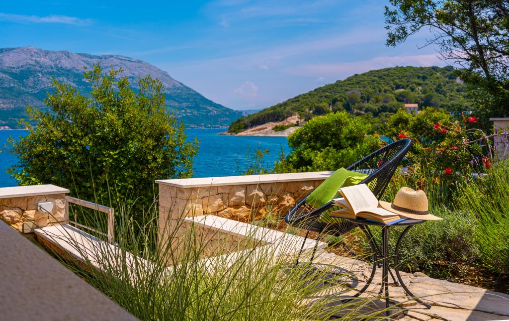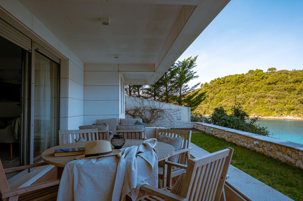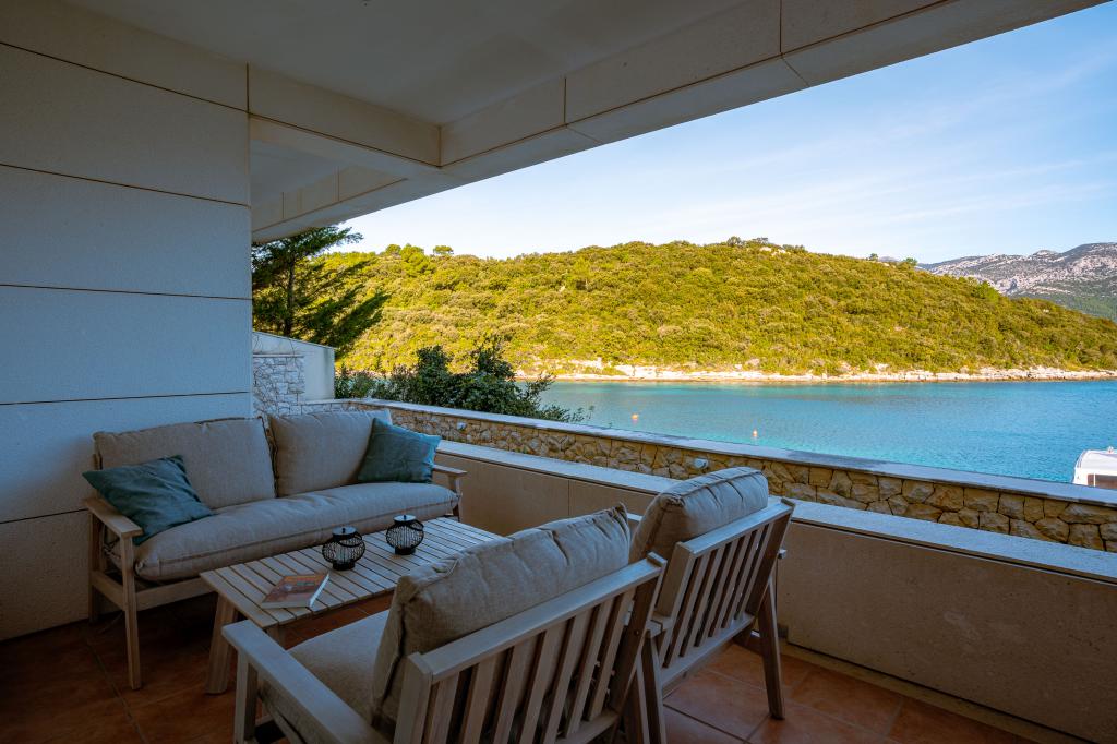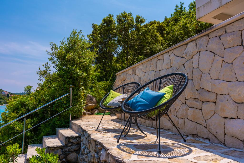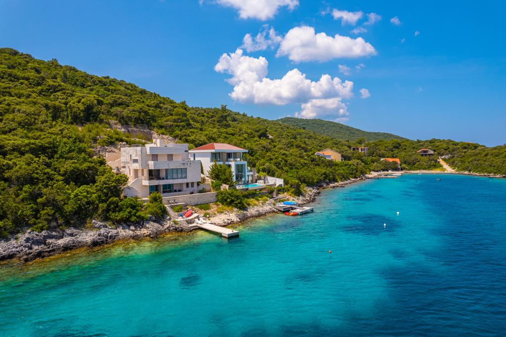 Villa Avantgarde - apartament bezpośrednio nad morzem dla 4 osób - bardzo cicha zatoka - wyspa Korčula - Chorwacja Jest dziełem znanego chorwackiego i światowej sławy architekta. Położony jest w spokojnej zatoce, ok. 4 km od centrum miasta. W willi mają Państwo do dyspozycji komfortowe mieszkanie o powierzchni ok. 100 m2, na który składają się 2 sypialnie, łazienka oraz salon z dobrze wyposażoną kuchnią, jadalnią i salonem, z którego jest wyjście na przestronny taras z bezpośrednim wyjściem na prywatną plażę. Plaża znajduje się 9 m od apartamentu. W Willi jest tylko jedno mieszkanie do wynajęcia. Jest otoczony zadbanymi trawnikami, zielenią, śpiewem ptaków i morzem. Do dyspozycji gości jest zamknięty prywatny parking. Sypialnia, pokój dzienny, jadalnia i taras wychodzą bezpośrednio na morze. Można z niego korzystać przez cały rok, gdyż wyposażony jest w centralne ogrzewanie.