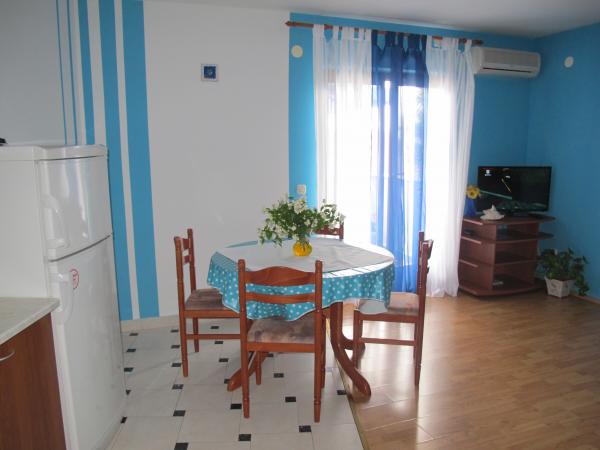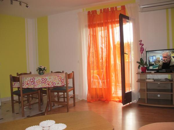 Apartamenty znajdują się w spokojnej części miasta, 10 minut spacerem od centrum i zaledwie 2 minuty od plaży. Składają się z korytarza, łazienki, sypialni dwuosobowej, przestronnego salonu z dodatkowym łóżkiem dla dwóch osób oraz kuchni. Z tarasu apartamentu nr 1 roztacza się widok na morze, a z tarasu apartamentu nr 2 wyjście do ogrodu. Apartamenty są wyposażone we wszystko, czego potrzeba do przyjemnego pobytu. Jesteśmy do Państwa dyspozycji 24 godziny na dobę. Każdy apartament posiada bezpieczne miejsce parkingowe.