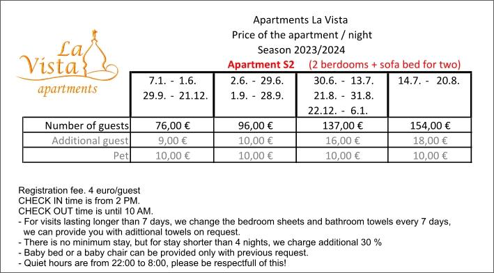 Czytaj więcej KwaterWszelkie zapytania i rezerwacje prosimy kierować na adres e-mail. Rejestracja gości - 4,00 EUR / od osoby. Podatek ekologiczny - 0,15 EUR osoba/dzień, dzieci do 12 lat nie płacą podatku ekologicznego. Dla gości przebywających krócej niż 4 noce cena noclegu wzrasta o 30%. Sprzątanie końcowe apartamentu i podatek pobytowy (turystyczny) są wliczone w cenę zakwaterowania.