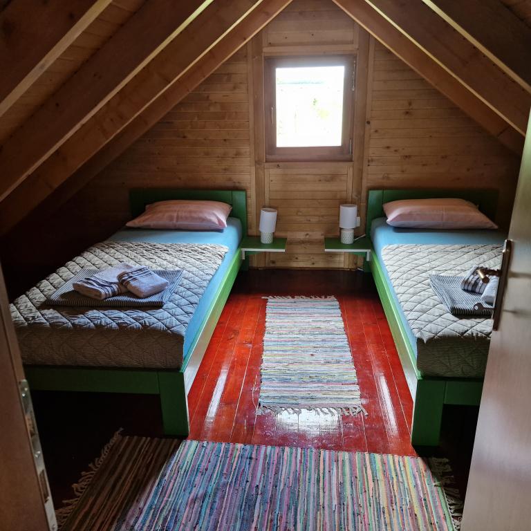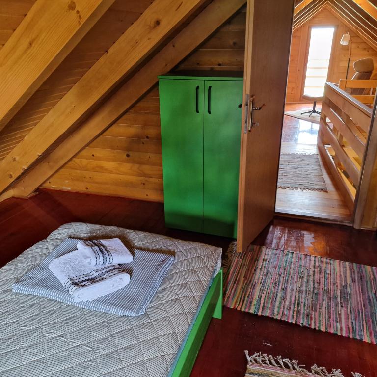 Drewniany dom na wakacje na łonie natury, położony w małej, słabo zaludnionej slawońskiej wiosce. Idealny na ucieczkę od codziennych obowiązków i prawdziwy wypoczynek przy śpiewie ptaków i codziennej wizycie zakochanej pary. Dom składa się z parteru z sypialnią, kuchnią, salonem, łazienką i dużym zadaszonym tarasem. Na piętrze otwarta galeria z miejscem do czytania i wypoczynku z widokiem na jezioro oraz sypialnia z dwoma łóżkami. W domu znajduje się również sad mieszany z kilkudziesięcioma drzewami różnych owoców i jagód, z których goście mogą korzystać, gdy w ogrodzie jest coś (możliwa opcja to zbieranie ich na własne potrzeby, robienie domowej marmolady z owoców z ekologicznych upraw i wziąć na pamiątkę). Kilometry ścieżek przyrodniczych otwarte przed gościem, odpowiednie do jazdy na rowerze, spacerów, zwiedzania. Okoliczne atrakcje są łatwo dostępne, a dom jest idealną bazą wypadową do odkrywania Slawonii.
