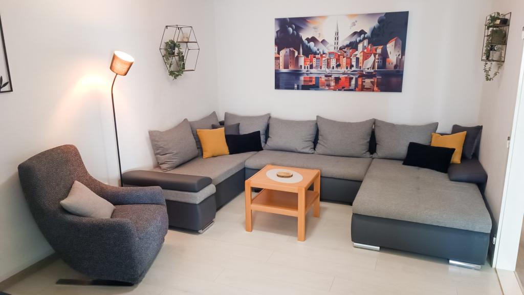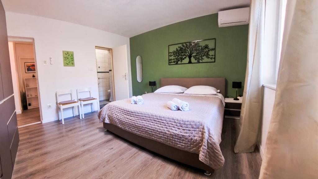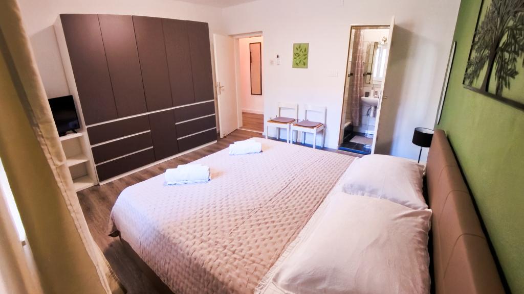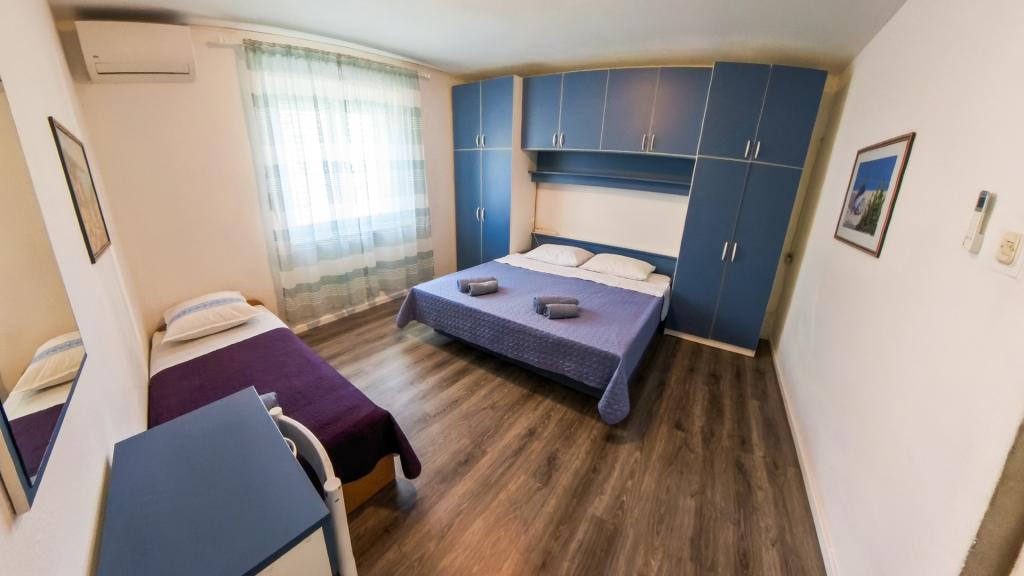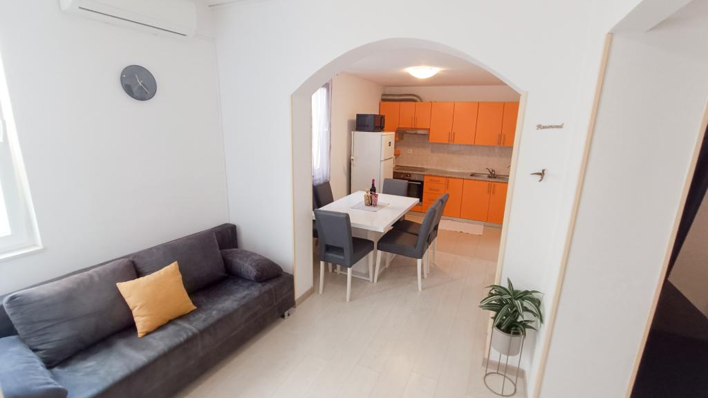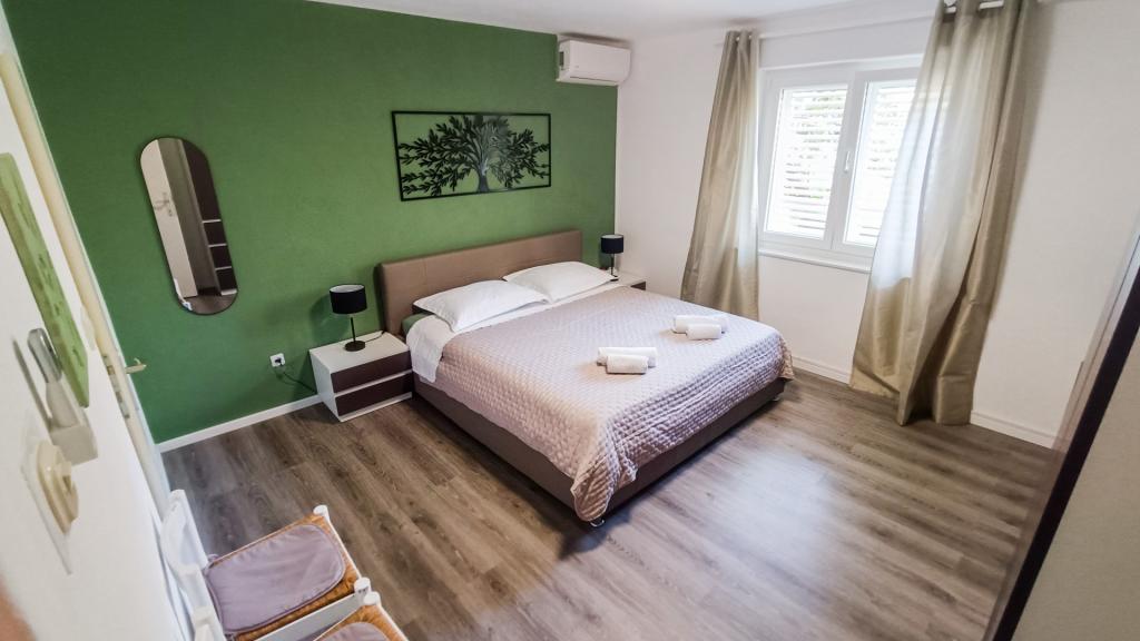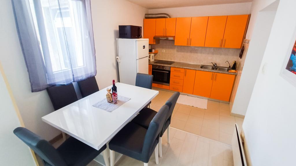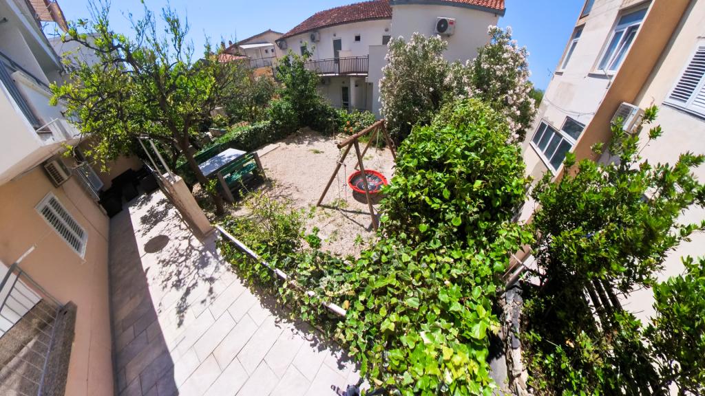 Apartament 5+4 jest idealny dla rodzin z dziećmi. Posiada dwie sypialnie (jedna dla 2 i jedna dla 3 osób), dwie rozkładane sofy w salonie, 3 łazienki, kuchnię oraz duże podwórko z miejscem do siedzenia, grillem i placem zabaw dla dzieci. Mniejsze mieszkania i pokoje w budynku przystosowane są dla 2 do 3 osób. Obiekt oddalony od plaży do 5 minut spacerkiem i 10 minut do centrum.