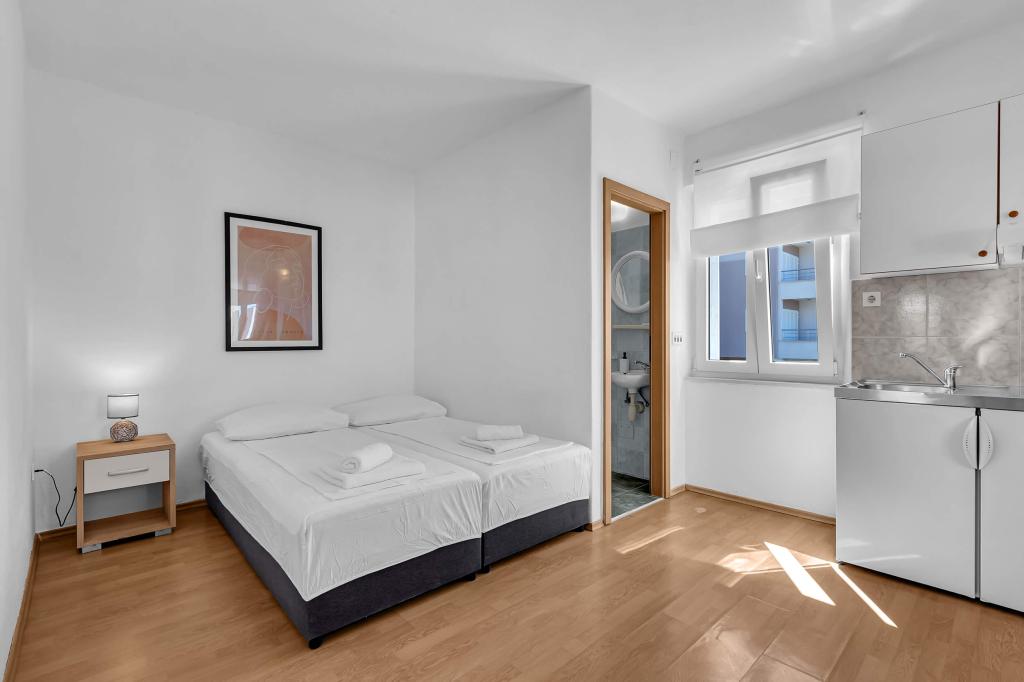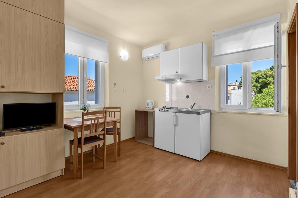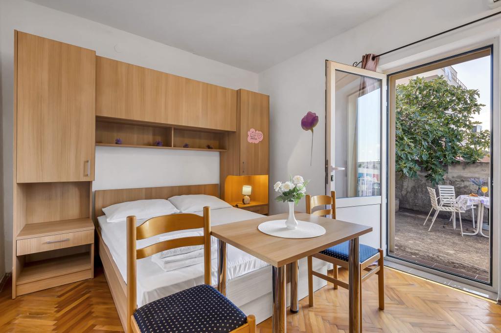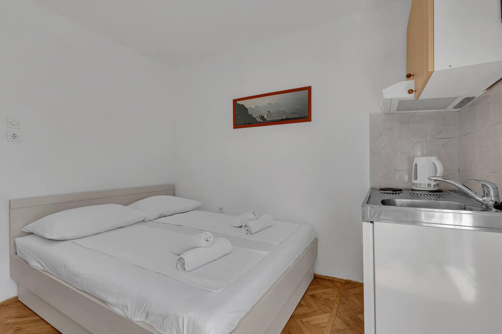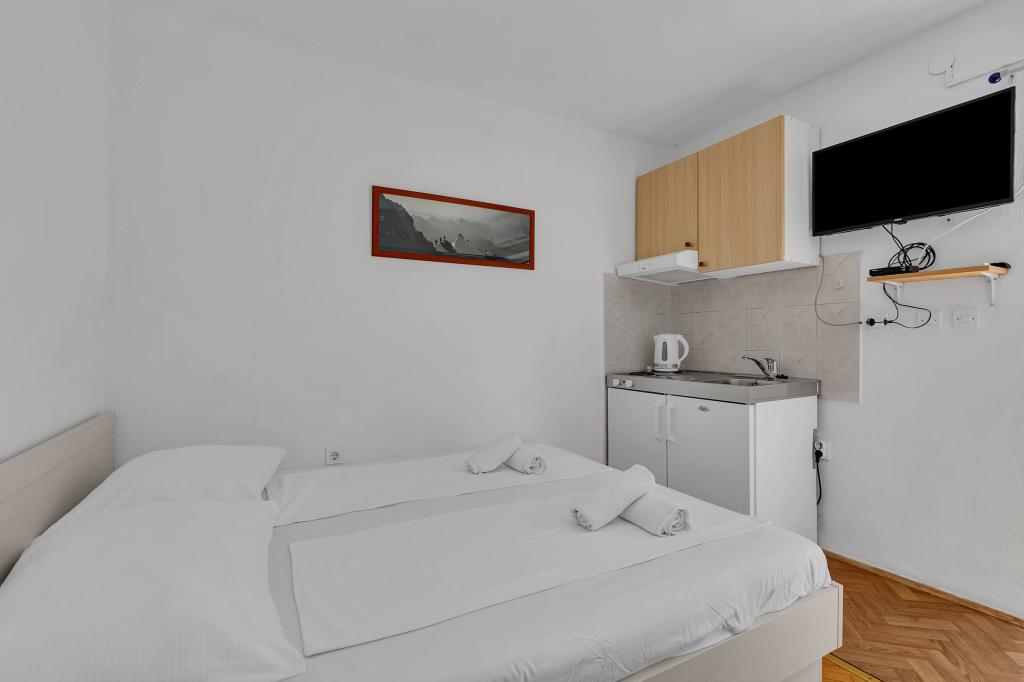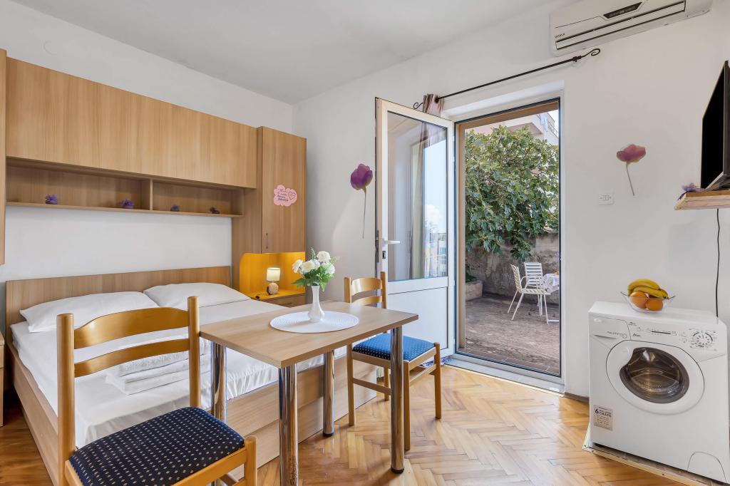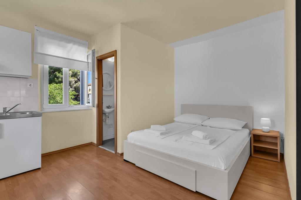 Dom z 4 apartamentami typu studio. Położony blisko wszystkich głównych udogodnień, głównego placu 300 m, rynku 300 m, plaży 700 m, głównej promenady (riva 350m).
